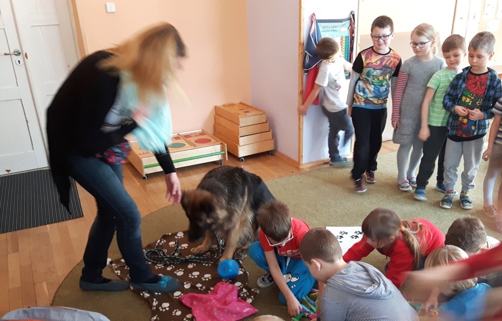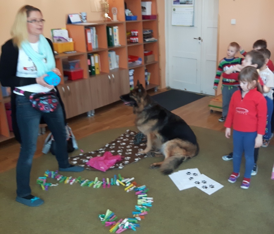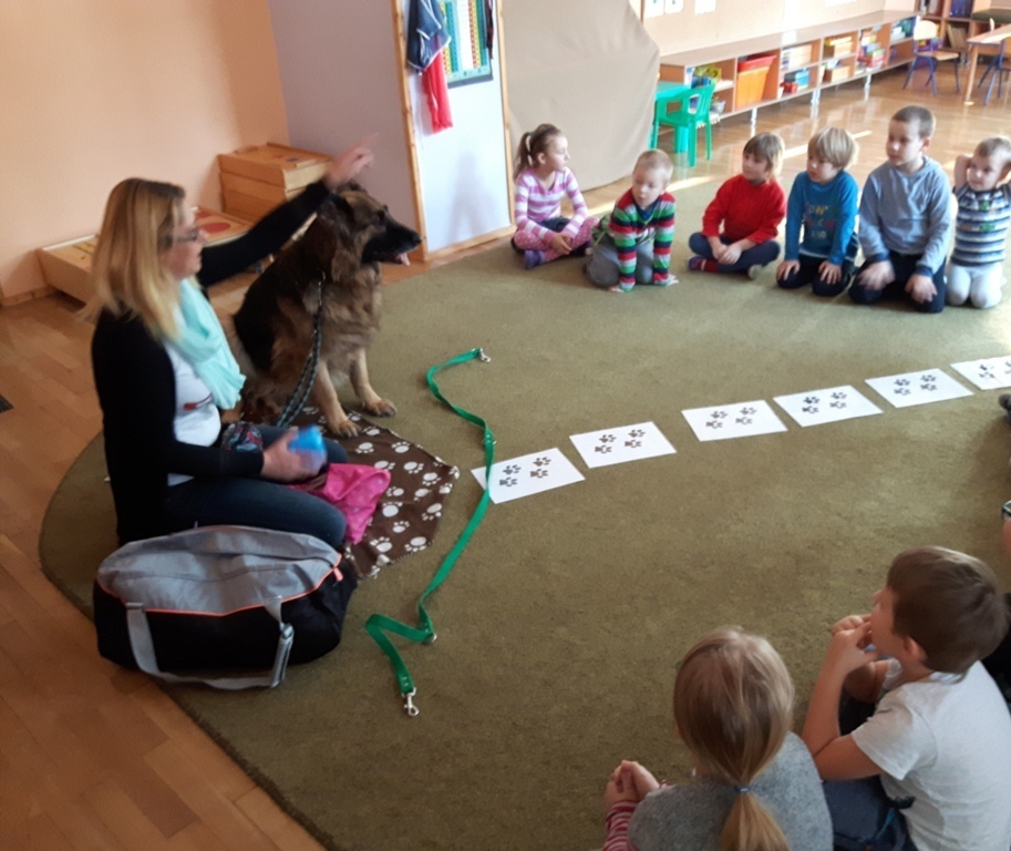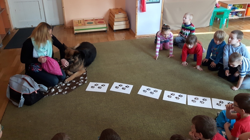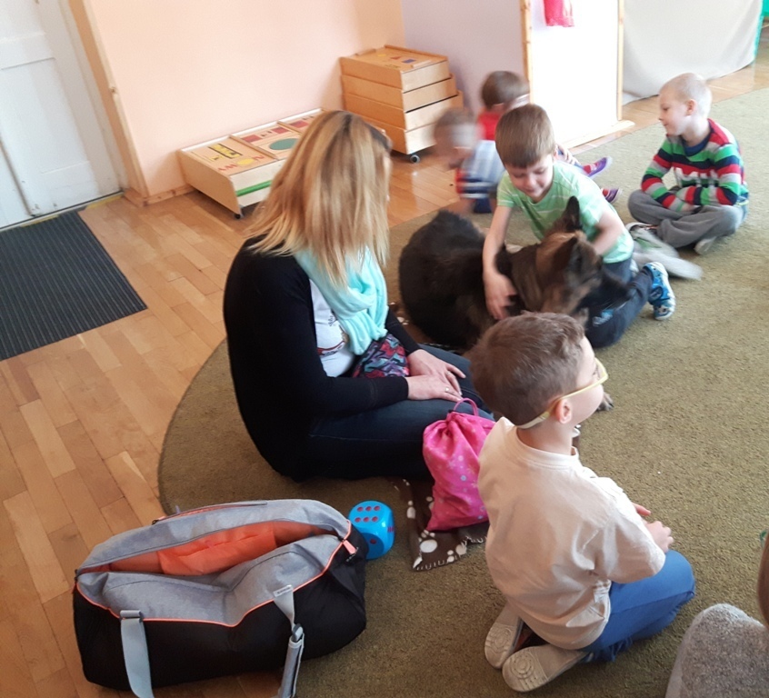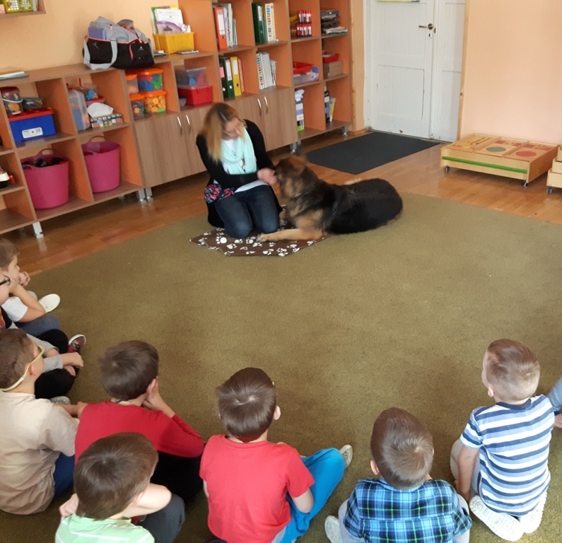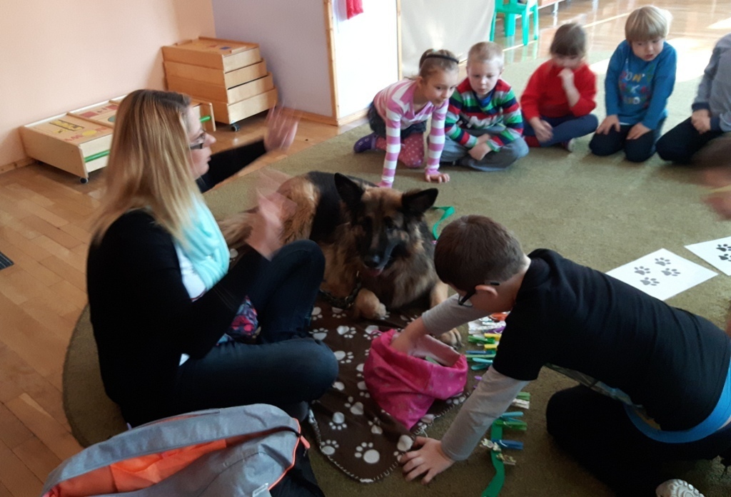 Zuchowa zabawa z Wandzią – psem terapeutą, to nowe ulubione zajęcie starszaków. Po przywitaniu, każde z dzieci miało za zadanie – przypomnienie zasad bezpieczeństwa na zajęciach z psem (zachowanie ciszy oraz zakaz dotykania i zbliżania się do psiego grona). Następnie Wandzia wraz ze swoją Pania zaproponowały zabawę w zdobieniu smyczy spinaczami. Jednak żeby nie było zbyt łatwo, każdy z Zuchów mógł przypinać tyle spinaczy ile wyrzucił uprzednio oczek na kostce. Więc prócz dobrej zabawy Zuchy miały możliwość doskonalenia umiejętności liczenia w zakresie do 6. Po zakończeniu zabawy z Wandzią dzieci mogły pogłaskać Wandzię i poprzytulać się do niej.