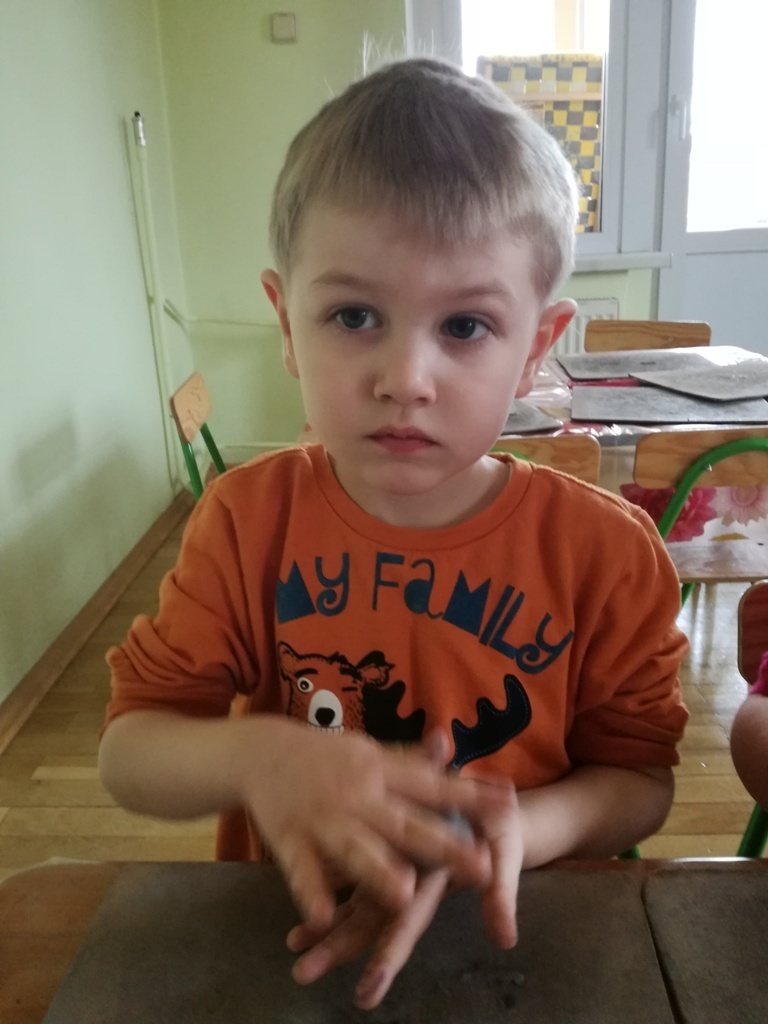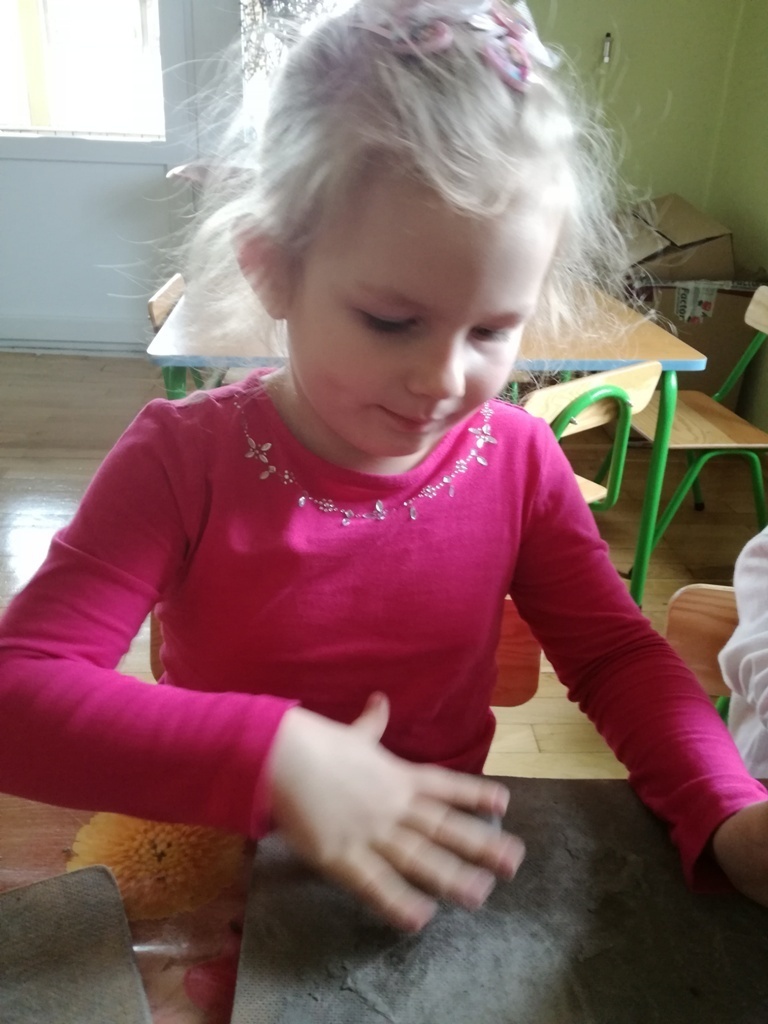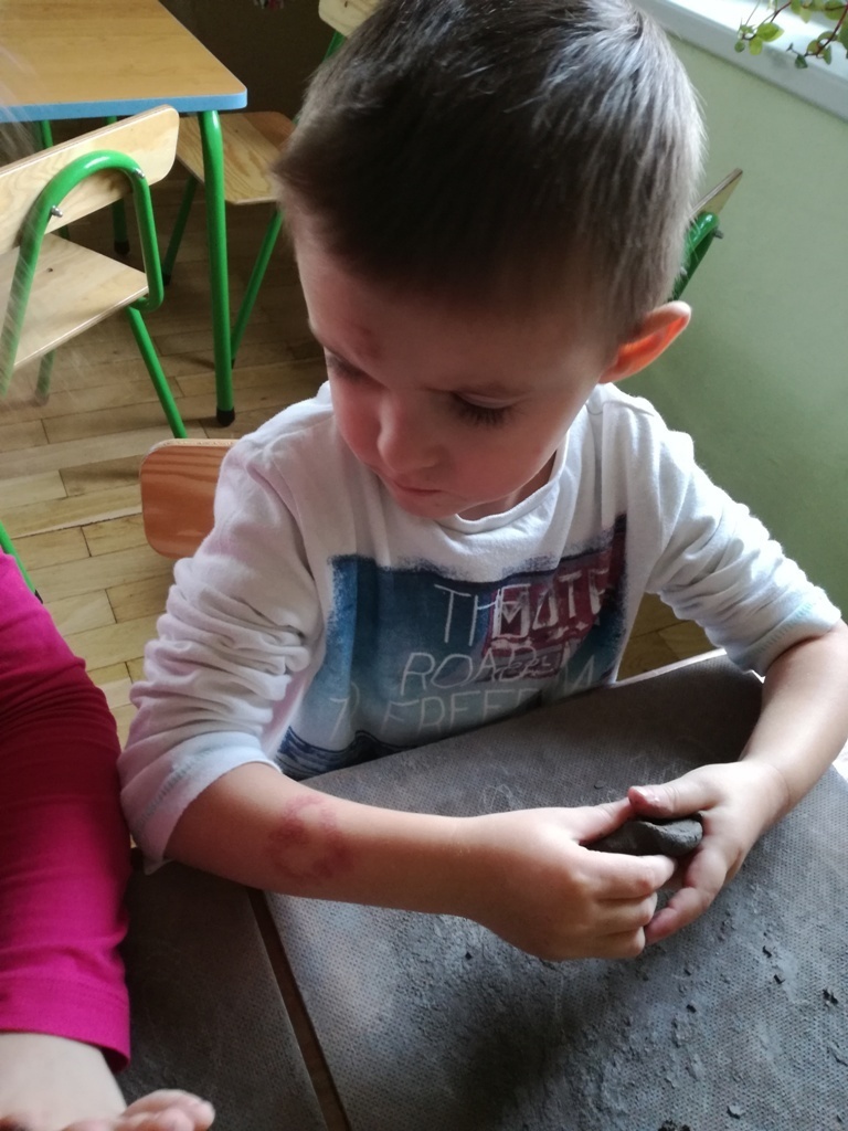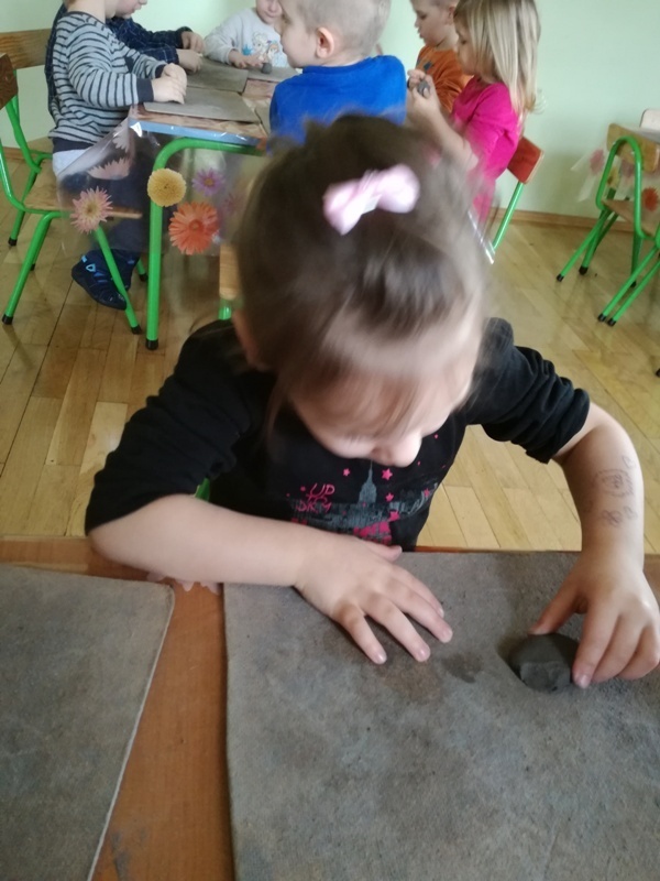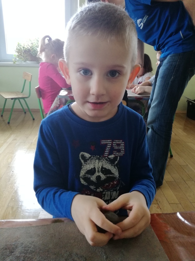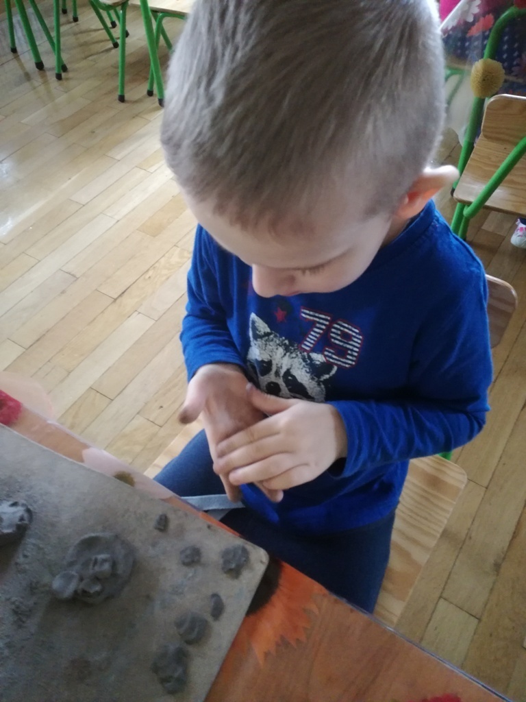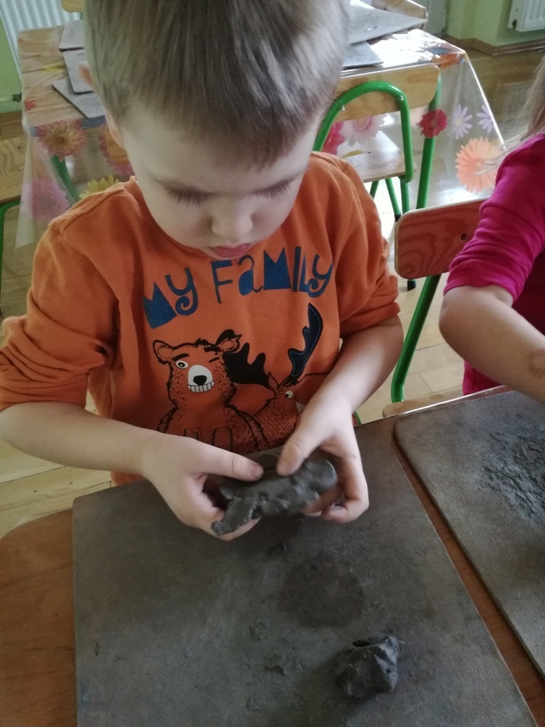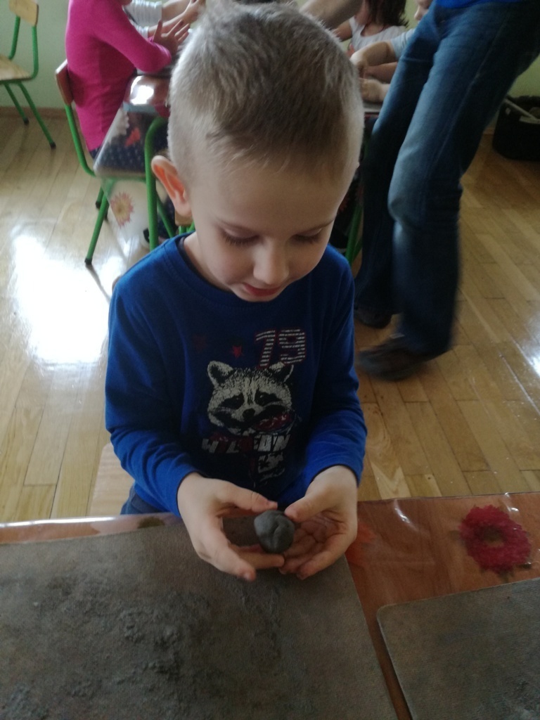 Pan Rafał zademonstrował nam jak wykonać kwiatka z gliny. Najbardziej spodobało nam się ugniatanie rączką kulek – które dołączaliśmy do pozostałych płatków, tworząc kwiatek. Powstały wspaniałe, różnorodne kwiatki, pan Rafał pochwalił nasze prace. Bardzo lubimy te zajęcia.