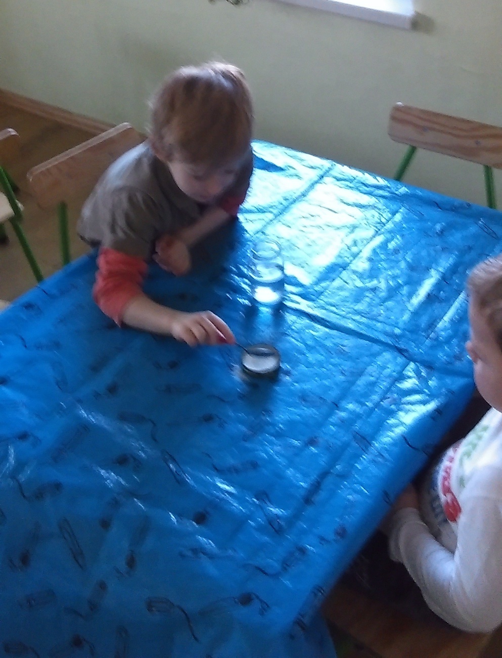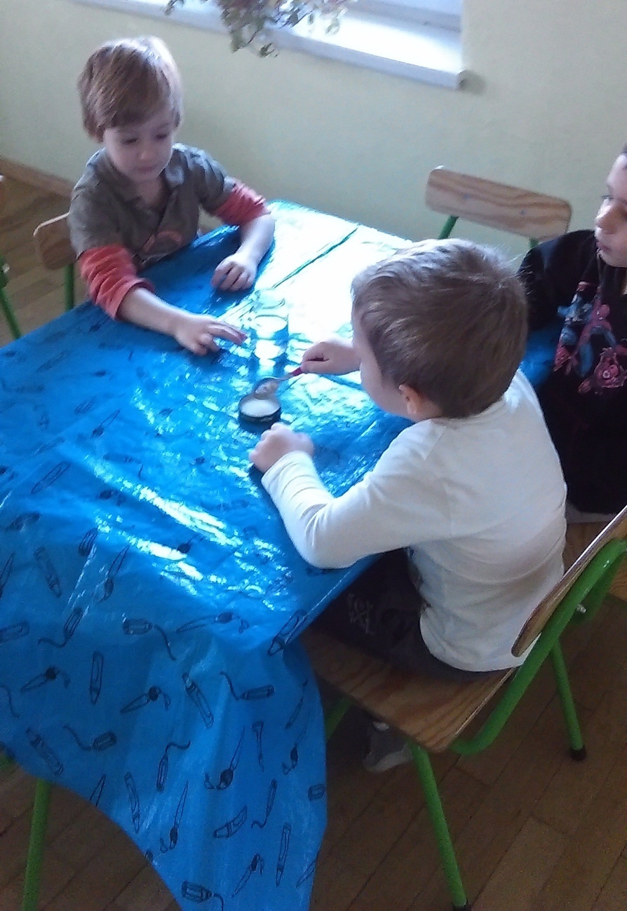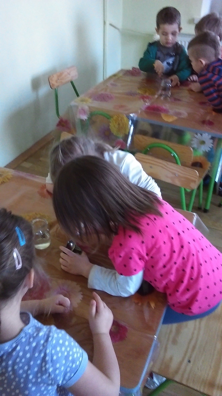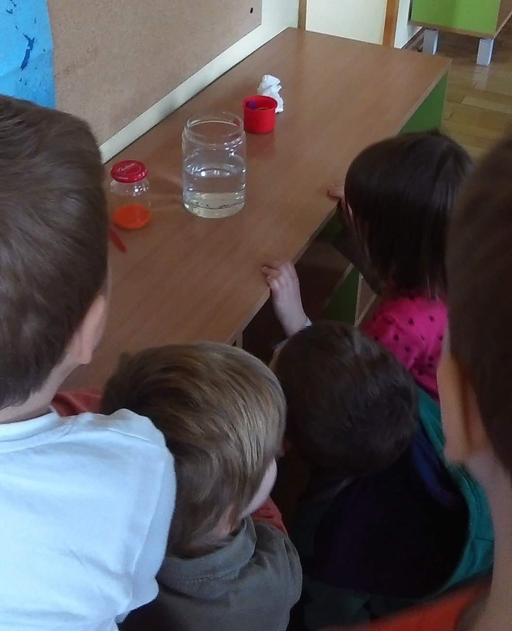 Dzisiaj eksperymentowaliśmy z wodą. Na samym początku pani pokazała nam kilka eksperymentów i wyjaśniła co to wszystko oznacza. Wiemy już, że w ciepłej wozie barwnik szybciej się rozejdzie, że jest coś takiego co się nazywa napięcie powierzchniowe wody i jakie owady to wykorzystują. Podczas naszych eksperymentów zamiast owadów na powierzchni wody unosiła się szpilka, Potem sami mogliśmy wykonać eksperyment: sprawdziliśmy co się stanie jak dodamy do wody: cukier, kawę i herbatę, a następnie zapisaliśmy wyniki naszego eksperymentu.
