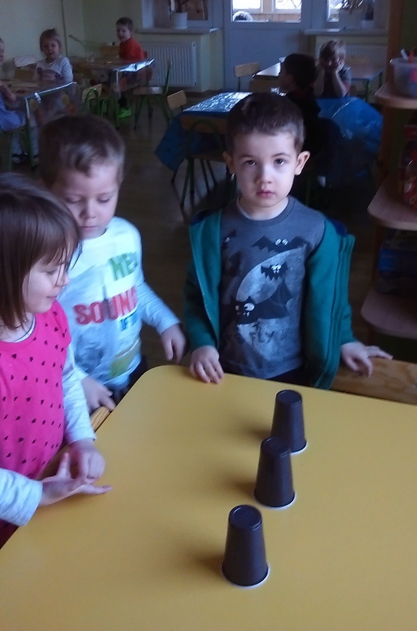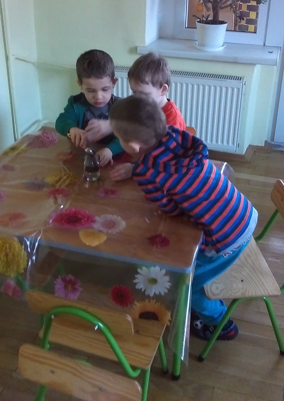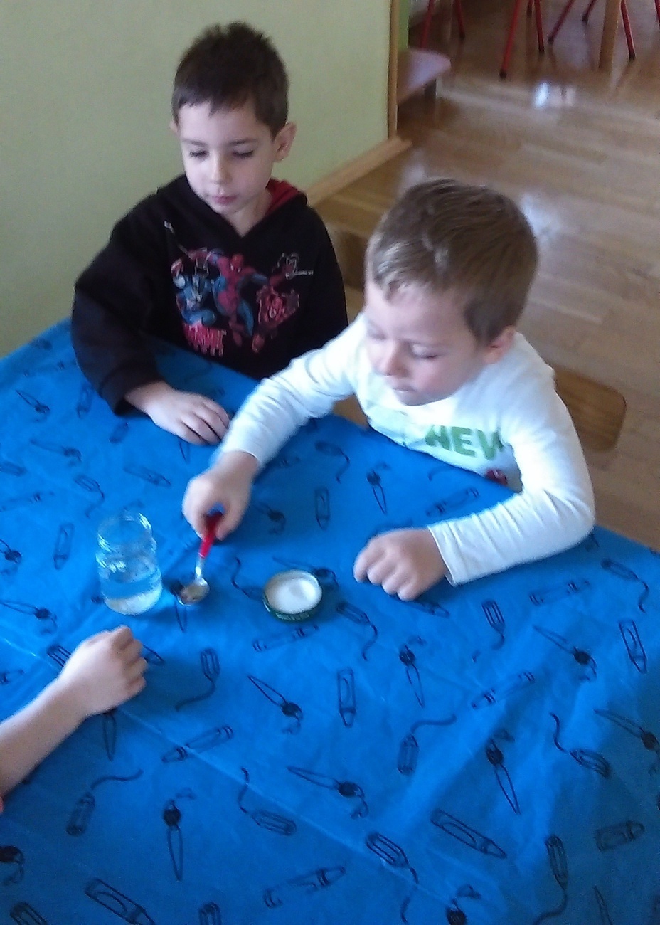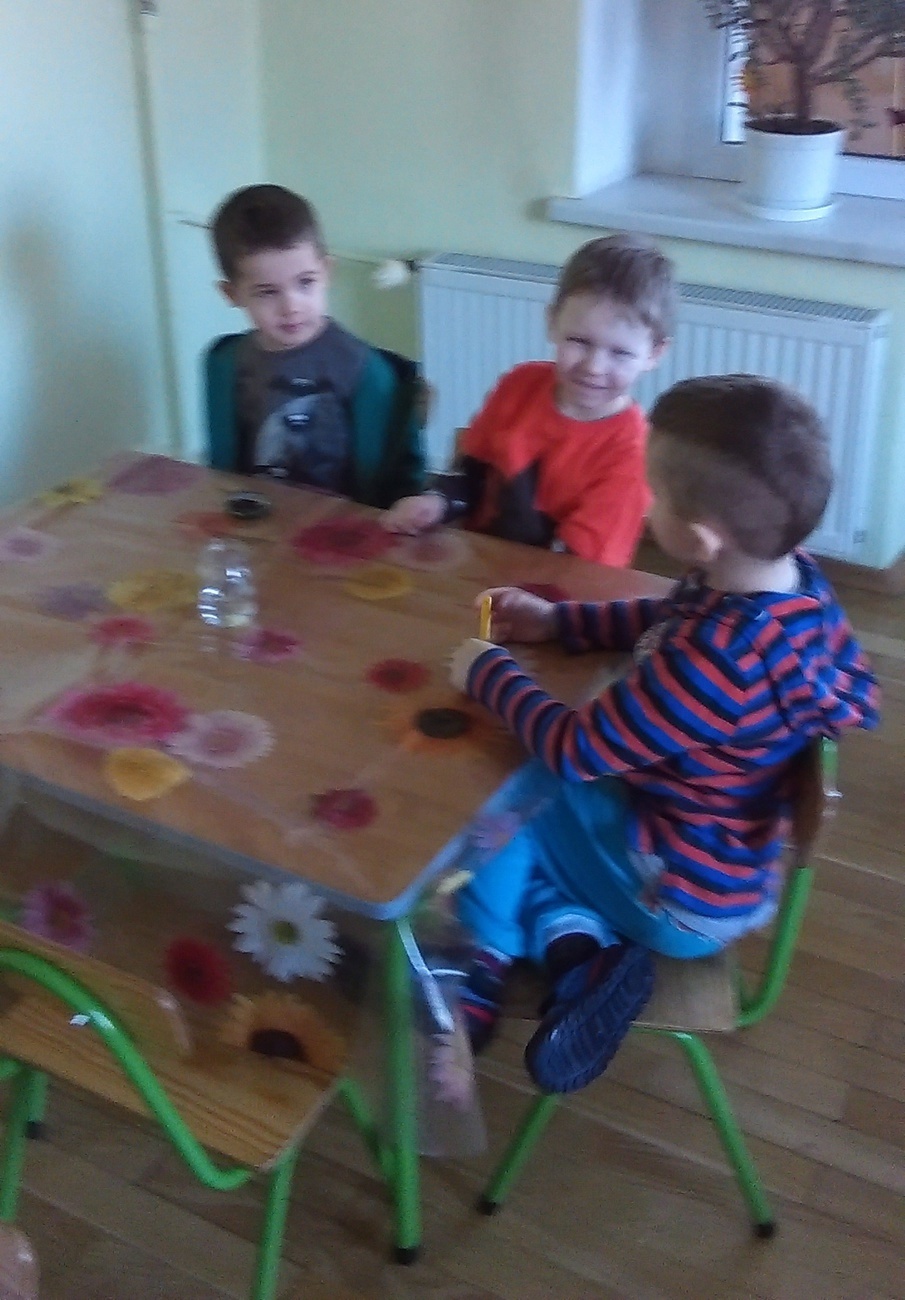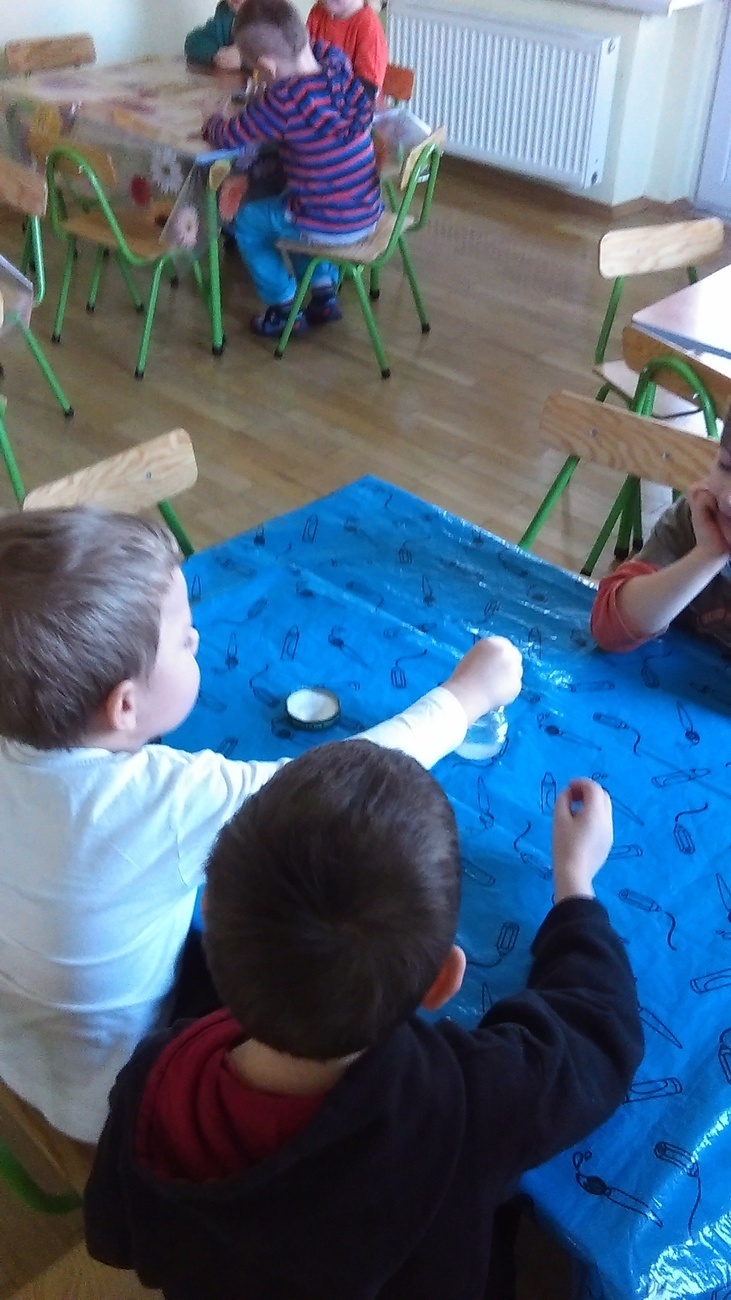 Dzisiaj eksperymentowaliśmy z wodą. Na samym początku pani pokazała nam kilka eksperymentów i wyjaśniła co to wszystko oznacza. Wiemy już, że w ciepłej wozie barwnik szybciej się rozejdzie, że jest coś takiego co się nazywa napięcie powierzchniowe wody i jakie owady to wykorzystują. Podczas naszych eksperymentów zamiast owadów na powierzchni wody unosiła się szpilka, Potem sami mogliśmy wykonać eksperyment: sprawdziliśmy co się stanie jak dodamy do wody: cukier, kawę i herbatę, a następnie zapisaliśmy wyniki naszego eksperymentu.