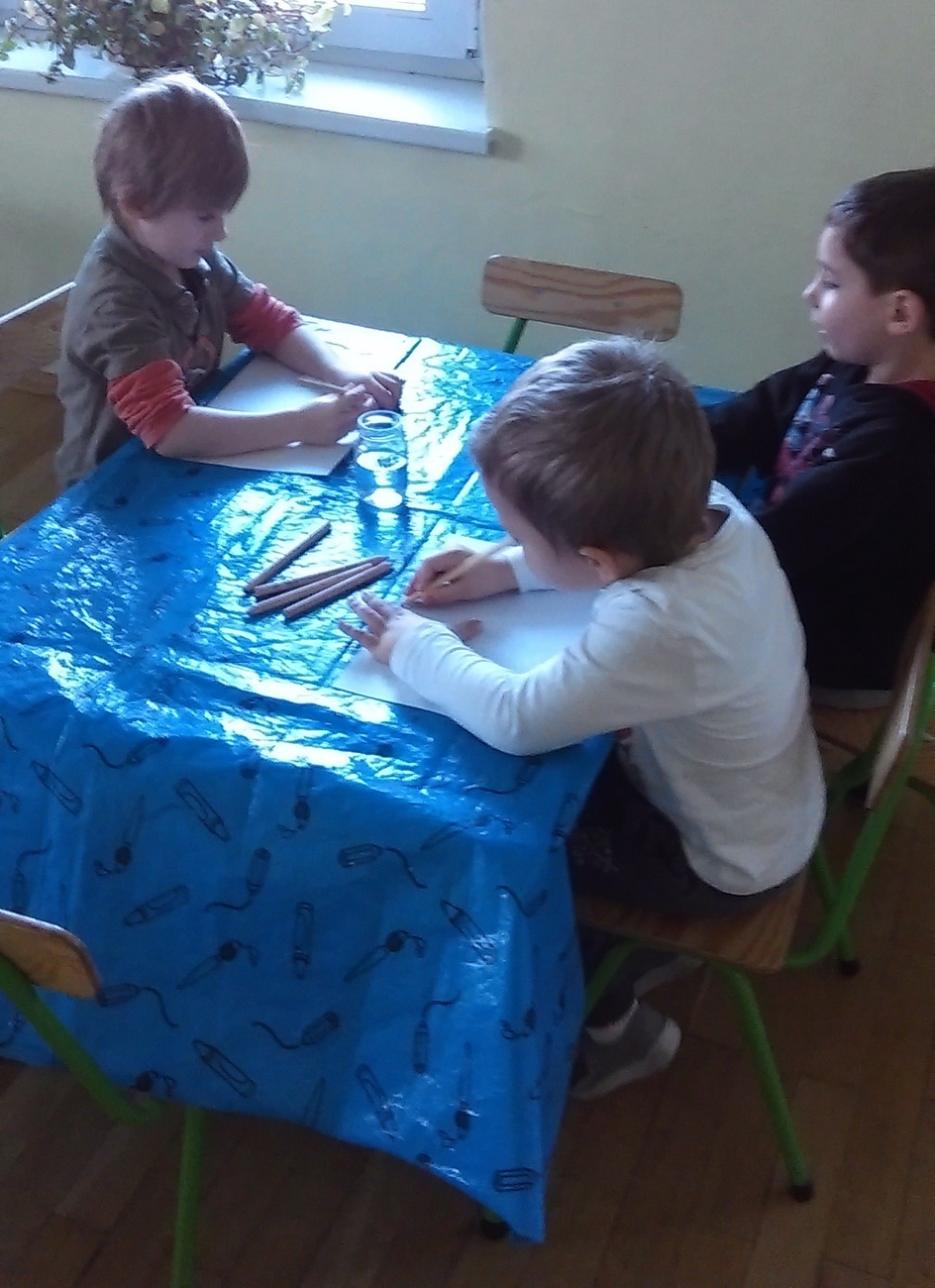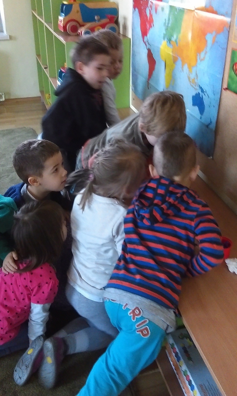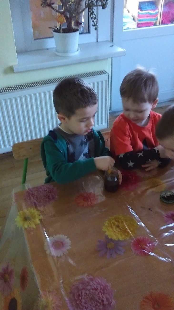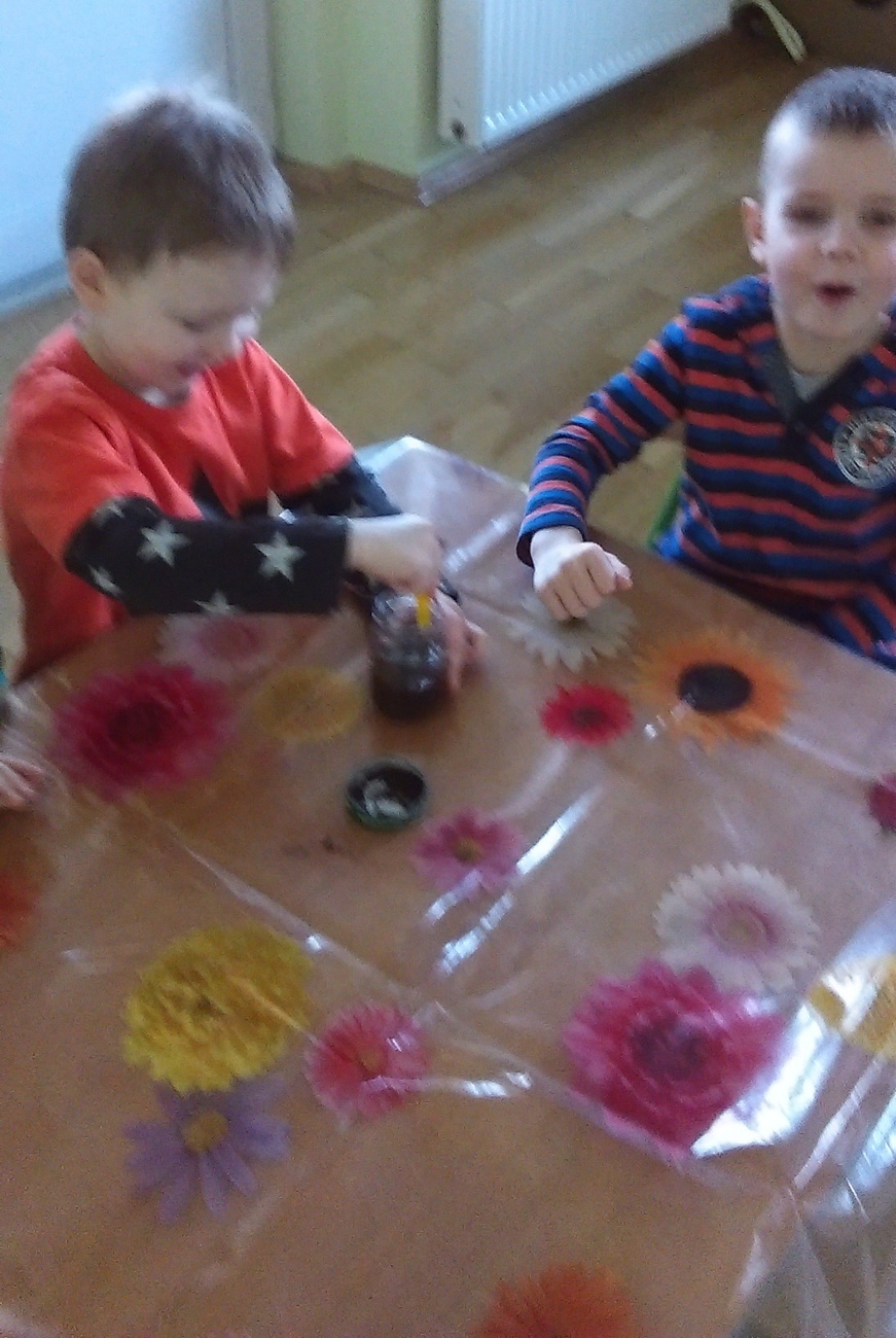 Dzisiaj eksperymentowaliśmy z wodą. Na samym początku pani pokazała nam kilka eksperymentów i wyjaśniła co to wszystko oznacza. Wiemy już, że w ciepłej wozie barwnik szybciej się rozejdzie, że jest coś takiego co się nazywa napięcie powierzchniowe wody i jakie owady to wykorzystują. Podczas naszych eksperymentów zamiast owadów na powierzchni wody unosiła się szpilka, Potem sami mogliśmy wykonać eksperyment: sprawdziliśmy co się stanie jak dodamy do wody: cukier, kawę i herbatę, a następnie zapisaliśmy wyniki naszego eksperymentu.