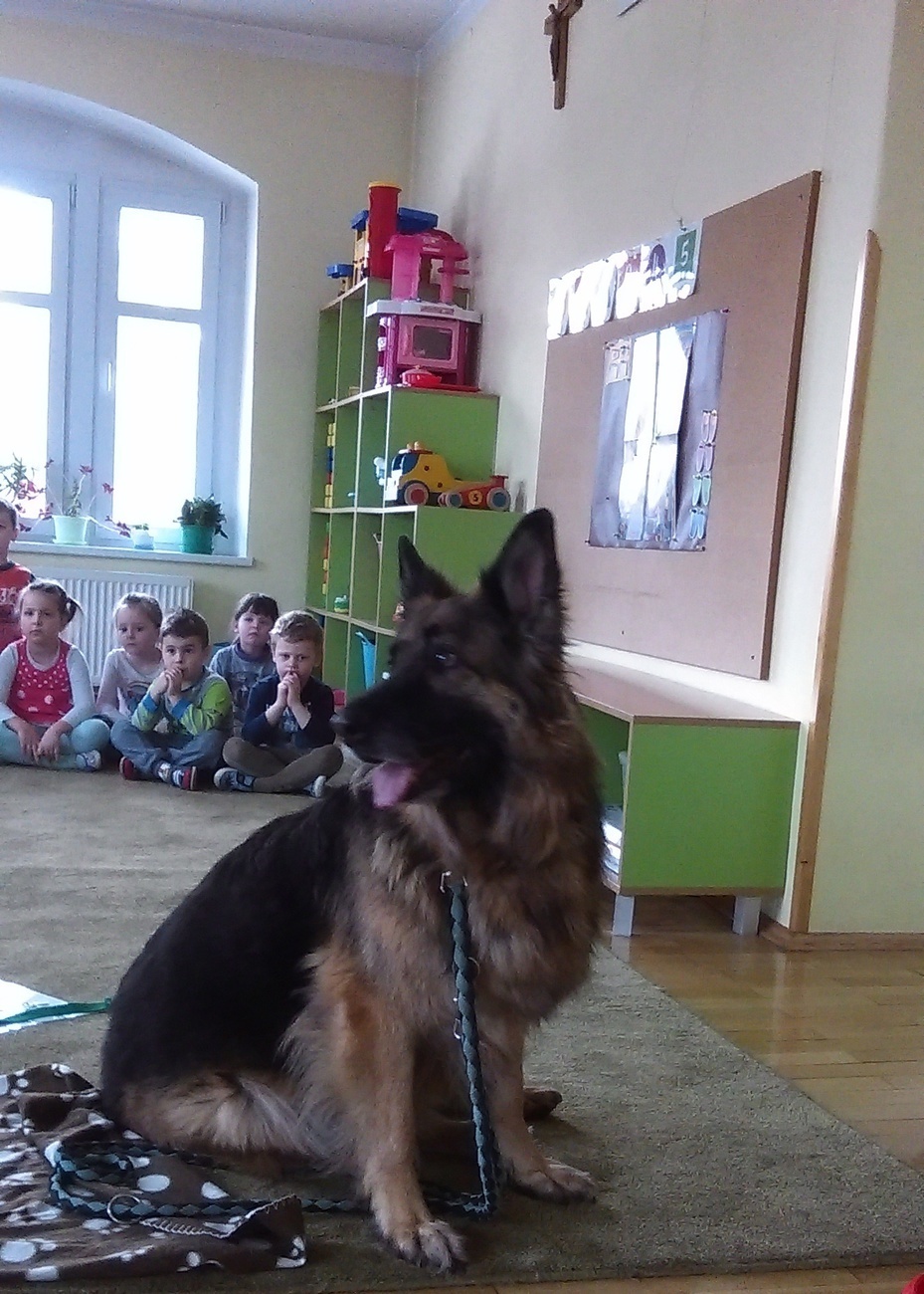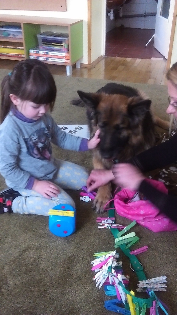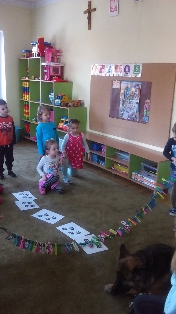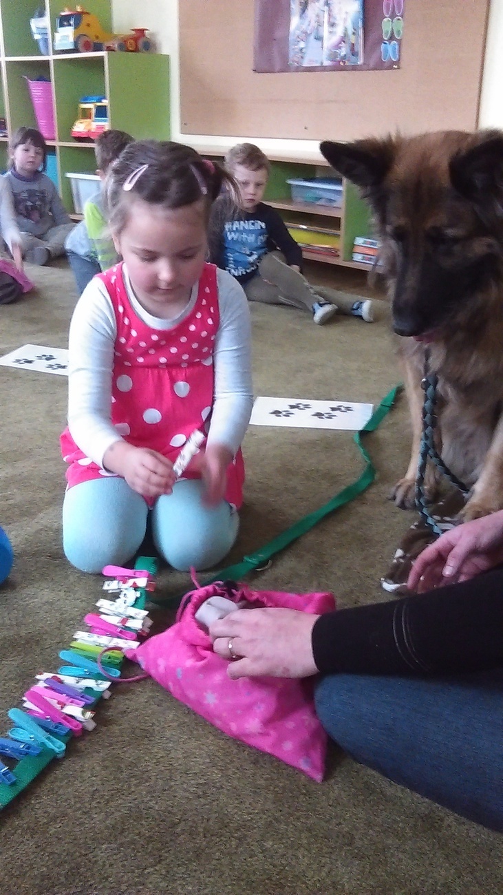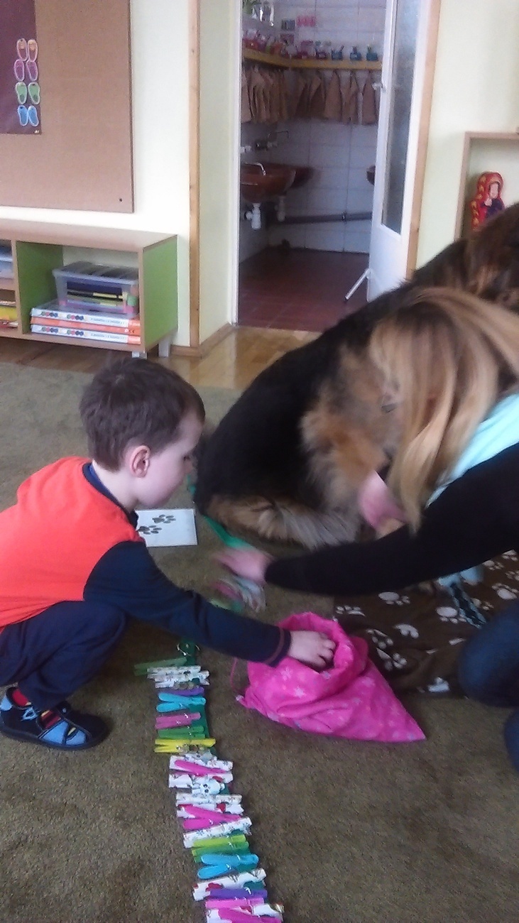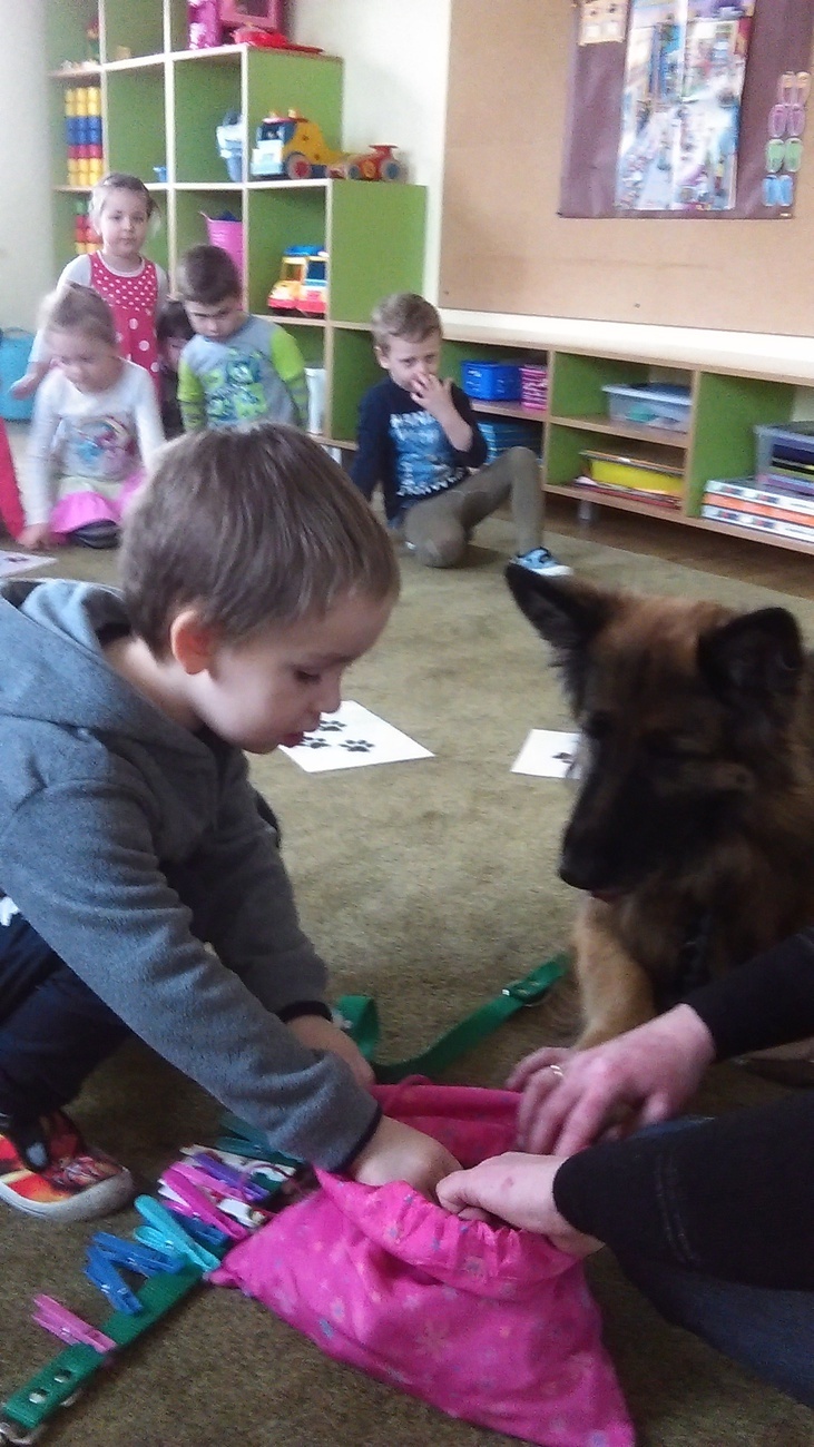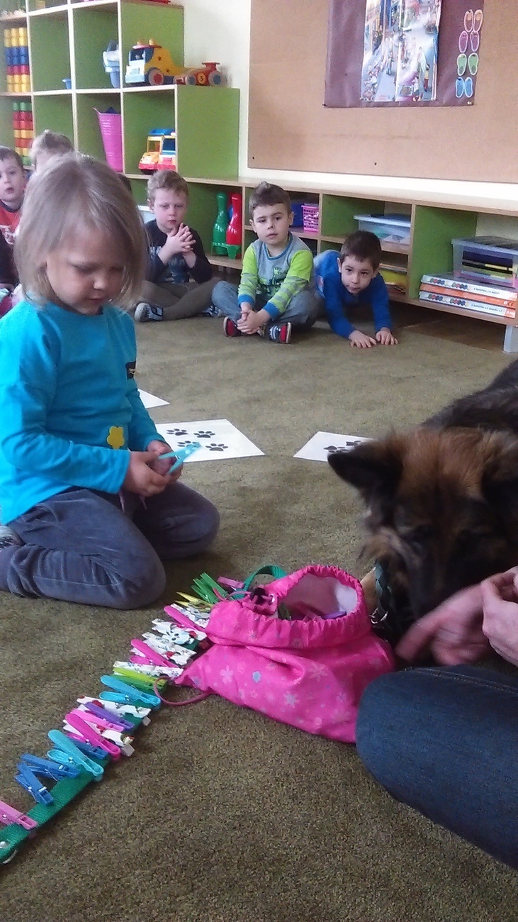 Dziś w przedszkolu mieliśmy wyjątkowego gościa – odwiedziła nas Wandzia. Wandzia to owczarek niemiecki, który przyjeżdża ze swoją opiekunką do naszego przedszkola. Dzisiaj razem z Wandzią trenowaliśmy liczenie. Pani miała dla nas wyjątkowe zadanie – ozdabialiśmy smycz Wandzi. Każdy z nas mógł przypiąć tyle spinaczy ile wskazywały wyrzucane kostką oczka. Na zakończenie wszyscy mogliśmy pogłaskać i przytulić się do Wandzi.