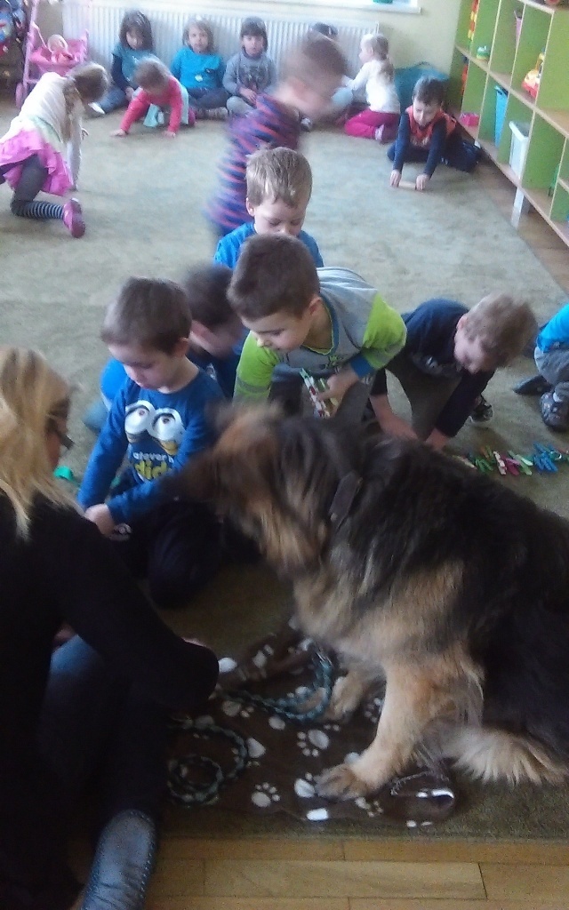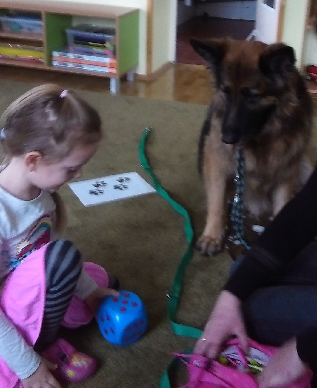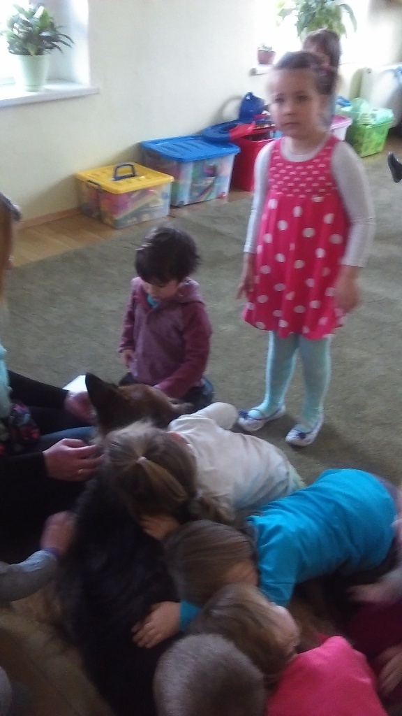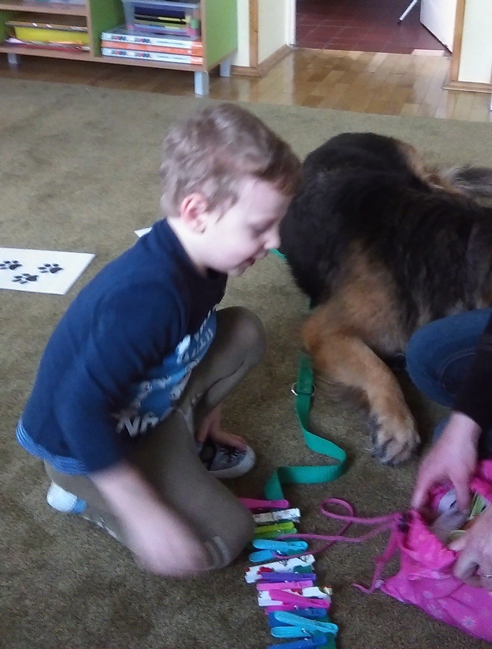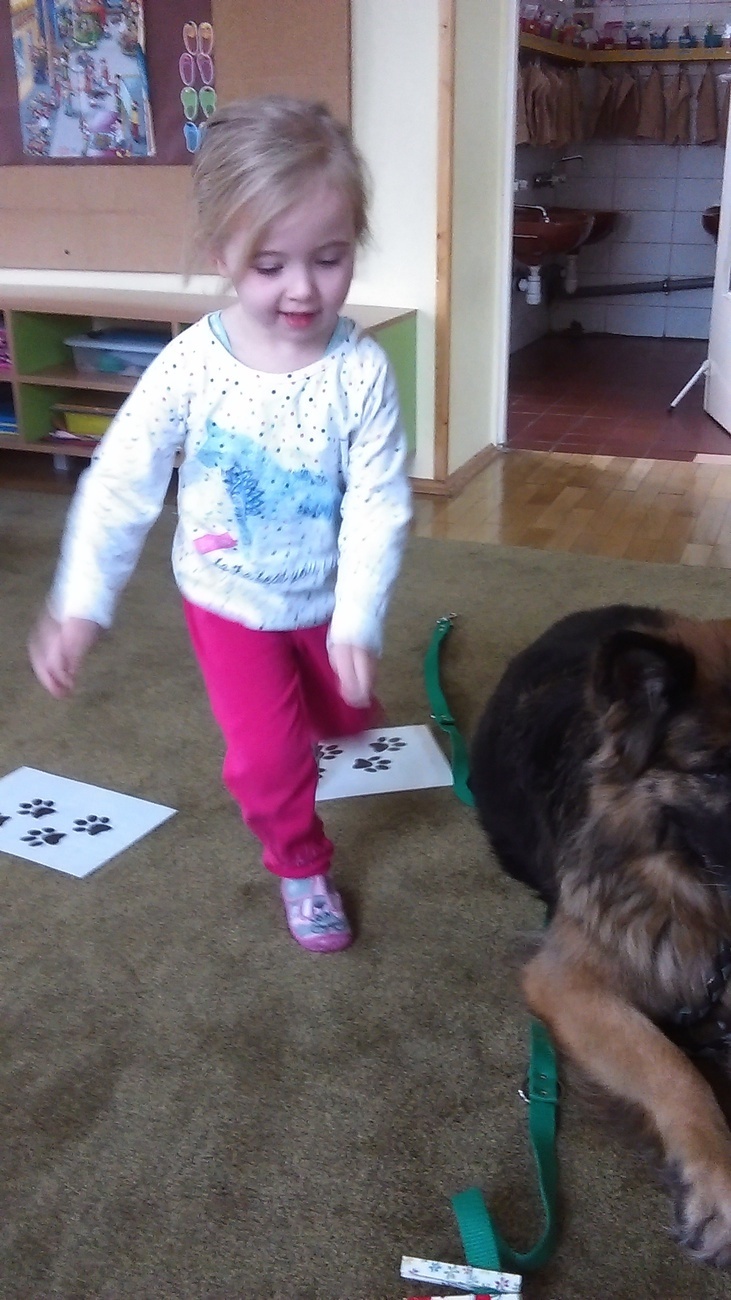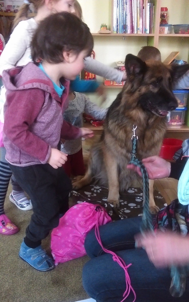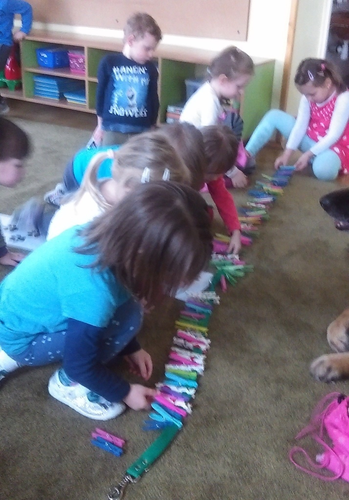 Dziś w przedszkolu mieliśmy wyjątkowego gościa – odwiedziła nas Wandzia. Wandzia to owczarek niemiecki, który przyjeżdża ze swoją opiekunką do naszego przedszkola. Dzisiaj razem z Wandzią trenowaliśmy liczenie. Pani miała dla nas wyjątkowe zadanie – ozdabialiśmy smycz Wandzi. Każdy z nas mógł przypiąć tyle spinaczy ile wskazywały wyrzucane kostką oczka. Na zakończenie wszyscy mogliśmy pogłaskać i przytulić się do Wandzi.