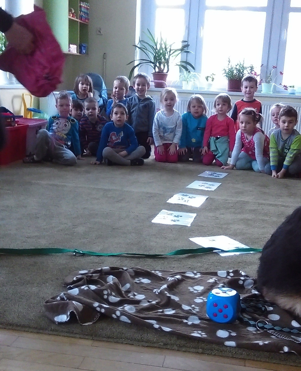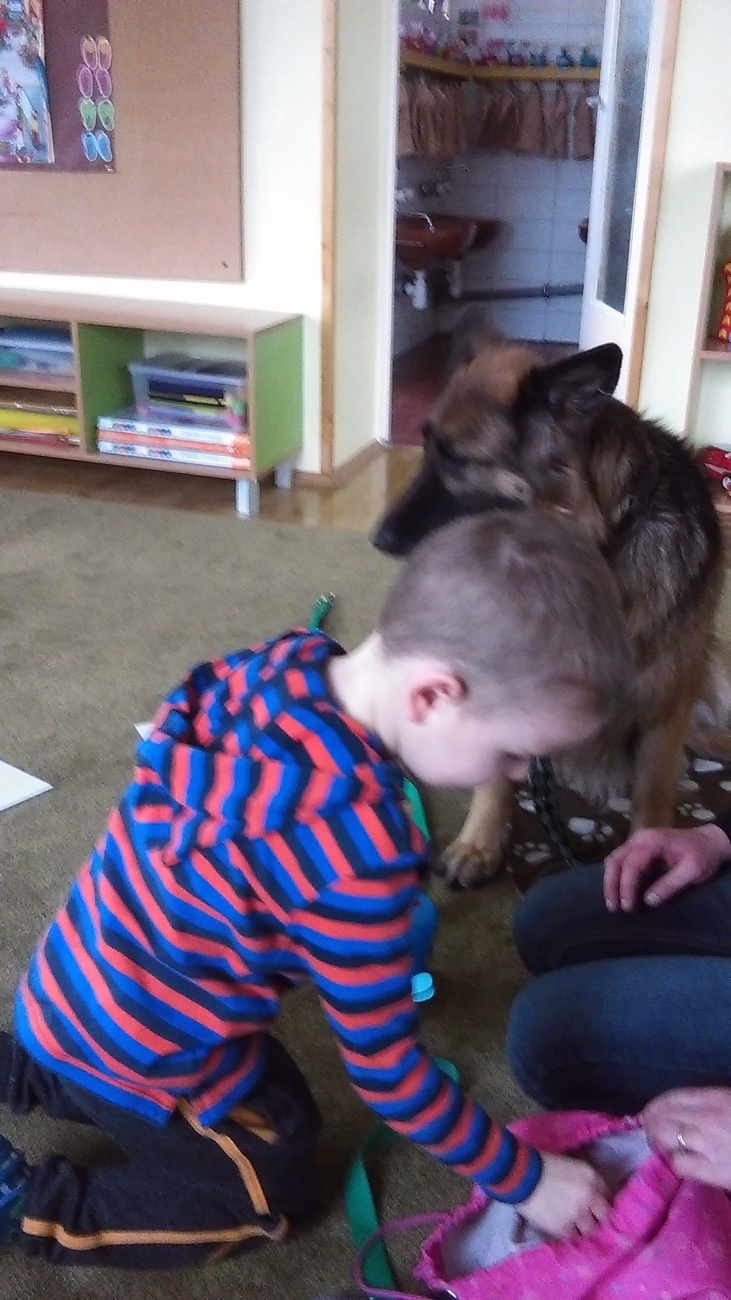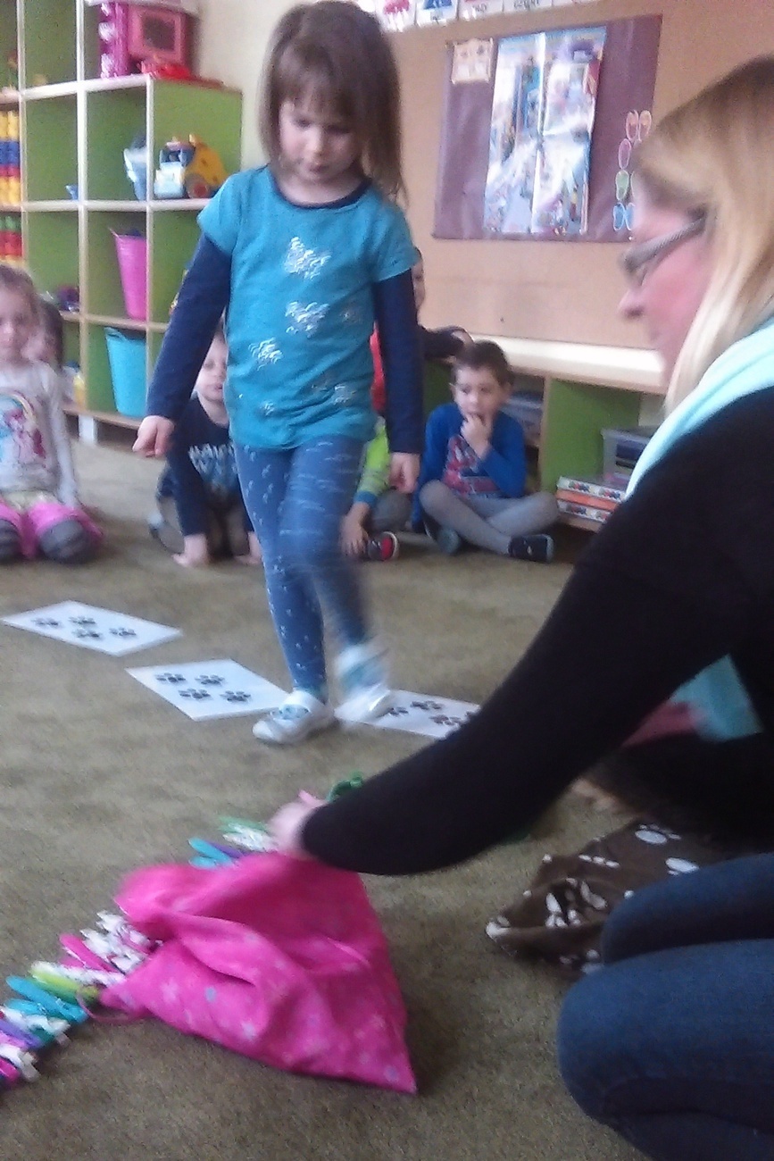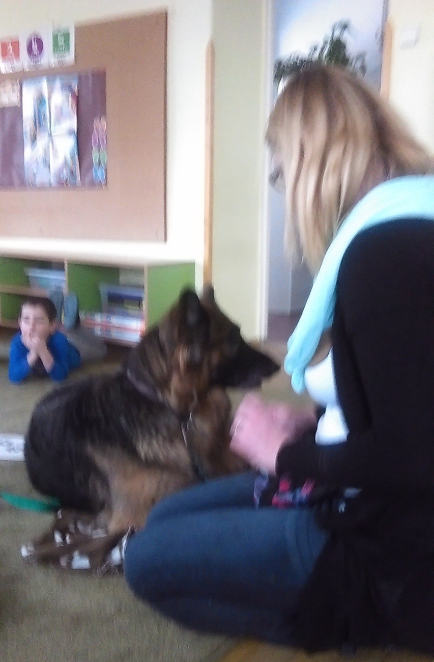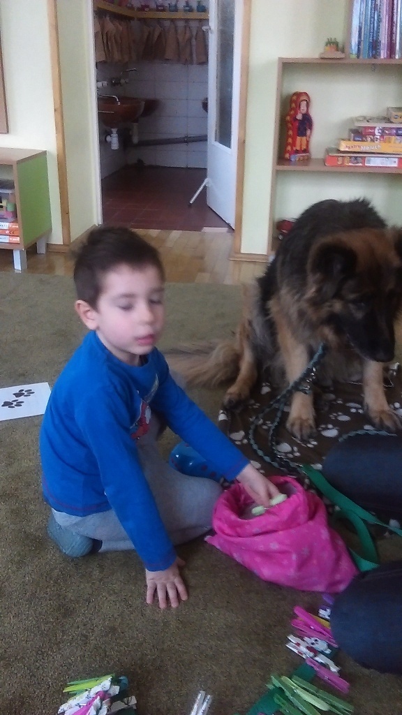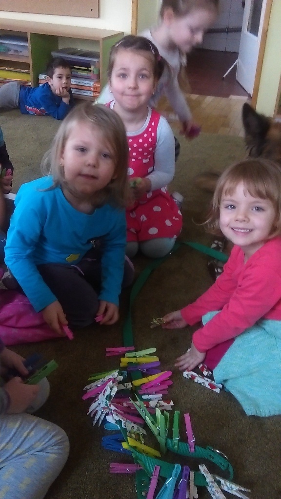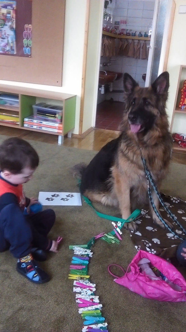 Dziś w przedszkolu mieliśmy wyjątkowego gościa – odwiedziła nas Wandzia. Wandzia to owczarek niemiecki, który przyjeżdża ze swoją opiekunką do naszego przedszkola. Dzisiaj razem z Wandzią trenowaliśmy liczenie. Pani miała dla nas wyjątkowe zadanie – ozdabialiśmy smycz Wandzi. Każdy z nas mógł przypiąć tyle spinaczy ile wskazywały wyrzucane kostką oczka. Na zakończenie wszyscy mogliśmy pogłaskać i przytulić się do Wandzi.