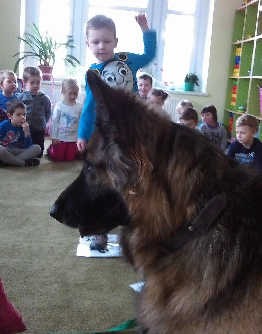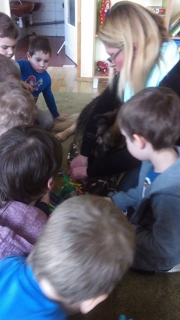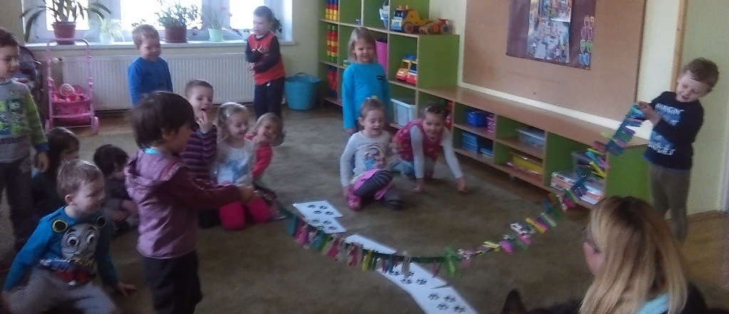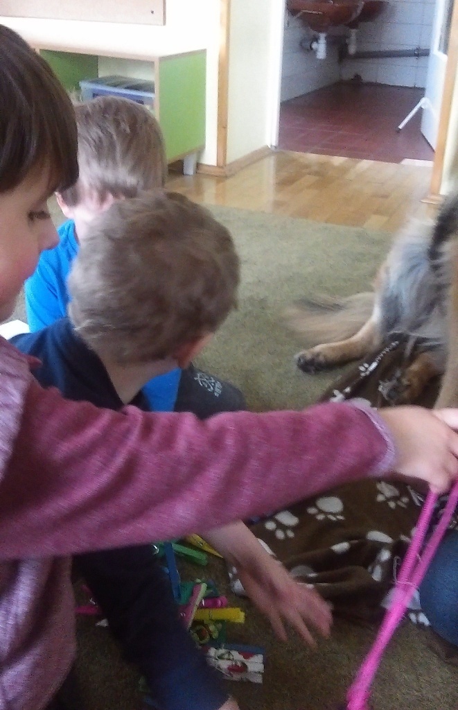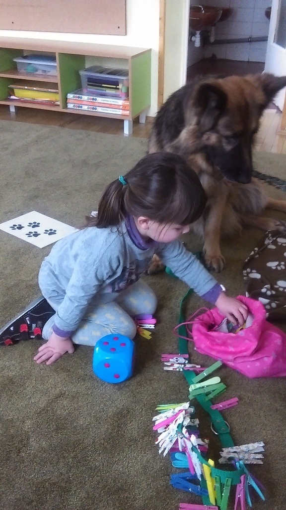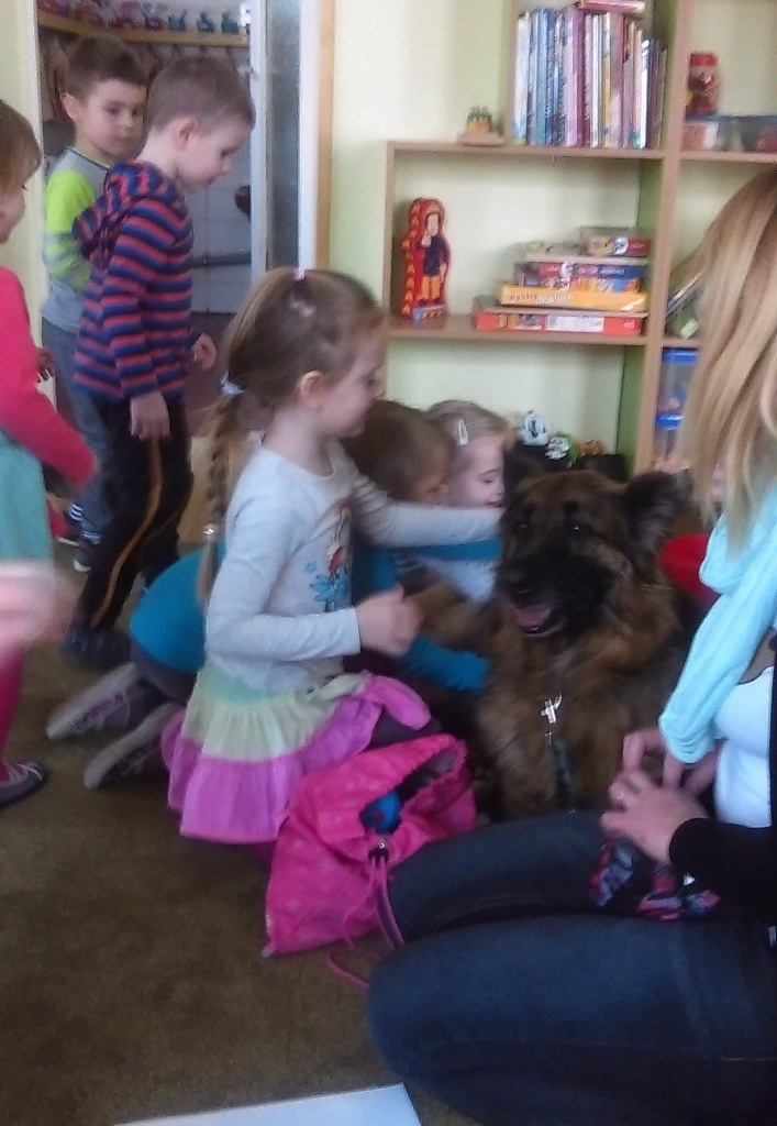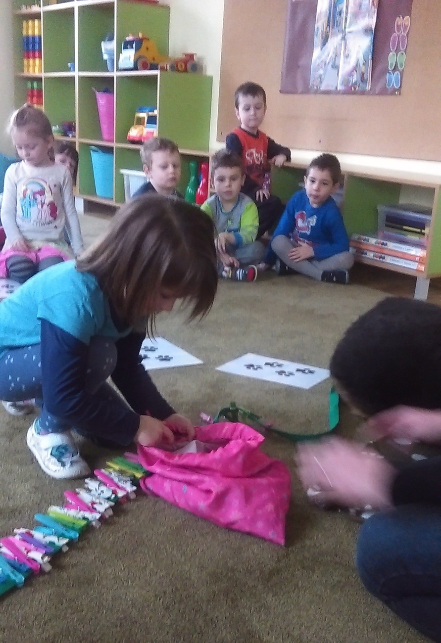 Dziś w przedszkolu mieliśmy wyjątkowego gościa – odwiedziła nas Wandzia. Wandzia to owczarek niemiecki, który przyjeżdża ze swoją opiekunką do naszego przedszkola. Dzisiaj razem z Wandzią trenowaliśmy liczenie. Pani miała dla nas wyjątkowe zadanie – ozdabialiśmy smycz Wandzi. Każdy z nas mógł przypiąć tyle spinaczy ile wskazywały wyrzucane kostką oczka. Na zakończenie wszyscy mogliśmy pogłaskać i przytulić się do Wandzi.