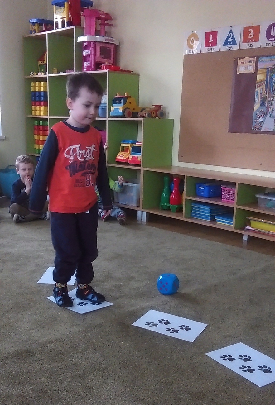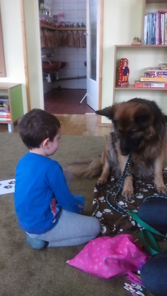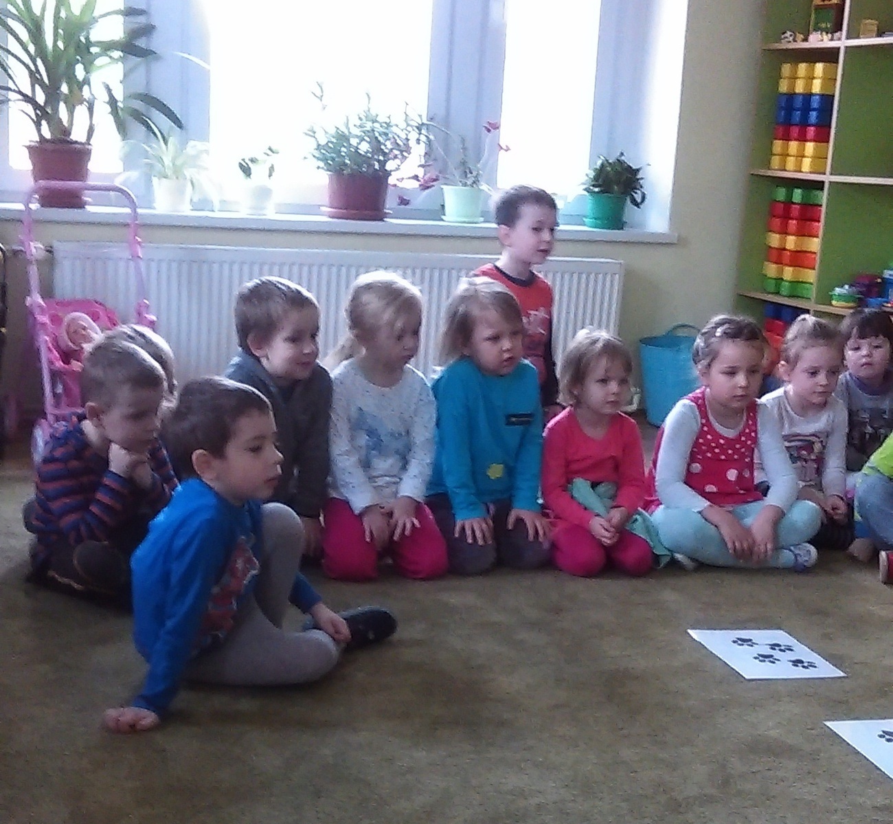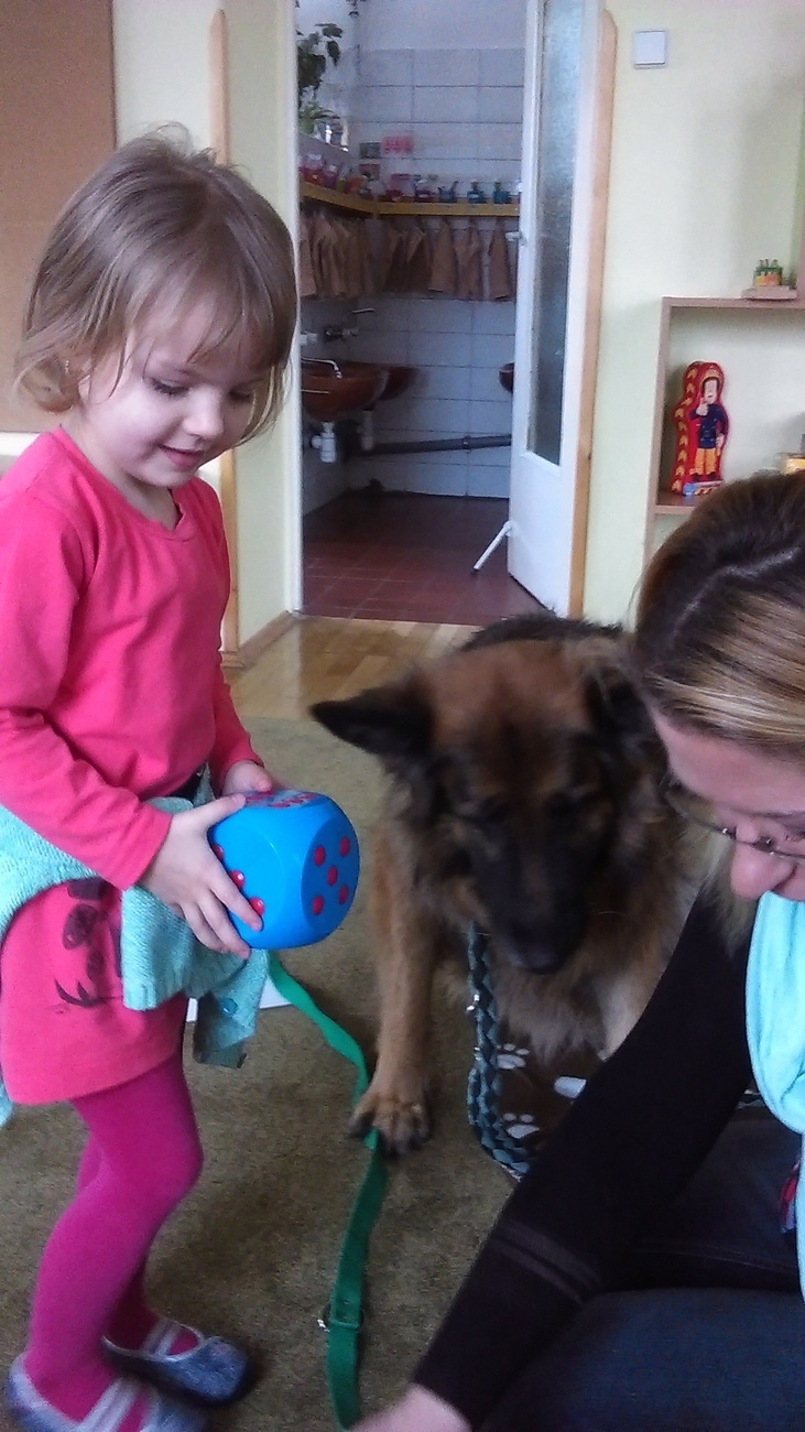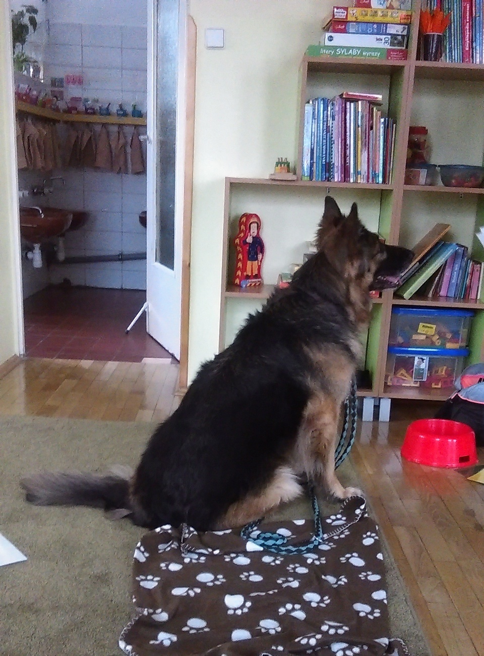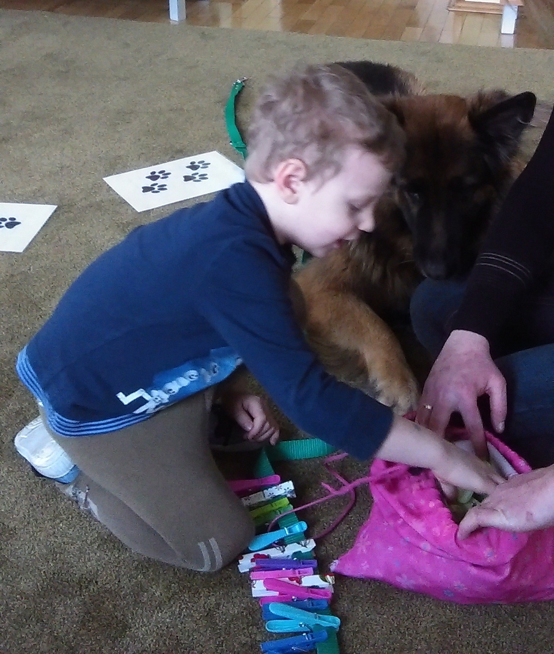 Dziś w przedszkolu mieliśmy wyjątkowego gościa – odwiedziła nas Wandzia. Wandzia to owczarek niemiecki, który przyjeżdża ze swoją opiekunką do naszego przedszkola. Dzisiaj razem z Wandzią trenowaliśmy liczenie. Pani miała dla nas wyjątkowe zadanie – ozdabialiśmy smycz Wandzi. Każdy z nas mógł przypiąć tyle spinaczy ile wskazywały wyrzucane kostką oczka. Na zakończenie wszyscy mogliśmy pogłaskać i przytulić się do Wandzi.