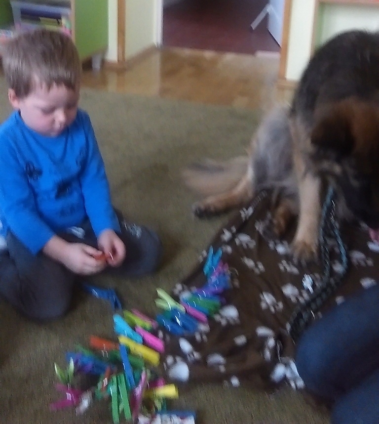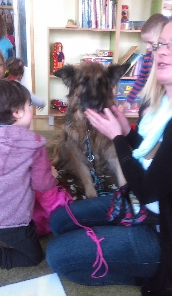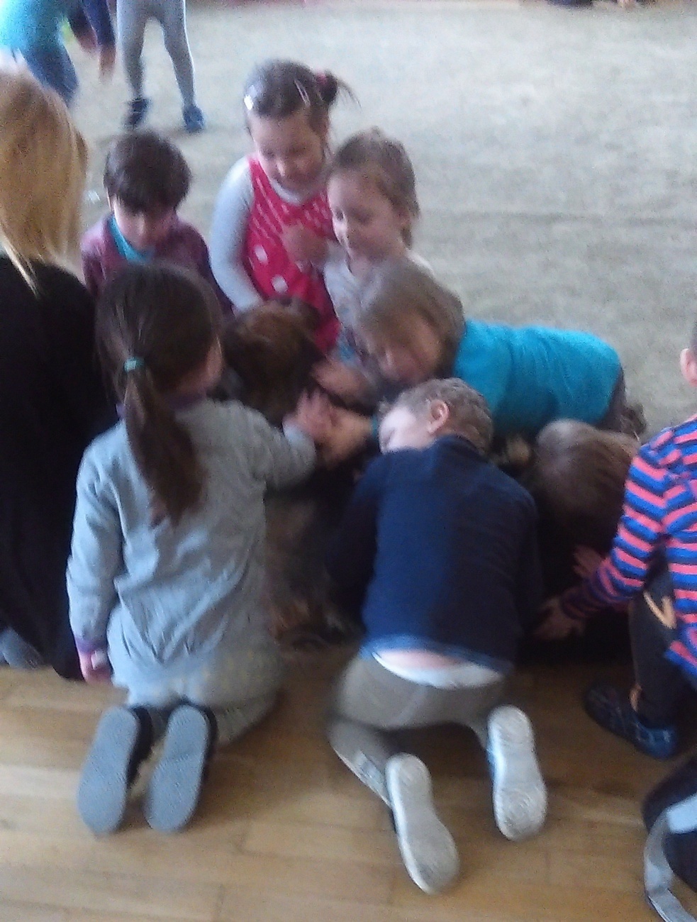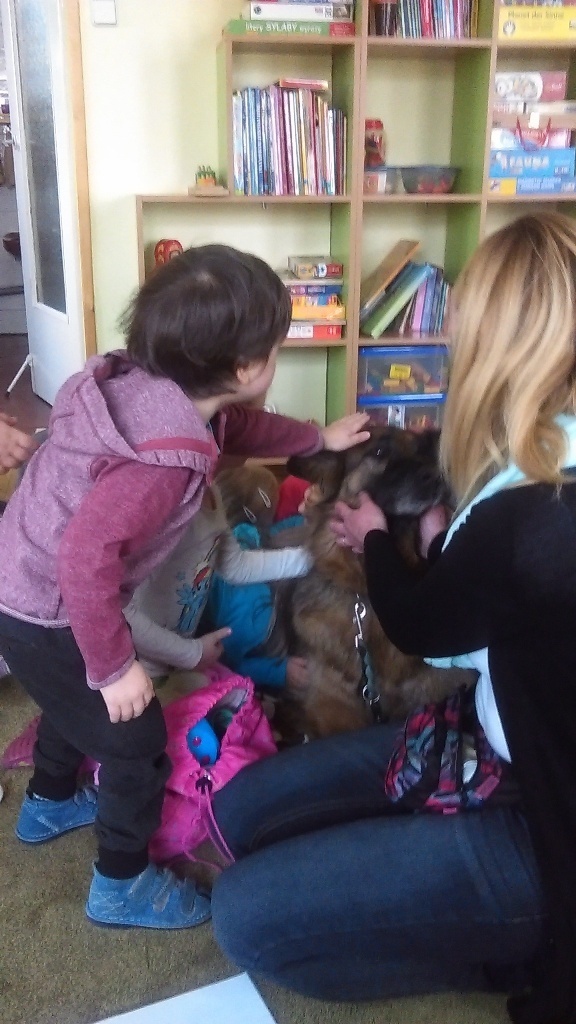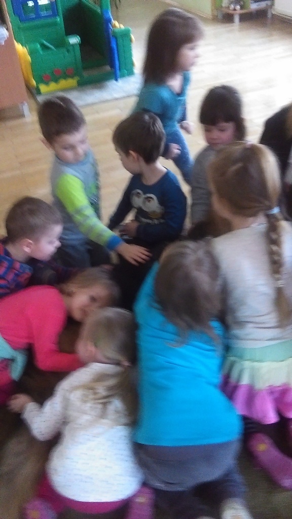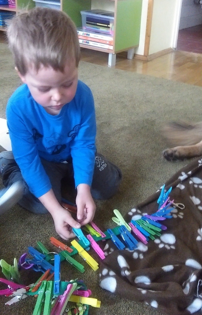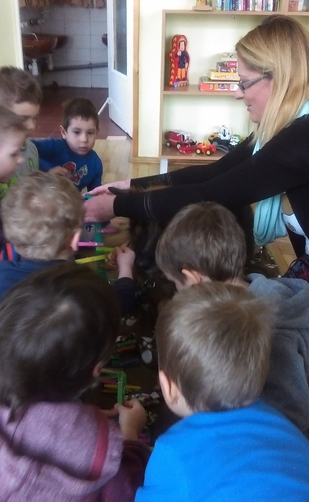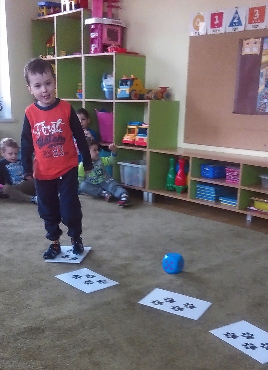 Dziś w przedszkolu mieliśmy wyjątkowego gościa – odwiedziła nas Wandzia. Wandzia to owczarek niemiecki, który przyjeżdża ze swoją opiekunką do naszego przedszkola. Dzisiaj razem z Wandzią trenowaliśmy liczenie. Pani miała dla nas wyjątkowe zadanie – ozdabialiśmy smycz Wandzi. Każdy z nas mógł przypiąć tyle spinaczy ile wskazywały wyrzucane kostką oczka. Na zakończenie wszyscy mogliśmy pogłaskać i przytulić się do Wandzi.