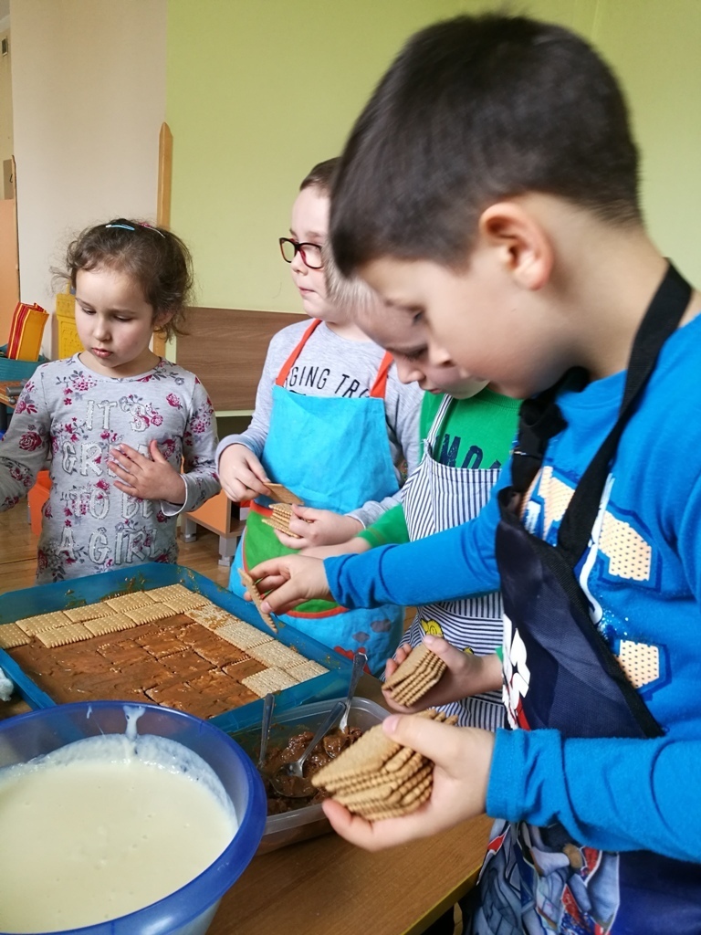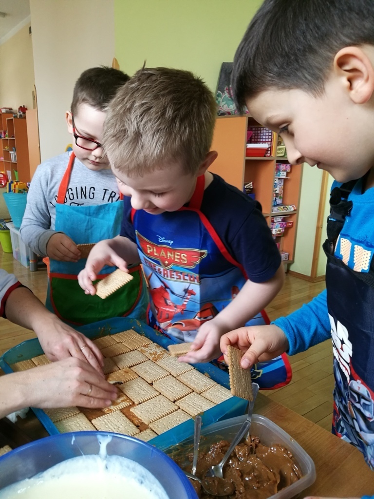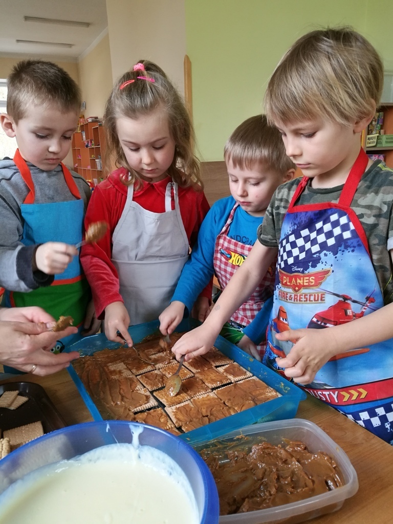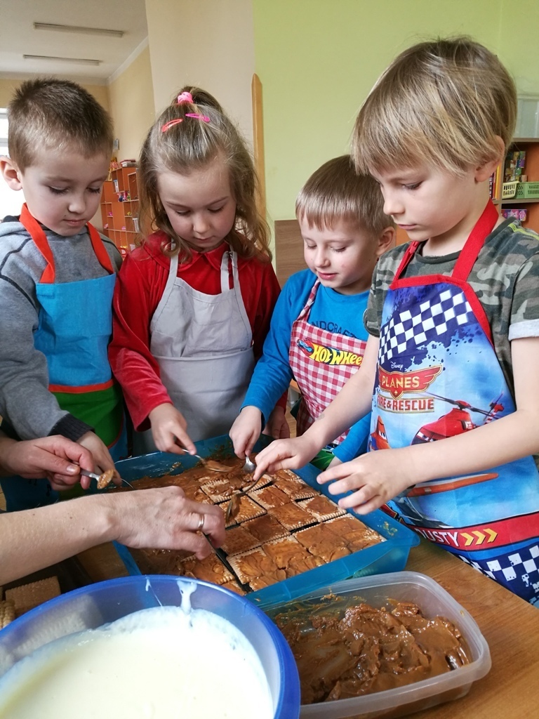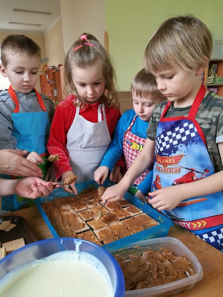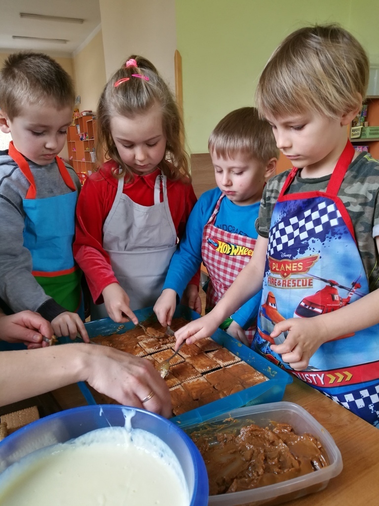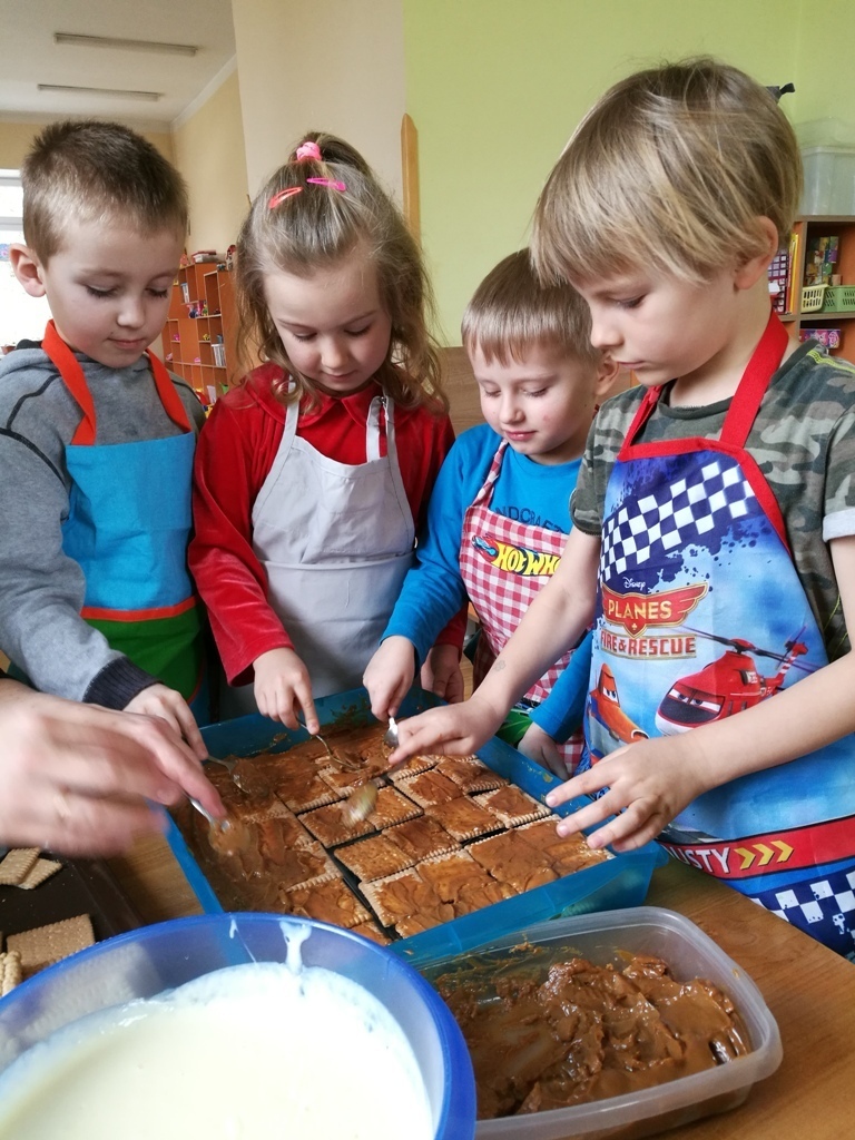 W poprzednim miesiącu wspólnie z dziećmi ustaliliśmy, że raz w miesiącu będą odbywać się zajęcia z gotowaniem tzw. "Kuchcikowo". W ten piątek zaplanowaliśmy, że będziemy robić ciasto "przekładaniec". Dzieci przyniosły produkty do przedszkola, umyły rączki, złożyły fartuchy i zabrały się do pracy. Na początku układaliśmy herbatniki, później smarowaliśmy je masą krówkową i kładliśmy następną warstwę ciastek. Wspólnie przygotowaliśmy masę budyniową i wspólnymi siłami kończyliśmy ciasto. Byliśmy z siebie bardzo dumni i ciasto wyglądało super, a pewnie jeszcze lepiej smakowało. Wszystkie dzieci dzielnie pracowały i nikt się nie lenił. Nawet robot kuchenny nie stanowił dla nich żadnego problemu. Po skończonej pracy, przyszedł czas na najprzyjemniejszą część gotowania – degustacje. Najlepszym dowodem na to, że ciasto wyszło – były puste talerze, które zostały po jedzeniu. Wszystkim ciasto smakowało i byliśmy z siebie dumni. Teraz zastanawiamy się co przygotujemy następnym razem.