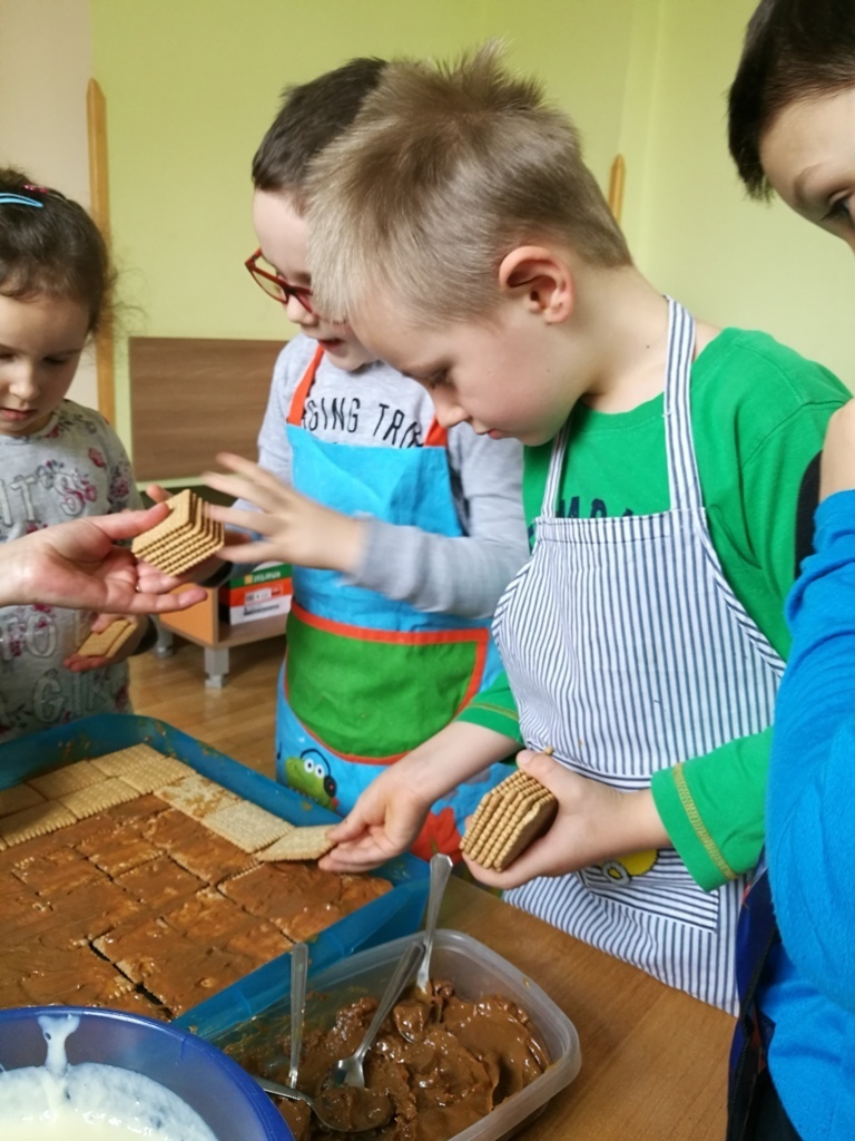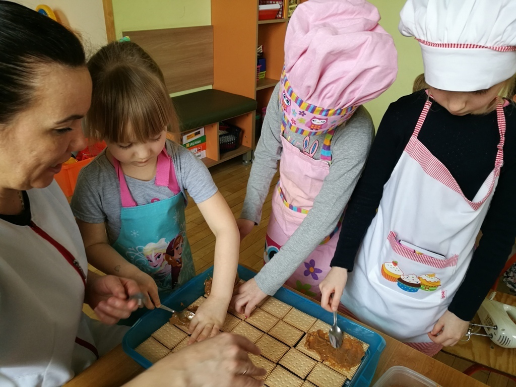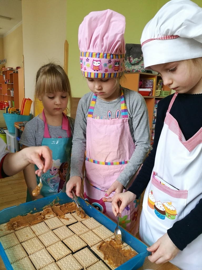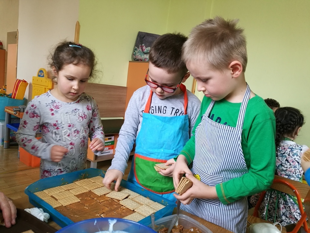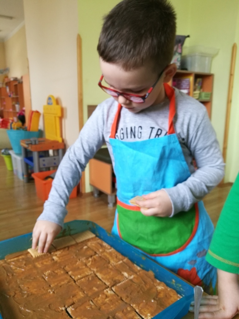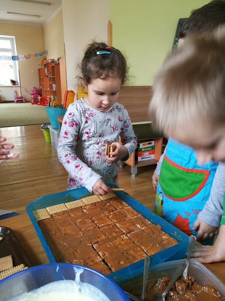 W poprzednim miesiącu wspólnie z dziećmi ustaliliśmy, że raz w miesiącu będą odbywać się zajęcia z gotowaniem tzw. "Kuchcikowo". W ten piątek zaplanowaliśmy, że będziemy robić ciasto "przekładaniec". Dzieci przyniosły produkty do przedszkola, umyły rączki, złożyły fartuchy i zabrały się do pracy. Na początku układaliśmy herbatniki, później smarowaliśmy je masą krówkową i kładliśmy następną warstwę ciastek. Wspólnie przygotowaliśmy masę budyniową i wspólnymi siłami kończyliśmy ciasto. Byliśmy z siebie bardzo dumni i ciasto wyglądało super, a pewnie jeszcze lepiej smakowało. Wszystkie dzieci dzielnie pracowały i nikt się nie lenił. Nawet robot kuchenny nie stanowił dla nich żadnego problemu. Po skończonej pracy, przyszedł czas na najprzyjemniejszą część gotowania – degustacje. Najlepszym dowodem na to, że ciasto wyszło – były puste talerze, które zostały po jedzeniu. Wszystkim ciasto smakowało i byliśmy z siebie dumni. Teraz zastanawiamy się co przygotujemy następnym razem.