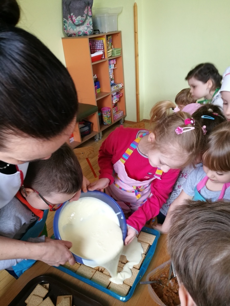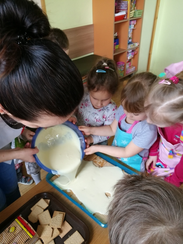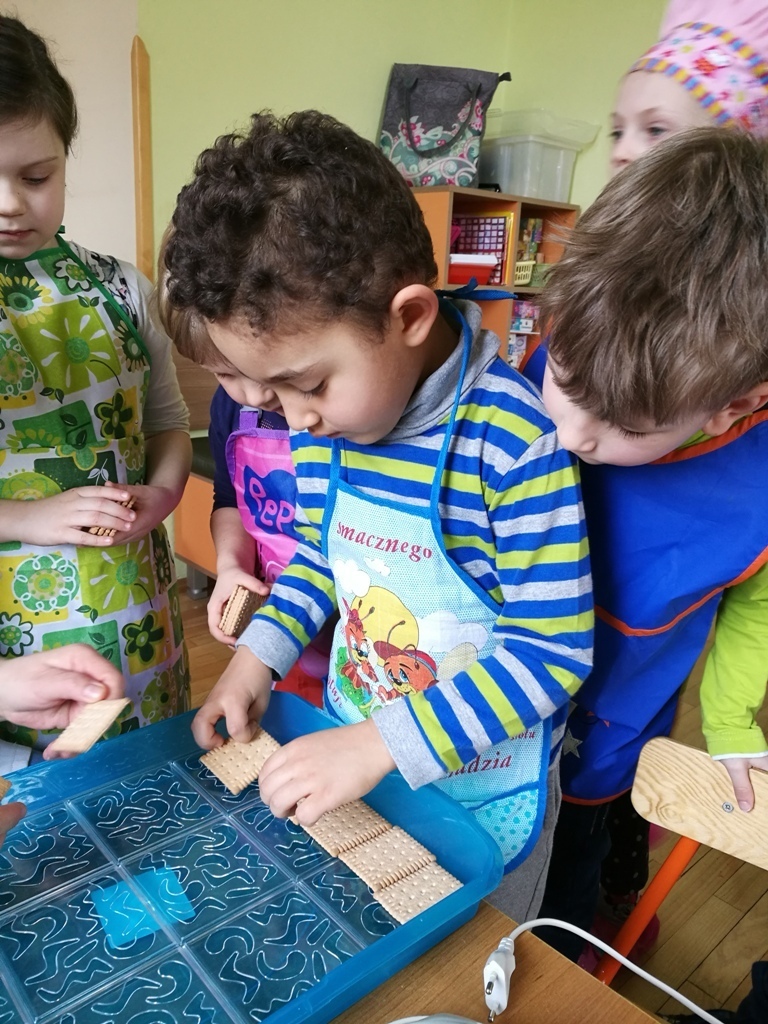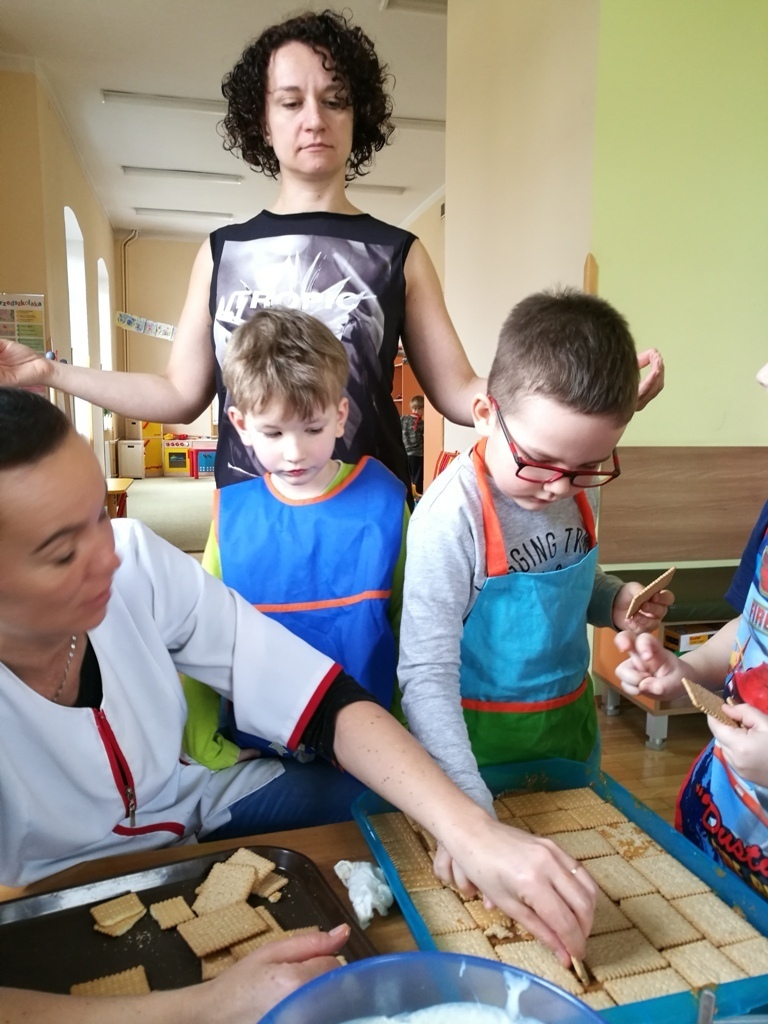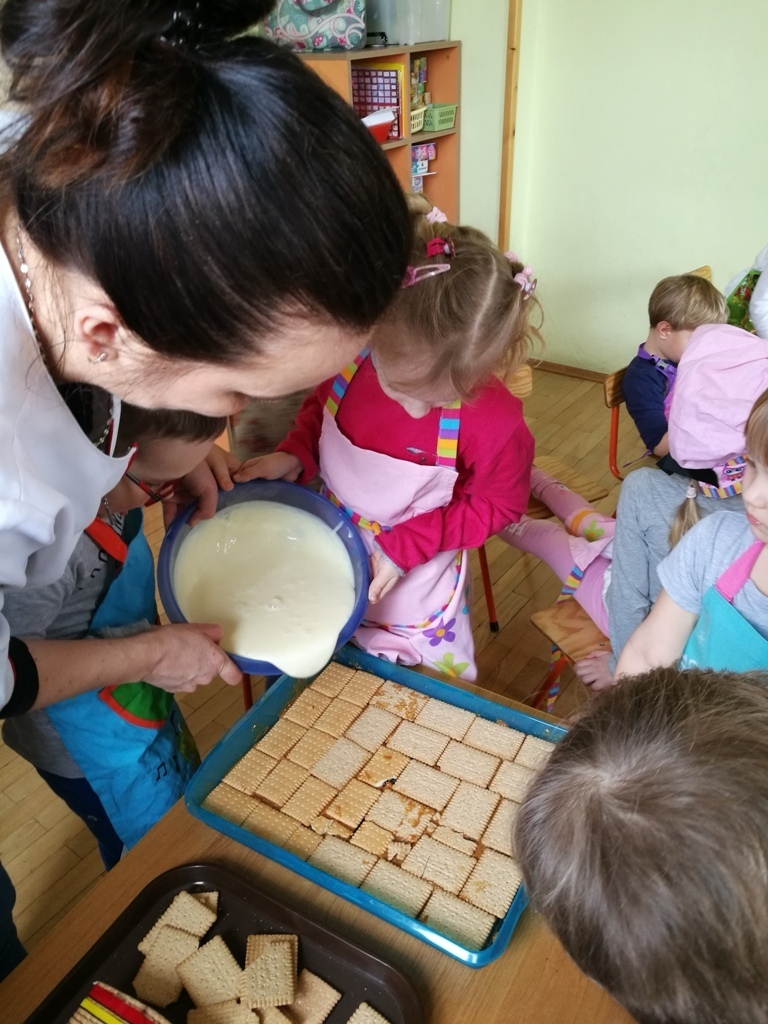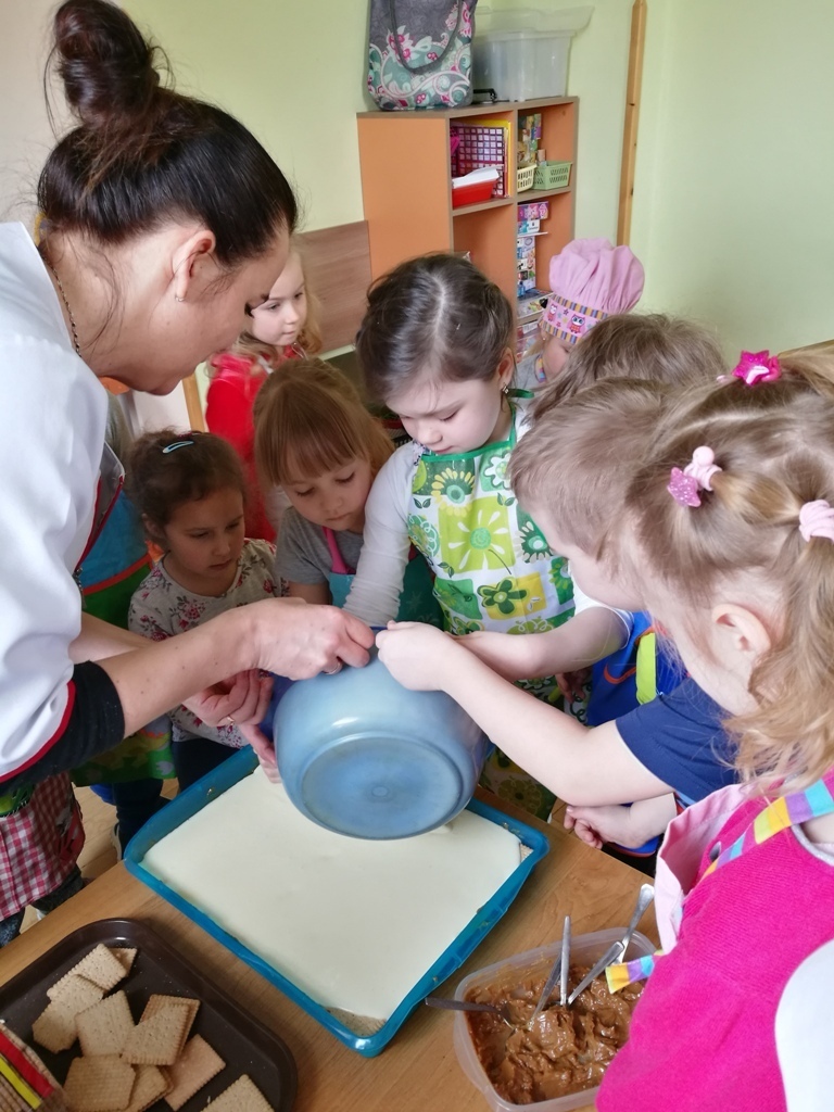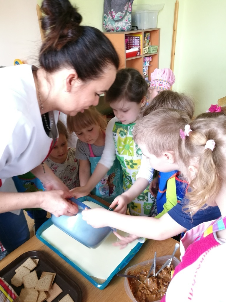 W poprzednim miesiącu wspólnie z dziećmi ustaliliśmy, że raz w miesiącu będą odbywać się zajęcia z gotowaniem tzw. "Kuchcikowo". W ten piątek zaplanowaliśmy, że będziemy robić ciasto "przekładaniec". Dzieci przyniosły produkty do przedszkola, umyły rączki, złożyły fartuchy i zabrały się do pracy. Na początku układaliśmy herbatniki, później smarowaliśmy je masą krówkową i kładliśmy następną warstwę ciastek. Wspólnie przygotowaliśmy masę budyniową i wspólnymi siłami kończyliśmy ciasto. Byliśmy z siebie bardzo dumni i ciasto wyglądało super, a pewnie jeszcze lepiej smakowało. Wszystkie dzieci dzielnie pracowały i nikt się nie lenił. Nawet robot kuchenny nie stanowił dla nich żadnego problemu. Po skończonej pracy, przyszedł czas na najprzyjemniejszą część gotowania – degustacje. Najlepszym dowodem na to, że ciasto wyszło – były puste talerze, które zostały po jedzeniu. Wszystkim ciasto smakowało i byliśmy z siebie dumni. Teraz zastanawiamy się co przygotujemy następnym razem.
