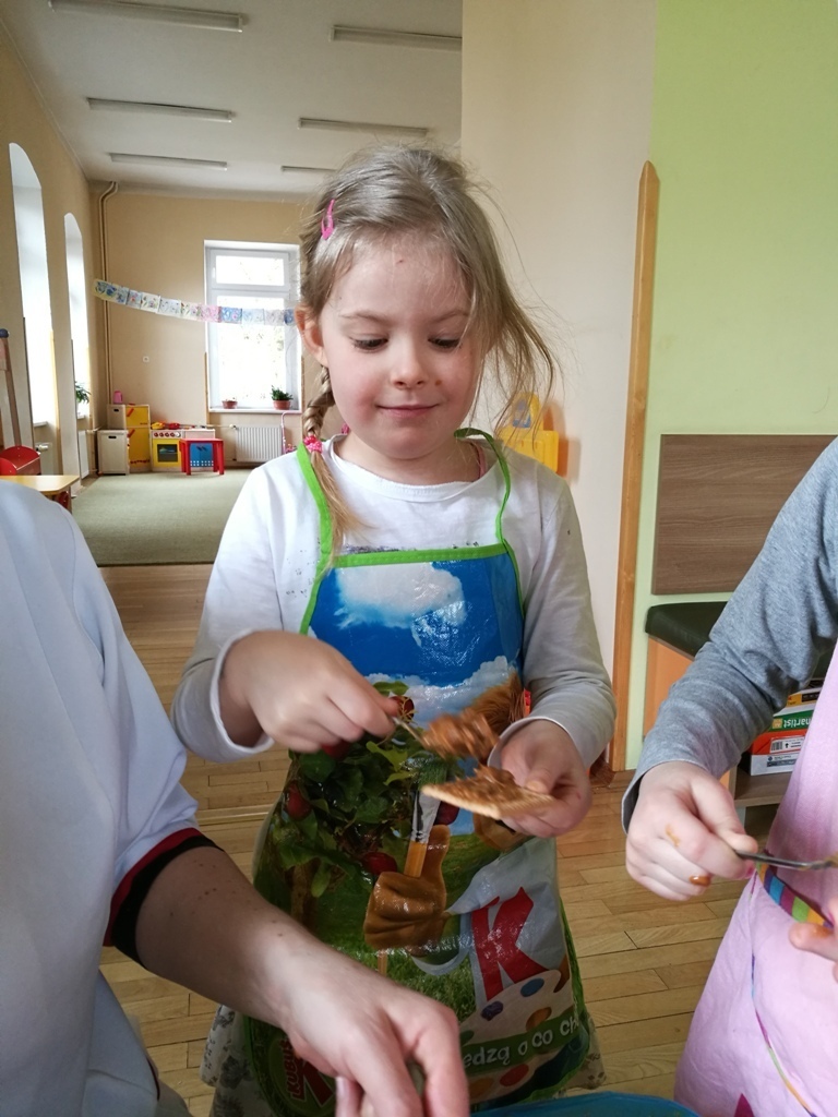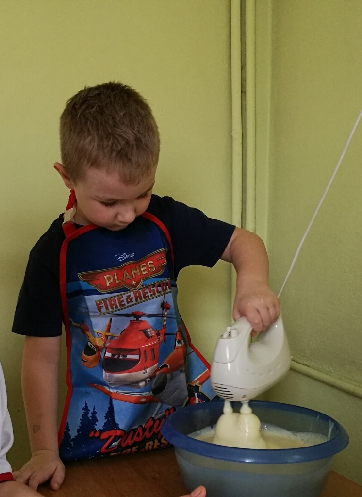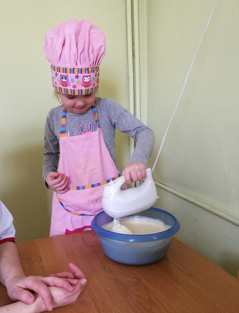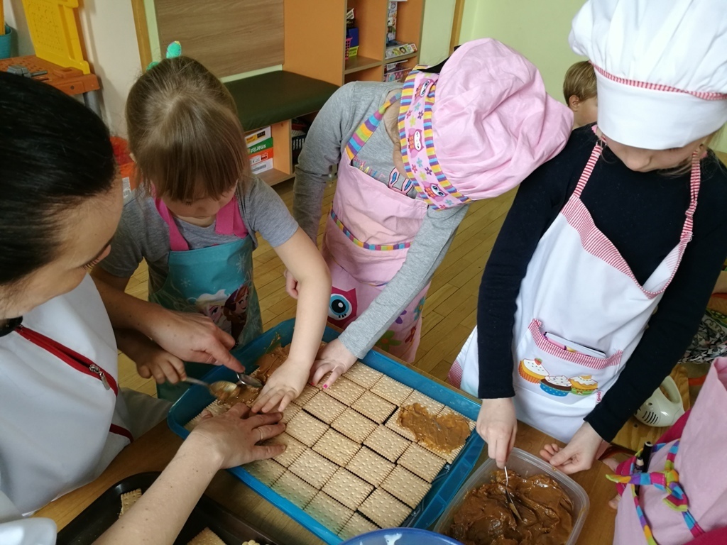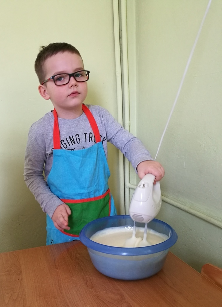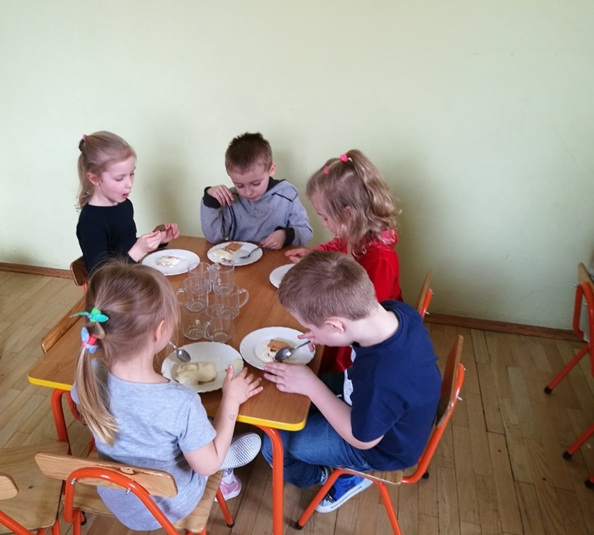 W poprzednim miesiącu wspólnie z dziećmi ustaliliśmy, że raz w miesiącu będą odbywać się zajęcia z gotowaniem tzw. "Kuchcikowo". W ten piątek zaplanowaliśmy, że będziemy robić ciasto "przekładaniec". Dzieci przyniosły produkty do przedszkola, umyły rączki, złożyły fartuchy i zabrały się do pracy. Na początku układaliśmy herbatniki, później smarowaliśmy je masą krówkową i kładliśmy następną warstwę ciastek. Wspólnie przygotowaliśmy masę budyniową i wspólnymi siłami kończyliśmy ciasto. Byliśmy z siebie bardzo dumni i ciasto wyglądało super, a pewnie jeszcze lepiej smakowało. Wszystkie dzieci dzielnie pracowały i nikt się nie lenił. Nawet robot kuchenny nie stanowił dla nich żadnego problemu. Po skończonej pracy, przyszedł czas na najprzyjemniejszą część gotowania – degustacje. Najlepszym dowodem na to, że ciasto wyszło – były puste talerze, które zostały po jedzeniu. Wszystkim ciasto smakowało i byliśmy z siebie dumni. Teraz zastanawiamy się co przygotujemy następnym razem.