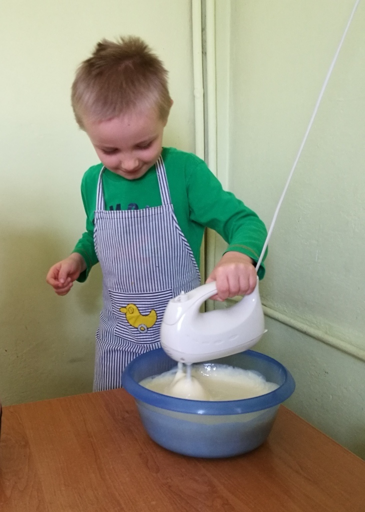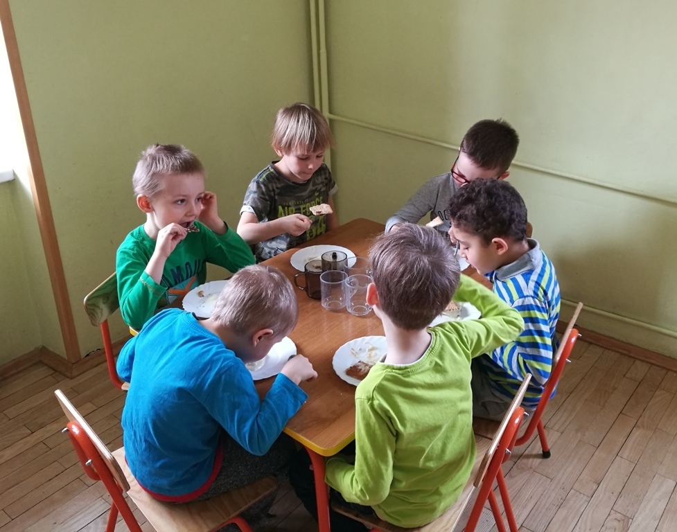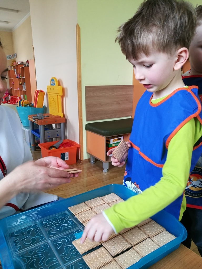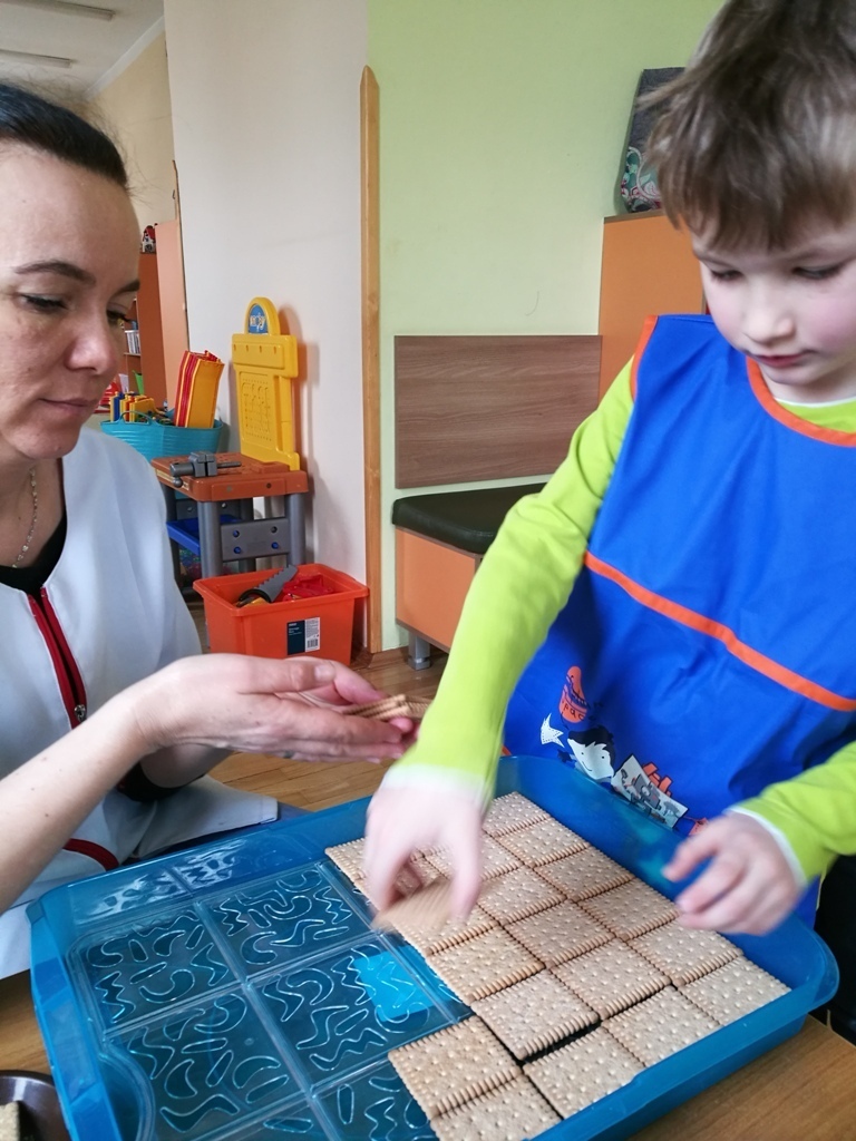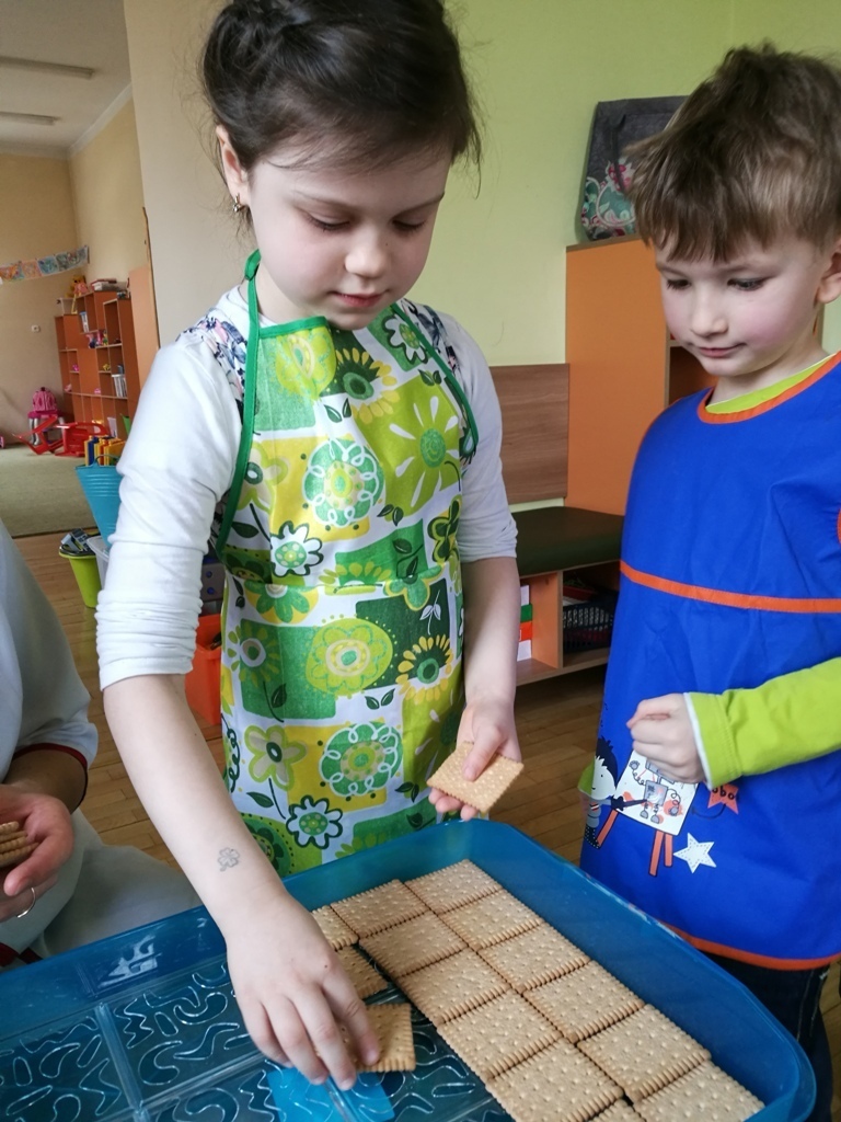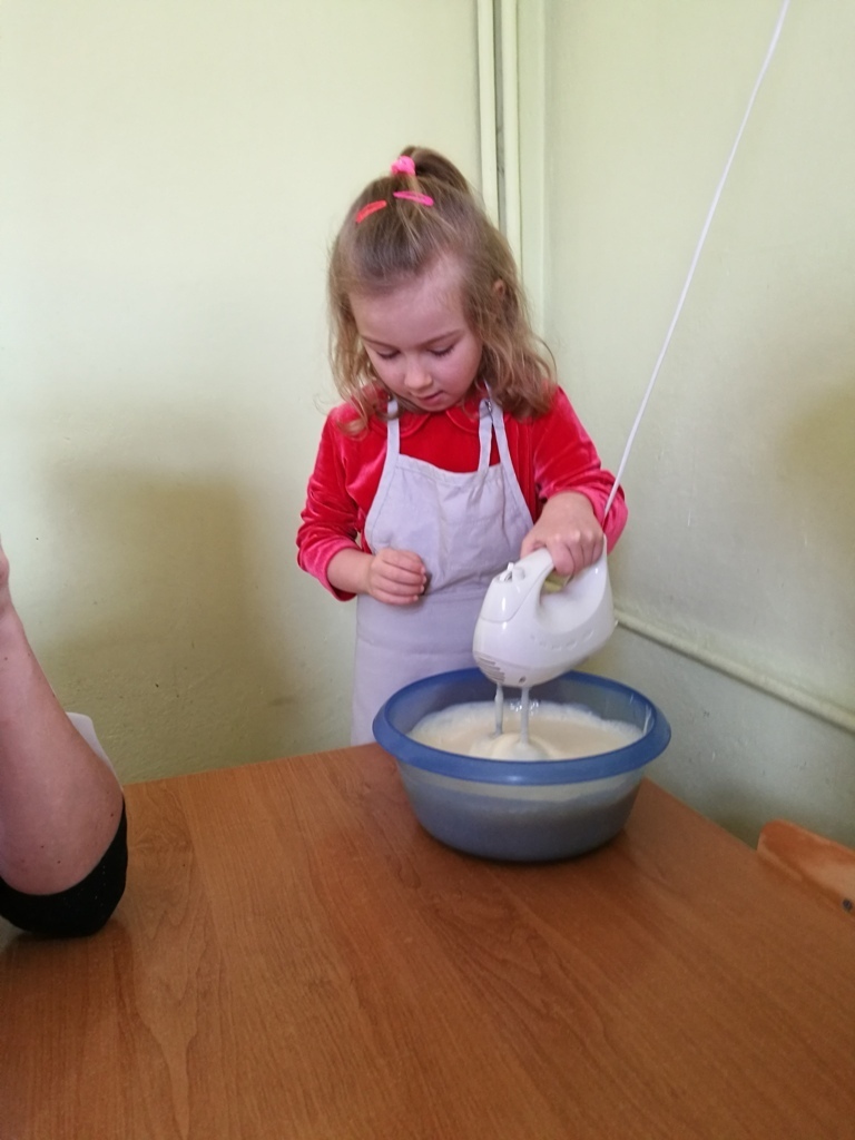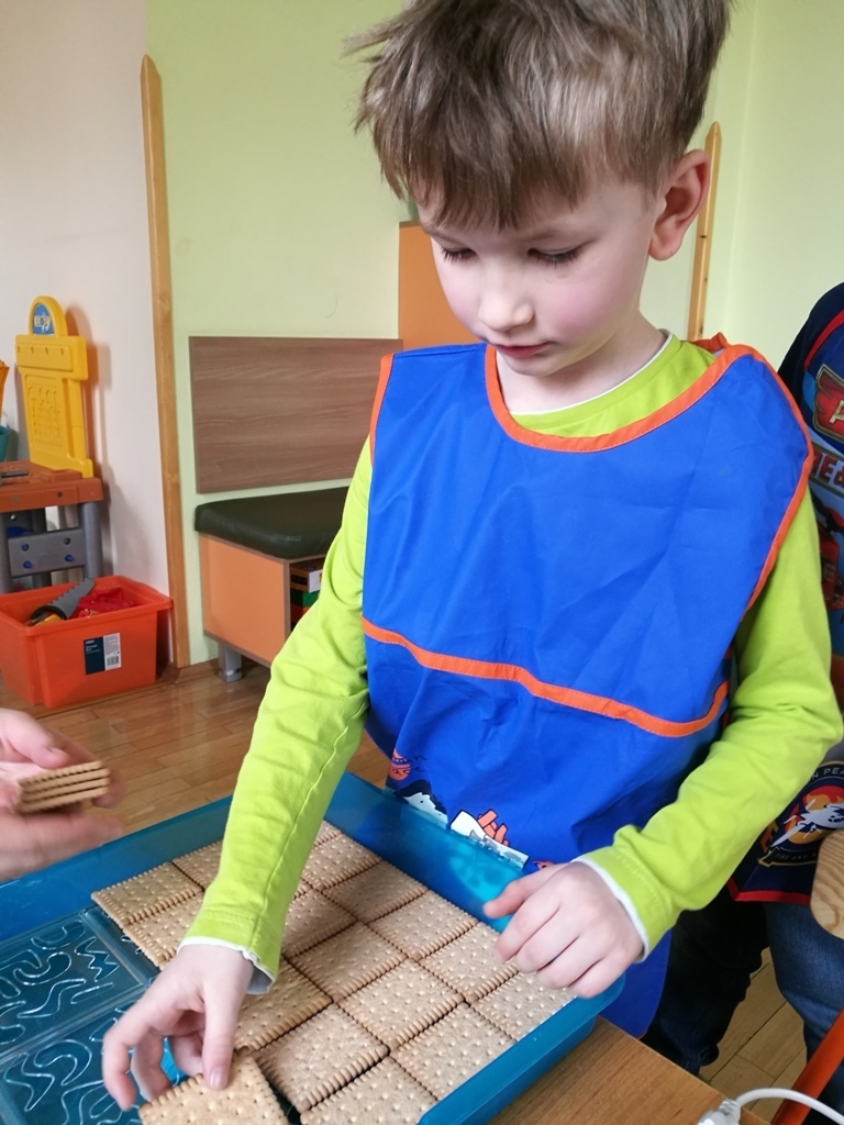W poprzednim miesiącu wspólnie z dziećmi ustaliliśmy, że raz w miesiącu będą odbywać się zajęcia z gotowaniem tzw. "Kuchcikowo". W ten piątek zaplanowaliśmy, że będziemy robić ciasto "przekładaniec". Dzieci przyniosły produkty do przedszkola, umyły rączki, złożyły fartuchy i zabrały się do pracy. Na początku układaliśmy herbatniki, później smarowaliśmy je masą krówkową i kładliśmy następną warstwę ciastek. Wspólnie przygotowaliśmy masę budyniową i wspólnymi siłami kończyliśmy ciasto. Byliśmy z siebie bardzo dumni i ciasto wyglądało super, a pewnie jeszcze lepiej smakowało. Wszystkie dzieci dzielnie pracowały i nikt się nie lenił. Nawet robot kuchenny nie stanowił dla nich żadnego problemu. Po skończonej pracy, przyszedł czas na najprzyjemniejszą część gotowania – degustacje. Najlepszym dowodem na to, że ciasto wyszło – były puste talerze, które zostały po jedzeniu. Wszystkim ciasto smakowało i byliśmy z siebie dumni. Teraz zastanawiamy się co przygotujemy następnym razem.