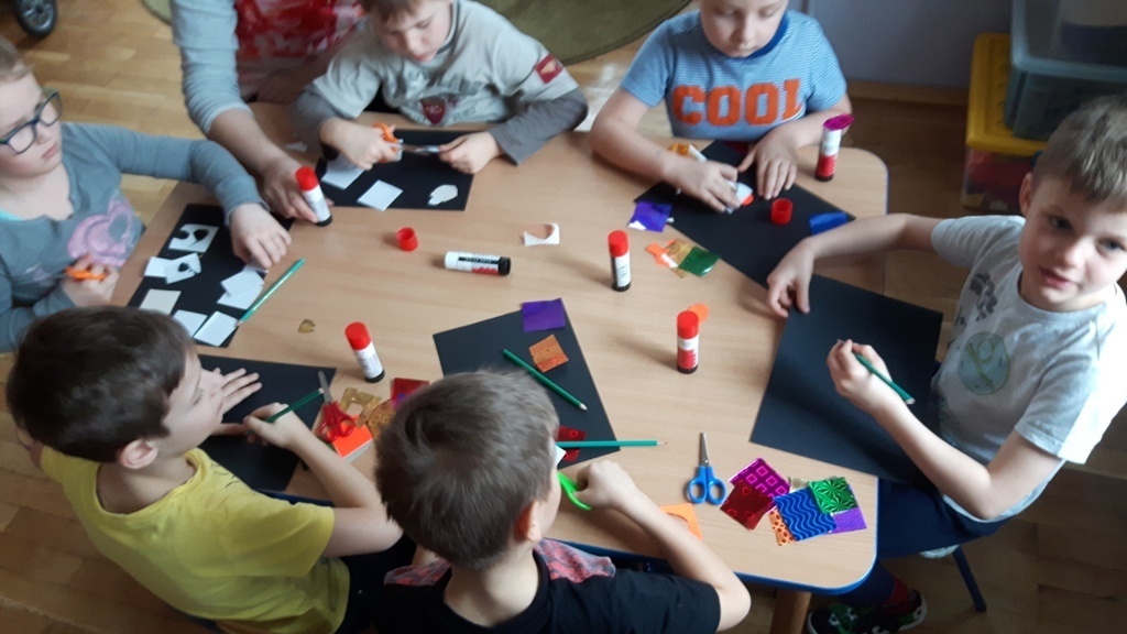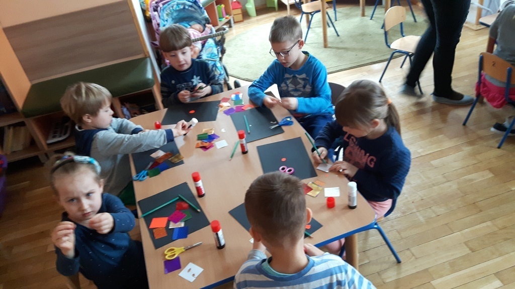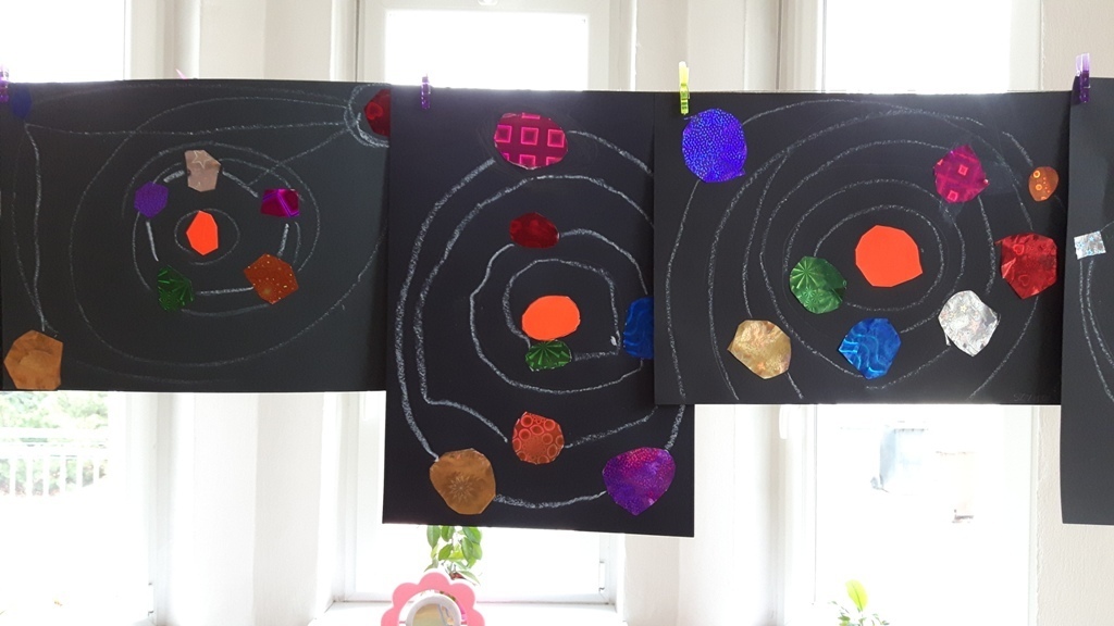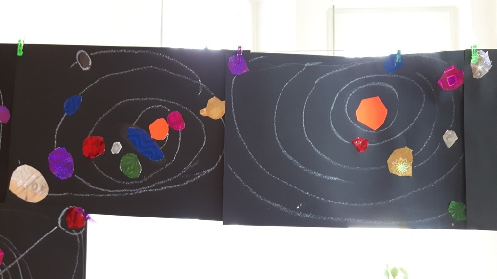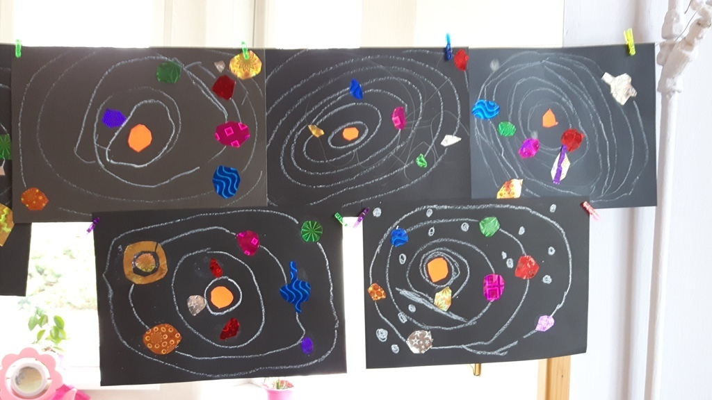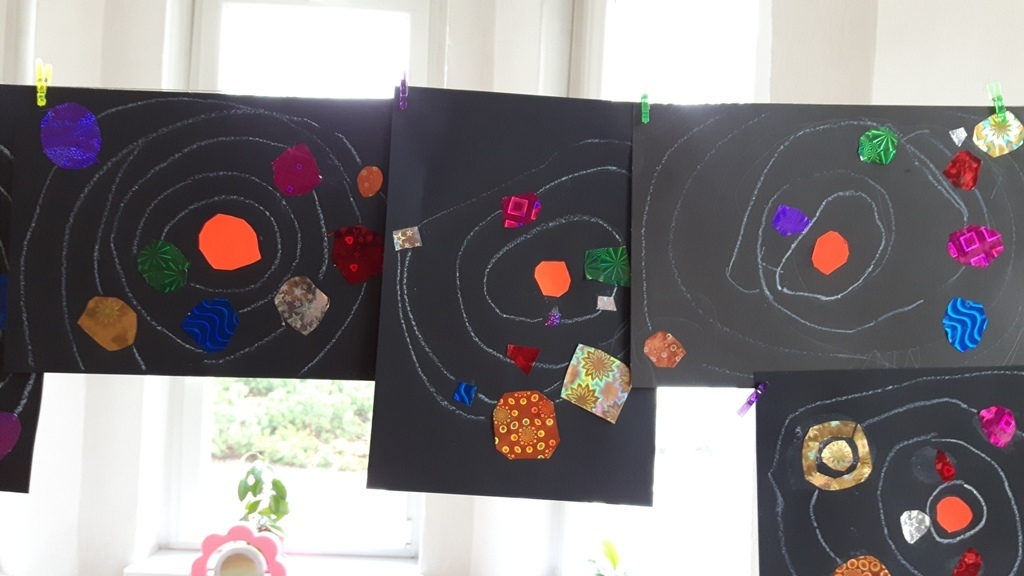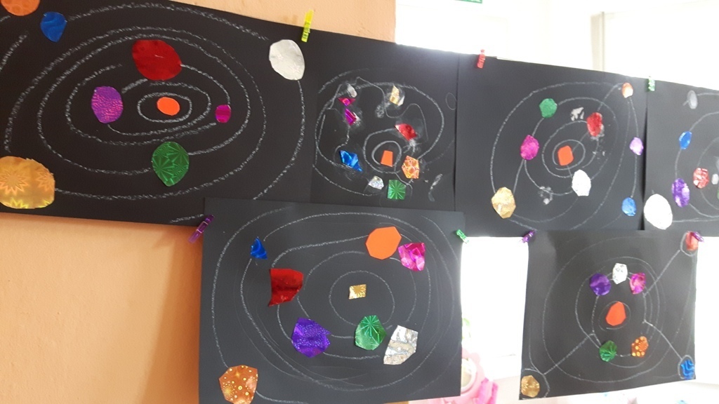 Zuchy na krótki czas wybrały się w kosmos. Podróż po Układzie Słonecznym prócz doskonalenia umiejętności liczenia – planet, podejmowania prób czytania ich nazw, zaowocowała wykonaniem pracy plastycznej. Każdy ze starszaków wykonał samodzielnie wzór Układu Słonecznego przy wykorzystaniu kartek z czarnego bloku oraz holograficznego papieru imitującego planety.
