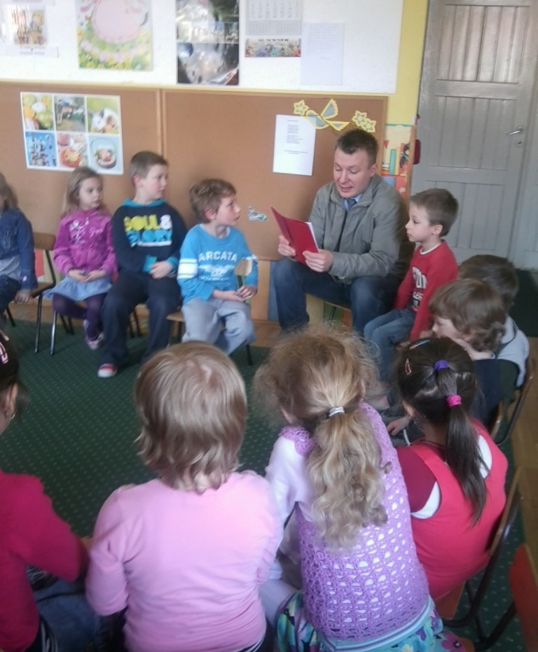 Na spotkanie z nami zgodził się także Tato Olka, który przeczytał nam bajki pt.: „Tomcio Paluch” i „Szewczyk Dratewka”.