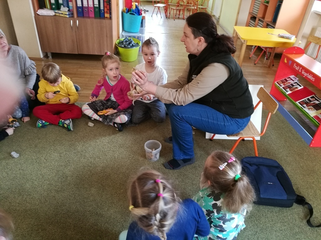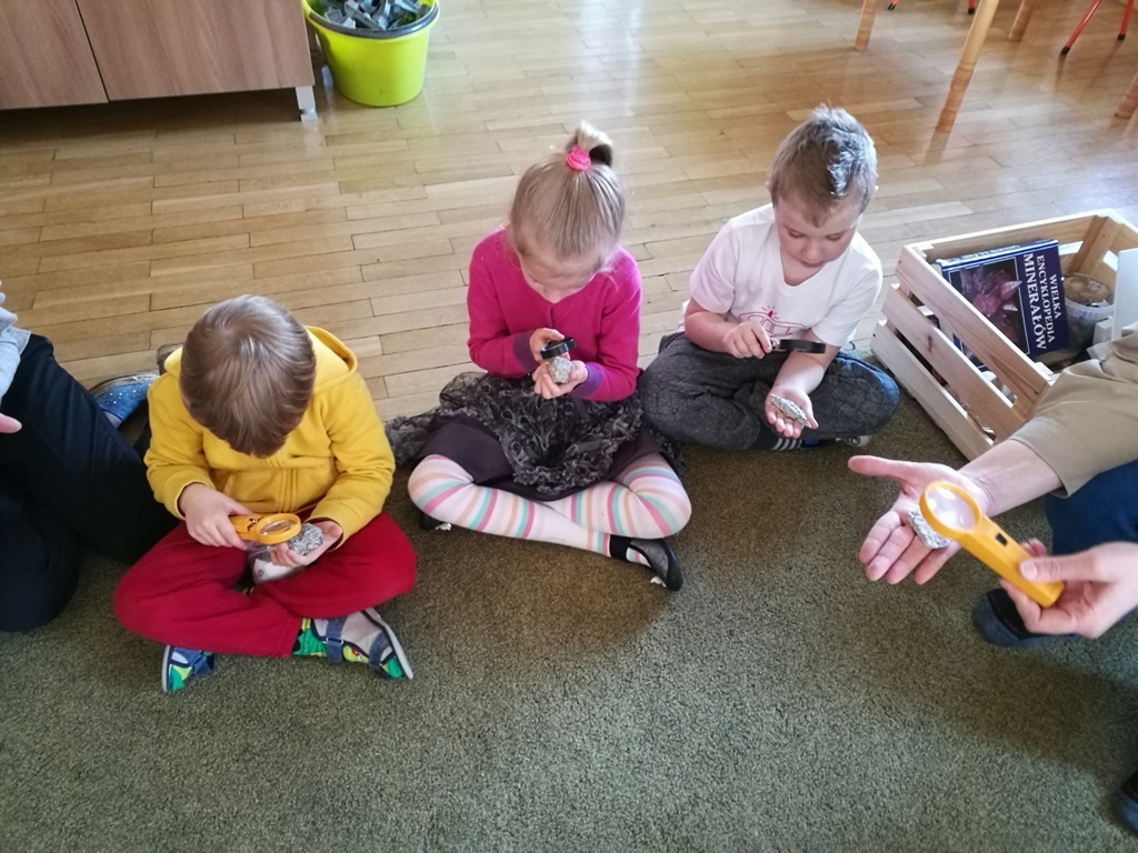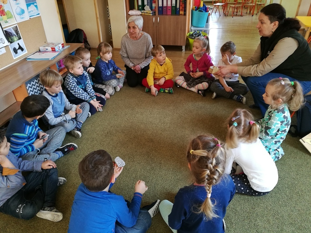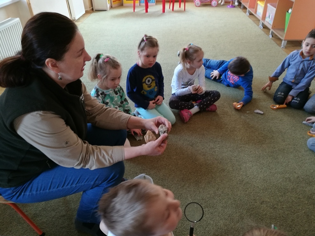 29 marca dzieci z grupy IV uczestniczyły w kolejnych zajęciach z panią Edukator z Karkonoskiego Parku Narodowego. Tematem spotkania były skały i minerały. Na początku spotkania dowiedzieliśmy się jak powstają nieożywione elementy przyrody – bo tak można nazwać skały i minerały, które znajdują się wokół nas. Następnie przedszkolaki mogły wylosować dla siebie mały upominek – niewielkie odłamki granitu. Pani Edukator przyniosła nam do pokazania niektóre eksponaty takie jak: kryształ górski, wapń, a nawet fragment siarki, która miała bardzo specyficzny zapach. Dowiedzieliśmy się, że na naszym terenie odnaleziono jedne z największych złóż minerałów i skał – około 230 rodzajów. Rozmawialiśmy również na temat, do czego można wykorzystać skały takie jak np: granit lub gips. Wiemy także, że istnieje skala, którą ocenia się twardośc skał. Pani pokazała nam jeden okaz, którego nie był w stanie zarysowac nawet metalowy gwóźdź. W trakcie jednych zajęć dowiedzieliśmy się mnóstwa informacji. Teraz patrząc na kamień leżący na drodze będzeimy się zastanawiać do jakiej grupy skał lub minerałów można go zaliczyć.