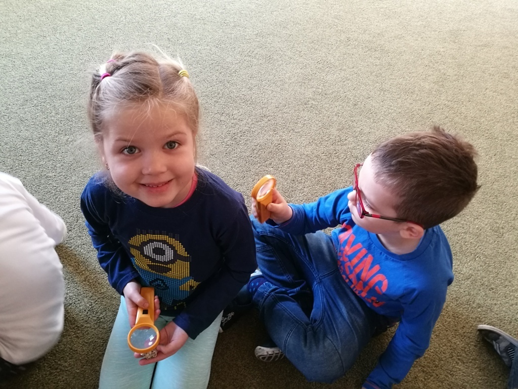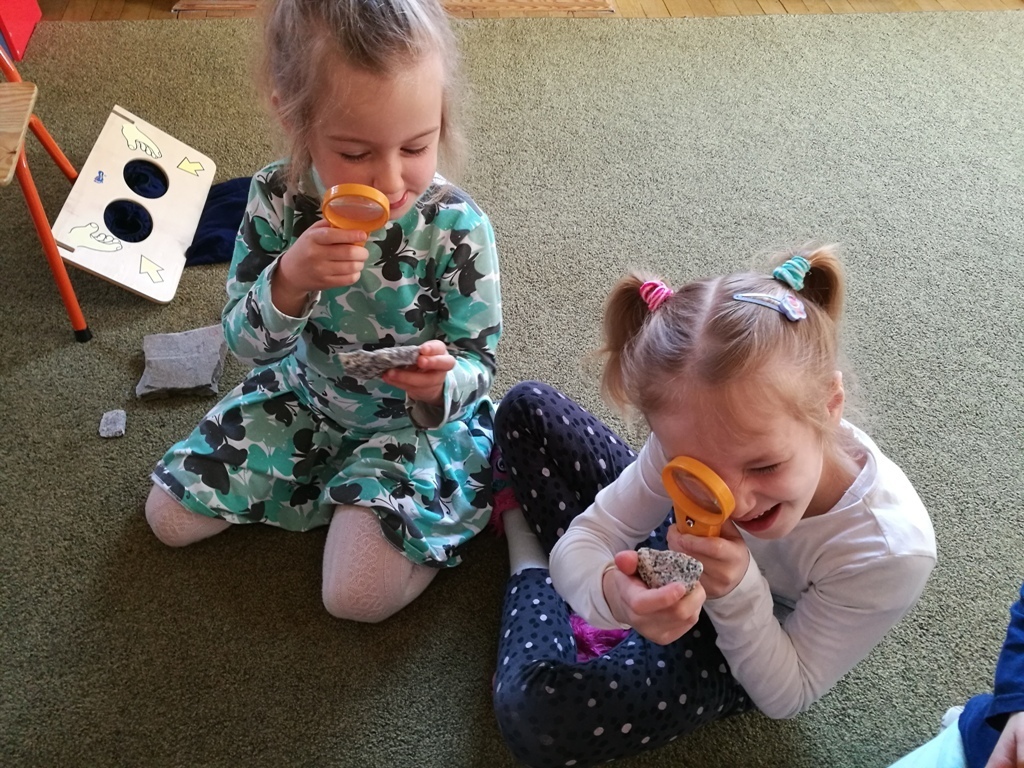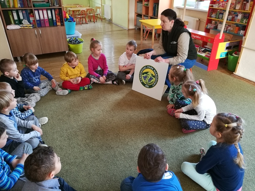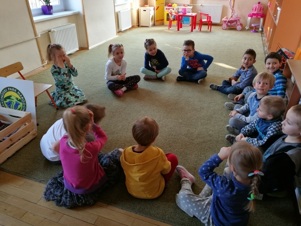 29 marca dzieci z grupy IV uczestniczyły w kolejnych zajęciach z panią Edukator z Karkonoskiego Parku Narodowego. Tematem spotkania były skały i minerały. Na początku spotkania dowiedzieliśmy się jak powstają nieożywione elementy przyrody – bo tak można nazwać skały i minerały, które znajdują się wokół nas. Następnie przedszkolaki mogły wylosować dla siebie mały upominek – niewielkie odłamki granitu. Pani Edukator przyniosła nam do pokazania niektóre eksponaty takie jak: kryształ górski, wapń, a nawet fragment siarki, która miała bardzo specyficzny zapach. Dowiedzieliśmy się, że na naszym terenie odnaleziono jedne z największych złóż minerałów i skał – około 230 rodzajów. Rozmawialiśmy również na temat, do czego można wykorzystać skały takie jak np: granit lub gips. Wiemy także, że istnieje skala, którą ocenia się twardośc skał. Pani pokazała nam jeden okaz, którego nie był w stanie zarysowac nawet metalowy gwóźdź. W trakcie jednych zajęć dowiedzieliśmy się mnóstwa informacji. Teraz patrząc na kamień leżący na drodze będzeimy się zastanawiać do jakiej grupy skał lub minerałów można go zaliczyć.