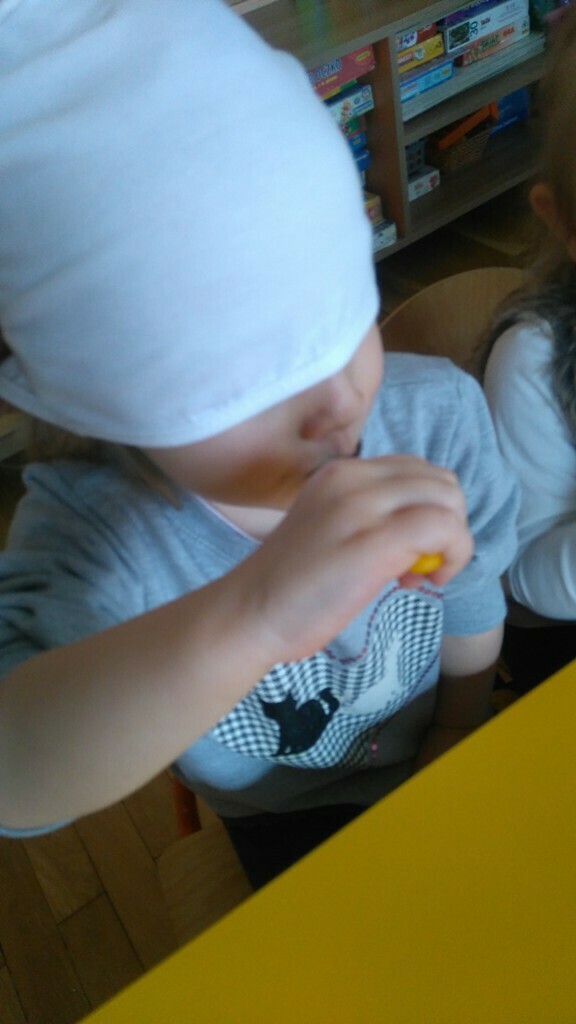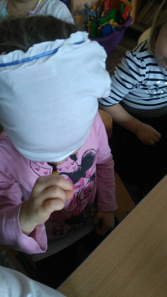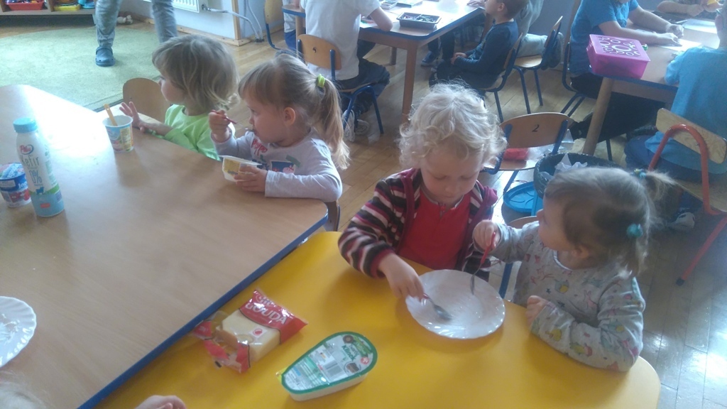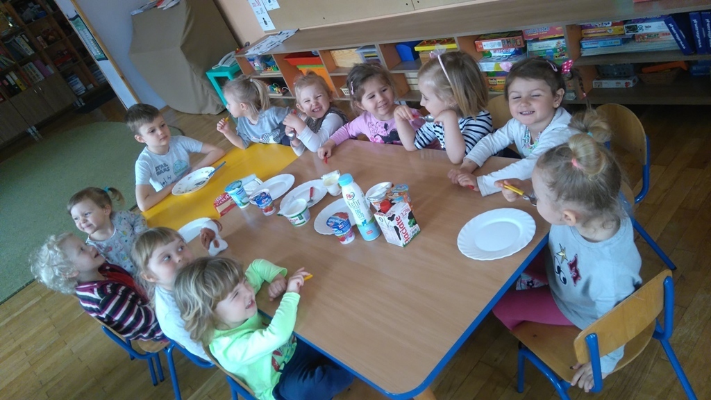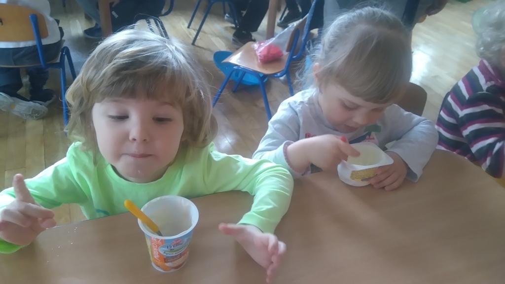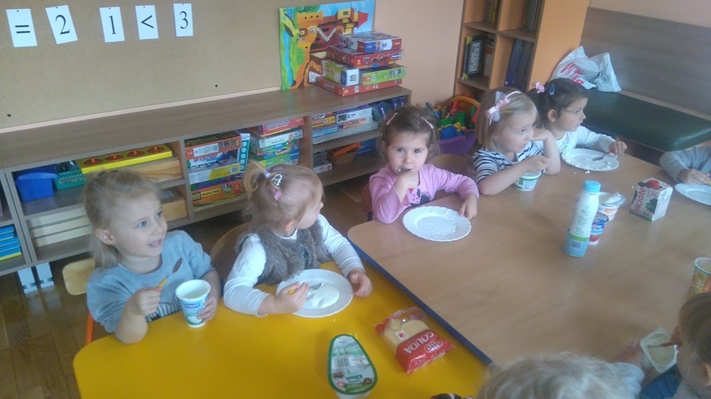 Spróbuj i rozpoznaj co jesz – zabawa badawcza. Przynieśliśmy na dzisja takie produkty jak mleko, jogurty, ser żółty i twaróg, kefir, serek wiejski, mozarellę i jogurt owocowy. Omówiliśmy sobie skąd bierze się mleko i jakie właściwości zdrowotne posiadają produkty mleczne. Następnie z zamkniętymi i zawiązanymi oczami próbowaliśmy wybranego produktu i zgadywaliśmy, który to z pomocą naszego znakomitego zmysłu smaku. Na koniec była uczta i wszystko zjedliśmy.