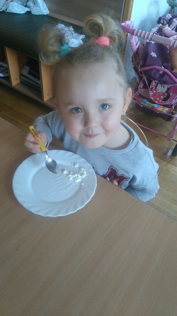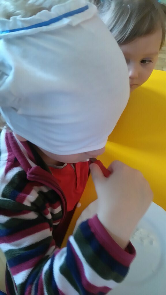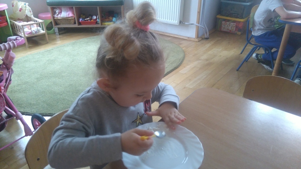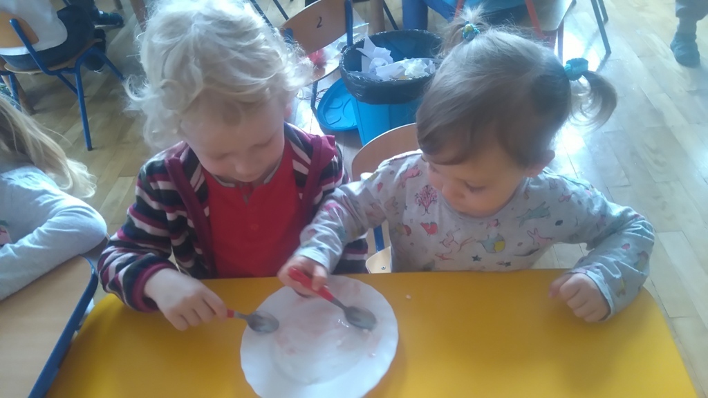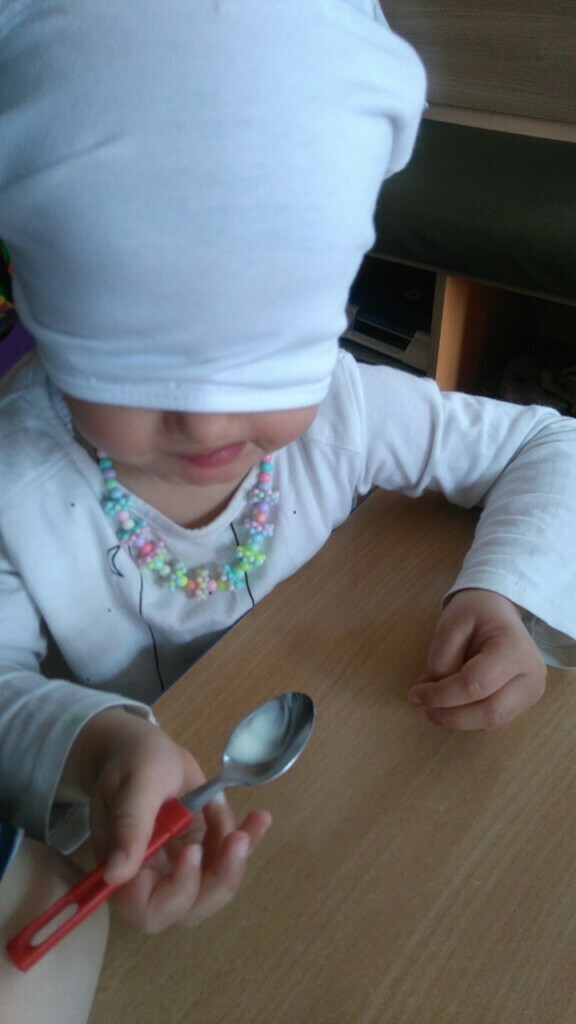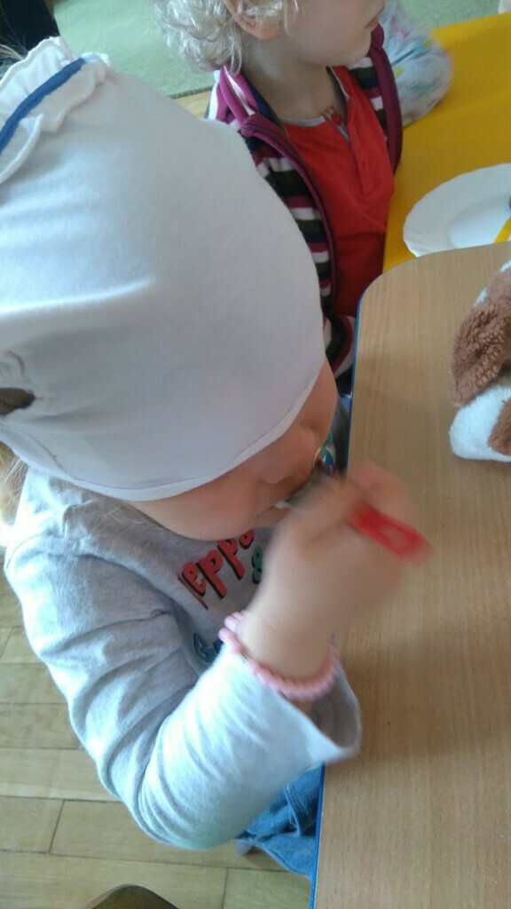 Spróbuj i rozpoznaj co jesz – zabawa badawcza. Przynieśliśmy na dzisja takie produkty jak mleko, jogurty, ser żółty i twaróg, kefir, serek wiejski, mozarellę i jogurt owocowy. Omówiliśmy sobie skąd bierze się mleko i jakie właściwości zdrowotne posiadają produkty mleczne. Następnie z zamkniętymi i zawiązanymi oczami próbowaliśmy wybranego produktu i zgadywaliśmy, który to z pomocą naszego znakomitego zmysłu smaku. Na koniec była uczta i wszystko zjedliśmy.