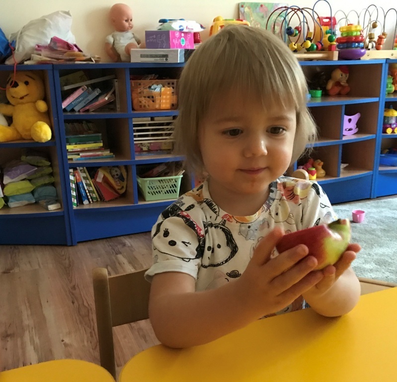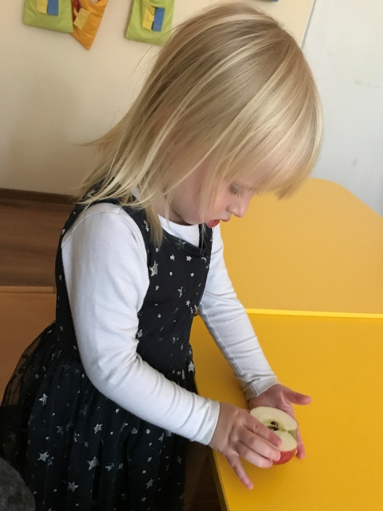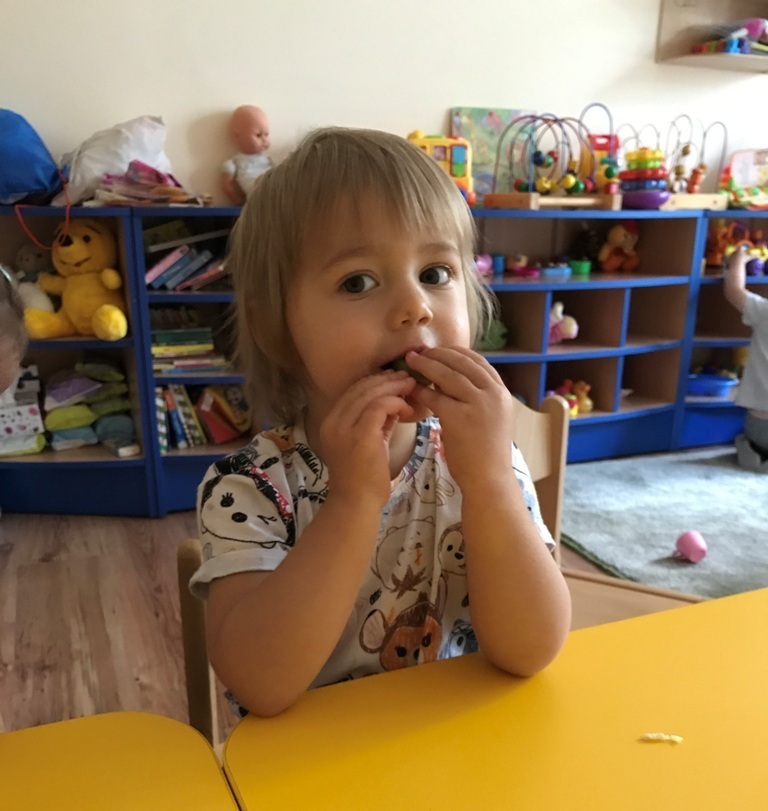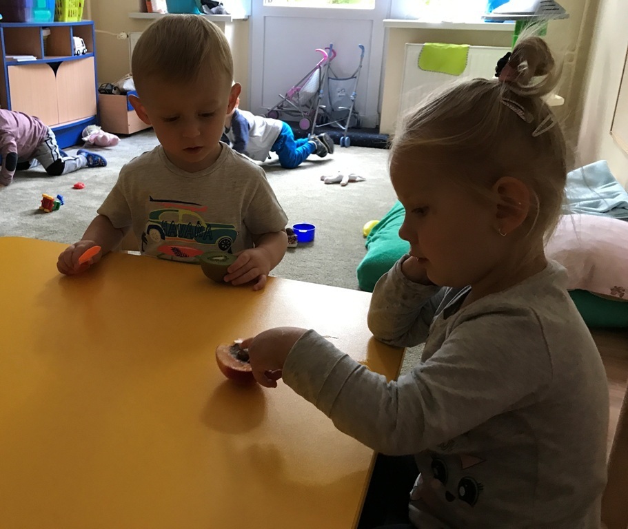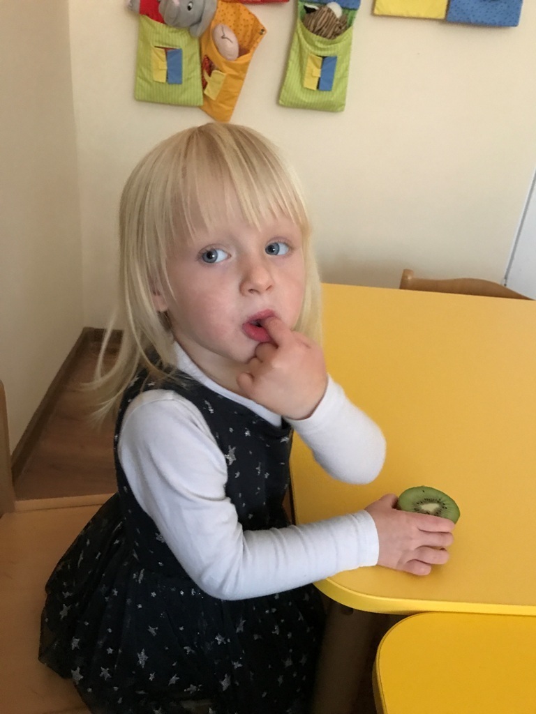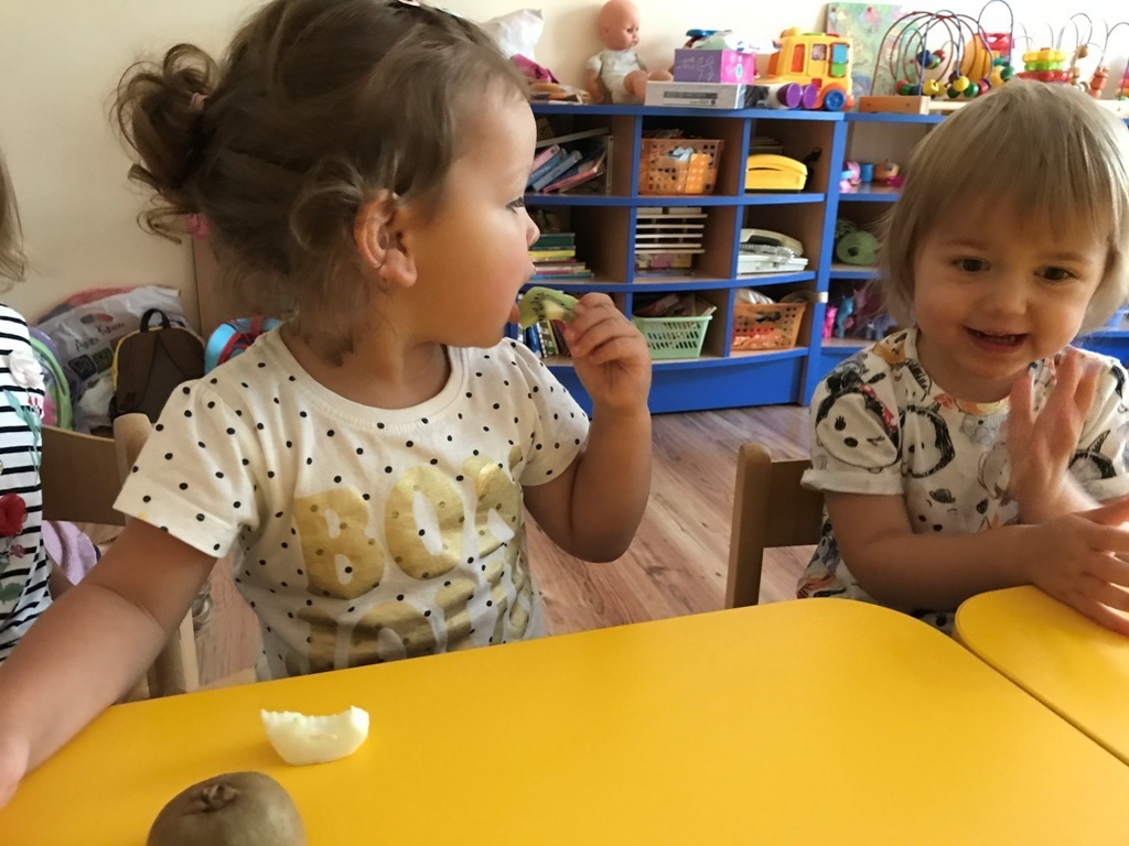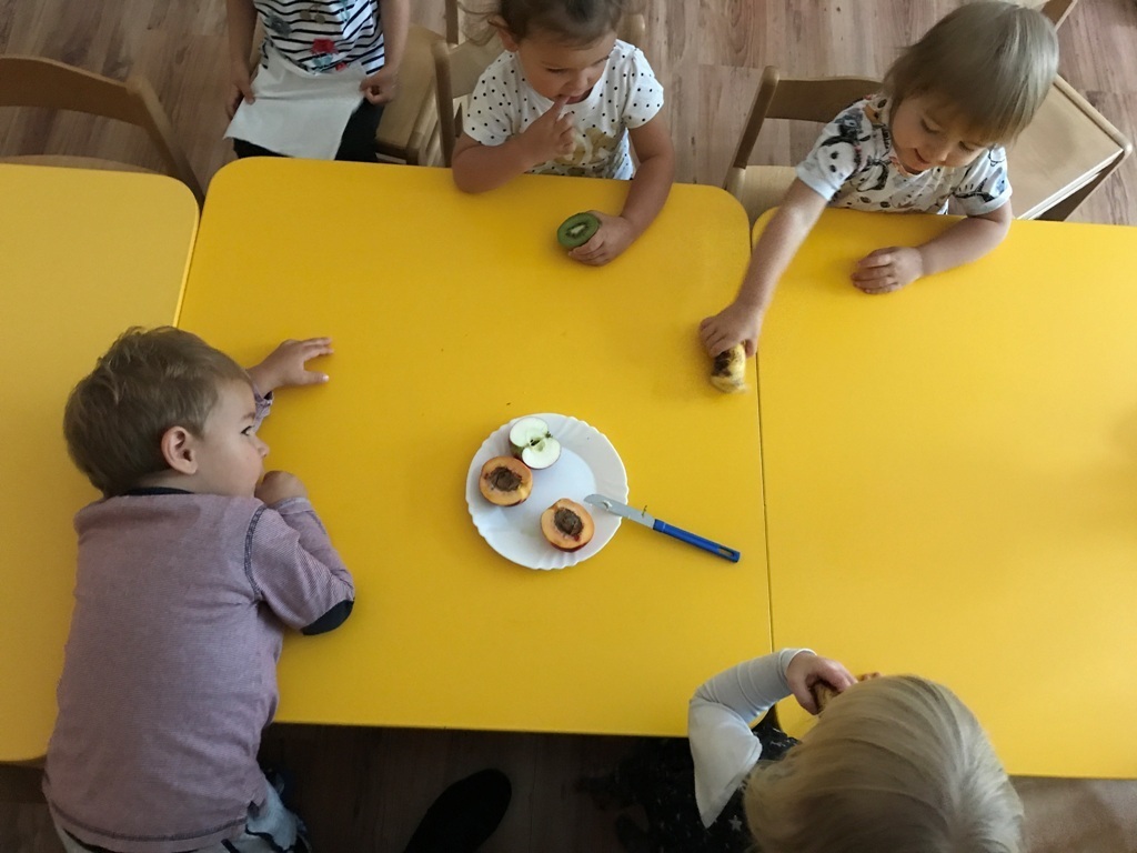 Nasze najmłodsze przedszkolaki – Smerfy rozpoczęły swoją wielką przygodę. Poznając nowe miejsca będą uczyły się też wielu nowych i ciekawych rzeczy. Dziś rozpoczęliśmy zajęcia ze smakami i zapachami różnych owoców. Maluszki z zainteresowaniem obserwowały, dotykały, wąchały i w końcu zjadały: banana, jabłko, nektarynkę i kiwi. Dzięki tym owocom poznały kolory: żółty, czerwony, zielony oraz smaki: słodki i kwaśny, oraz co jest gładkie a co szorstkie. Celem tej zabawy było również przełamywanie niechęci do próbowania nowych rzeczy, co większości się udało.
