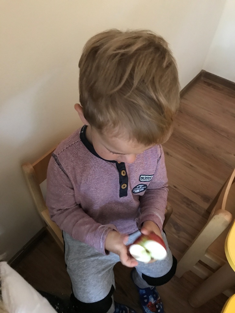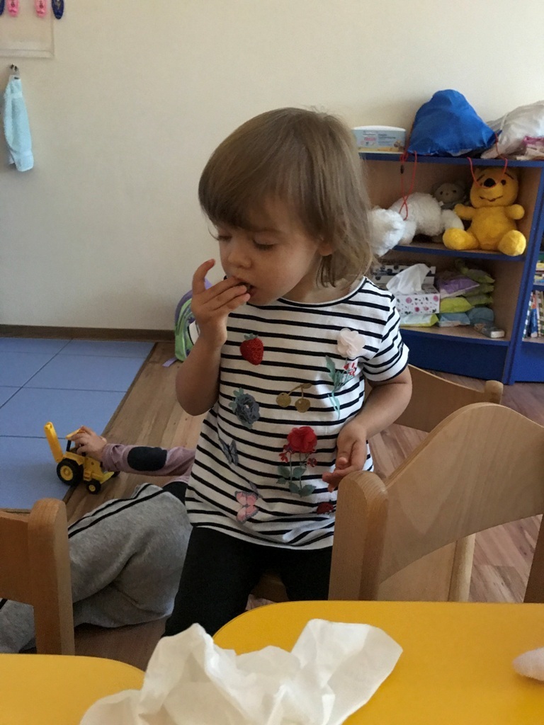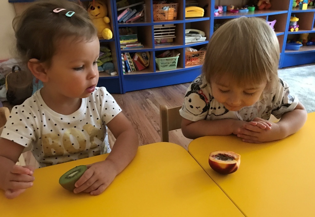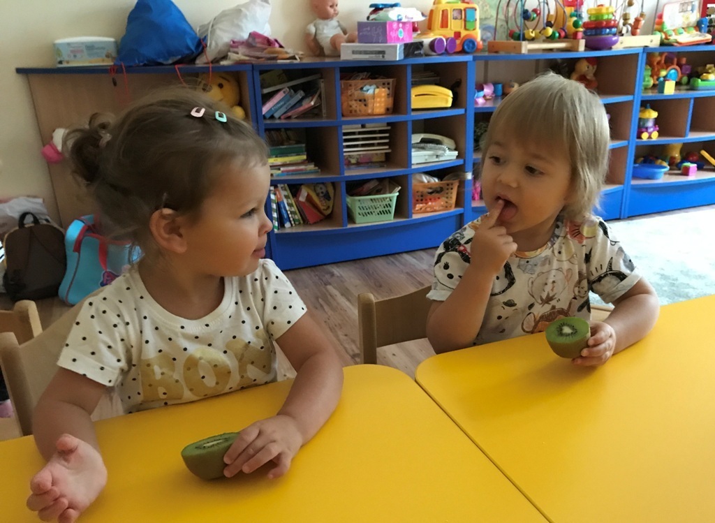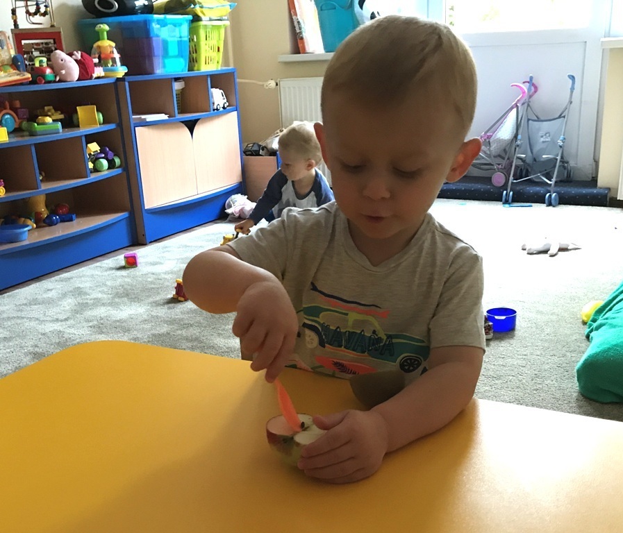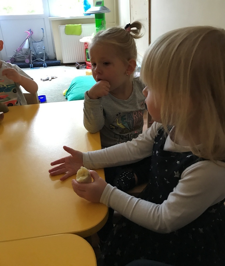Nasze najmłodsze przedszkolaki – Smerfy rozpoczęły swoją wielką przygodę. Poznając nowe miejsca będą uczyły się też wielu nowych i ciekawych rzeczy. Dziś rozpoczęliśmy zajęcia ze smakami i zapachami różnych owoców. Maluszki z zainteresowaniem obserwowały, dotykały, wąchały i w końcu zjadały: banana, jabłko, nektarynkę i kiwi. Dzięki tym owocom poznały kolory: żółty, czerwony, zielony oraz smaki: słodki i kwaśny, oraz co jest gładkie a co szorstkie. Celem tej zabawy było również przełamywanie niechęci do próbowania nowych rzeczy, co większości się udało.