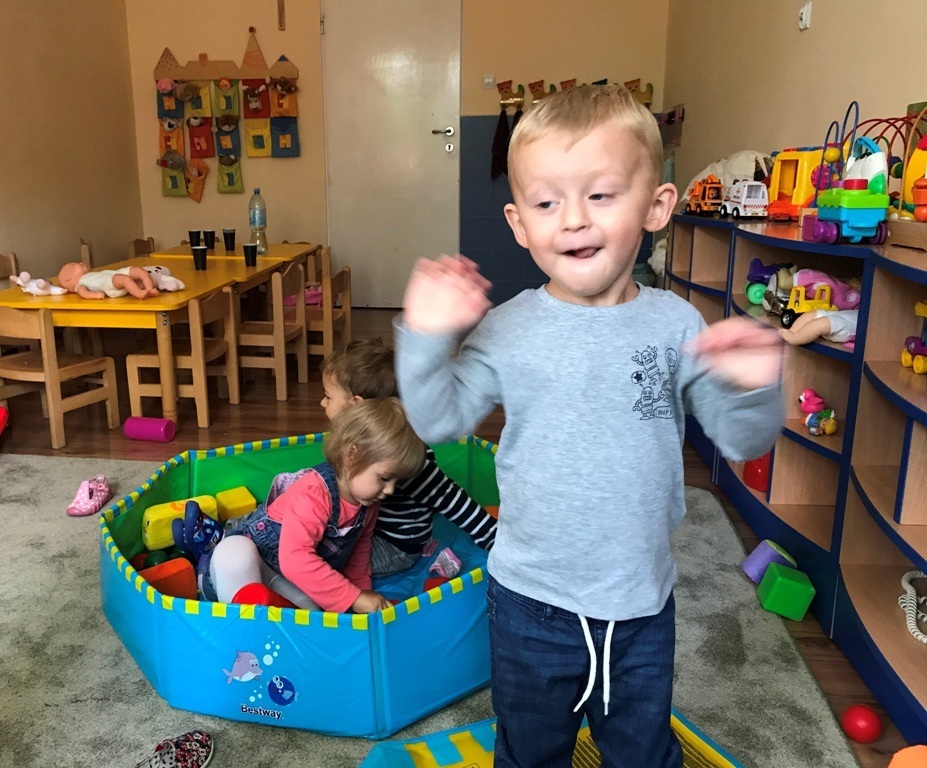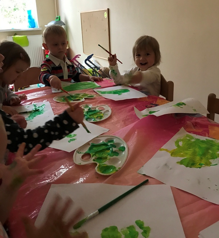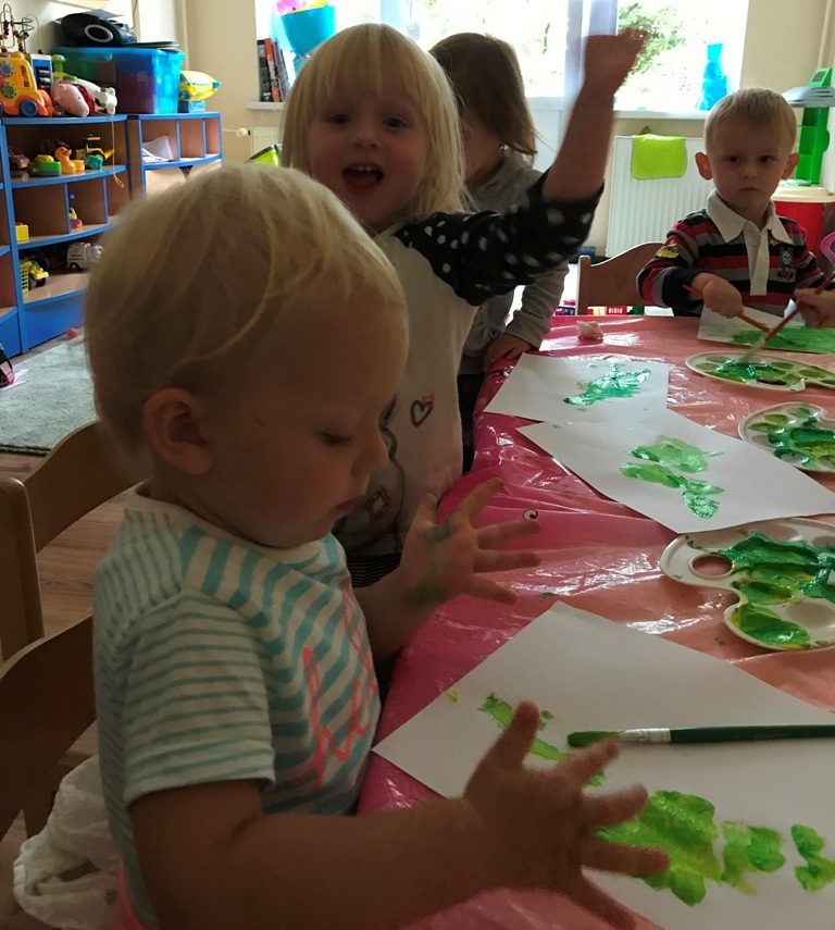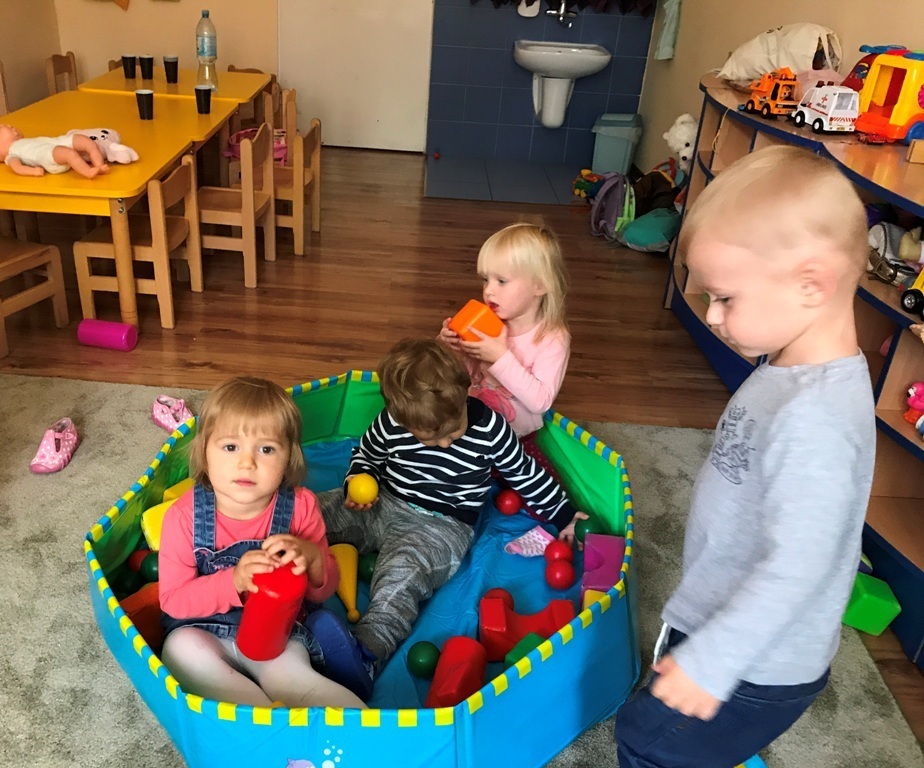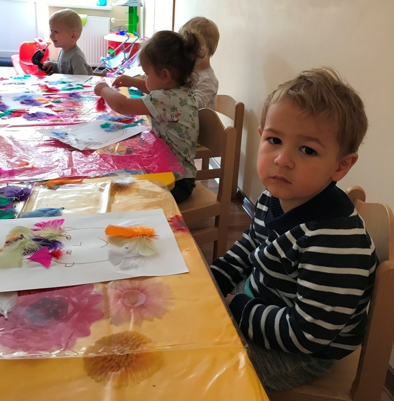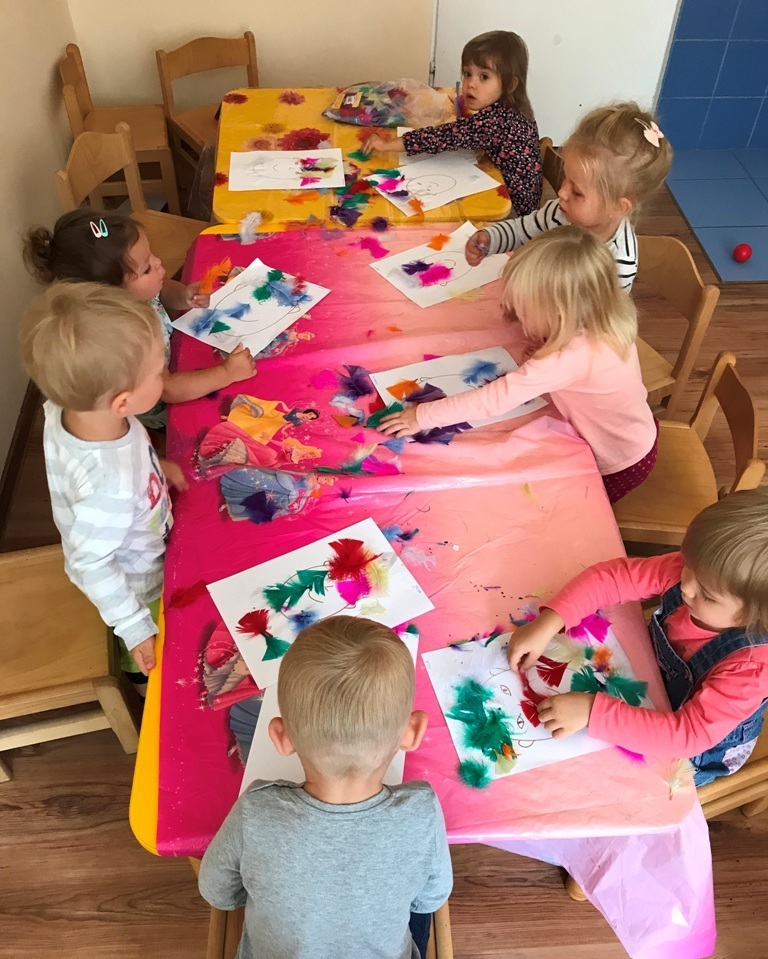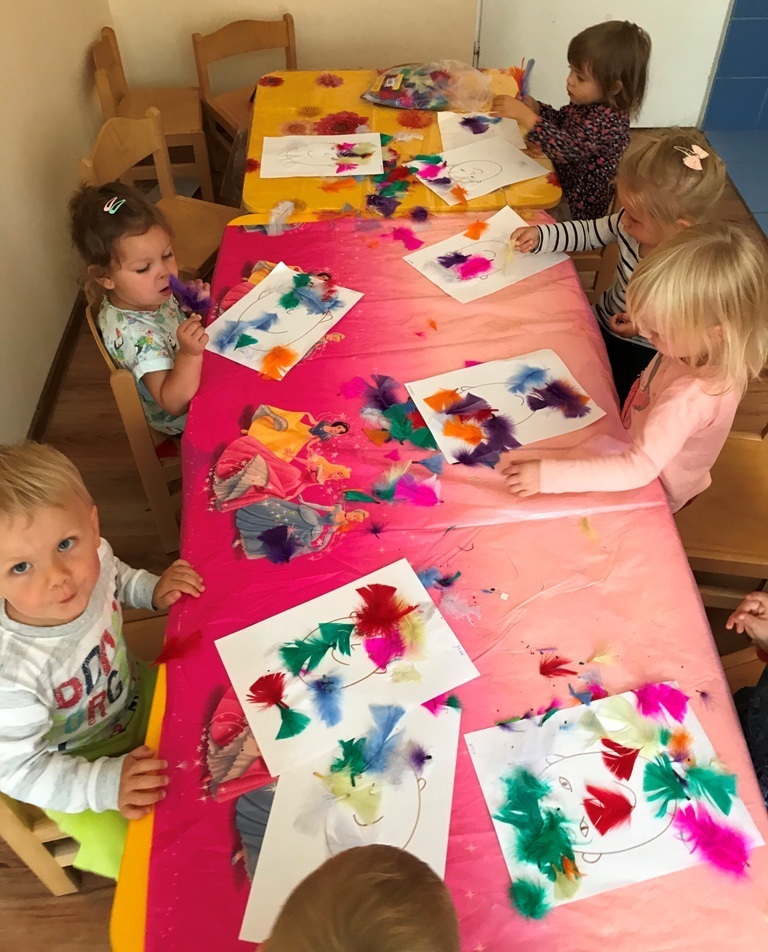 Grupa Smerfów coraz lepiej czuje się w swoim towarzystwie, to też zabawy dzieci są coraz śmielsze. Dziś postanowiliśmy wykonać kolorowe prace plastyczne wykorzystując do tego kolorowe piórka oraz klej w sztyfcie. Wszystkie Smerfy z radością wykonały zadanie. W nagrodę za trud, który włożyły w powierzoną pracę - bawiły się w nową zabawę „kąpiel”, w kulkowym basenie. Jęków zachwytu oraz pisków zadowolenia było co niemiara.
