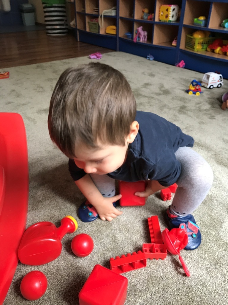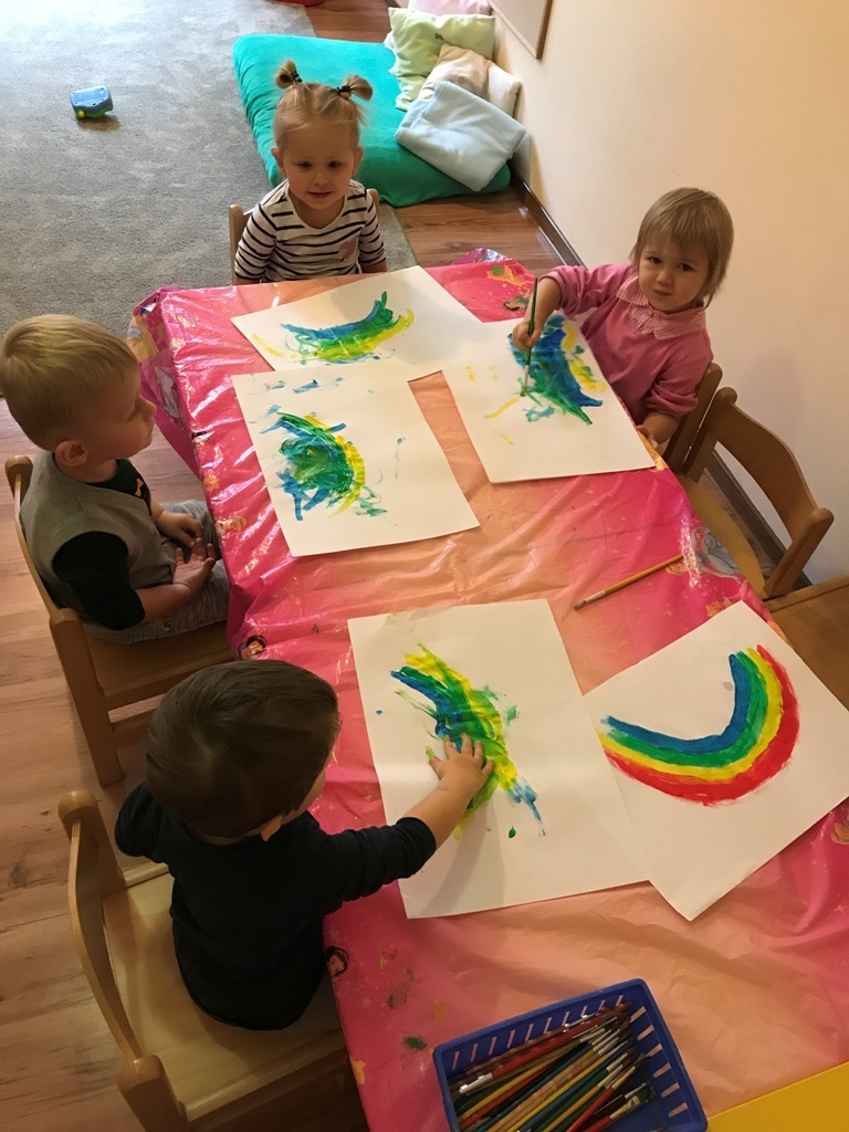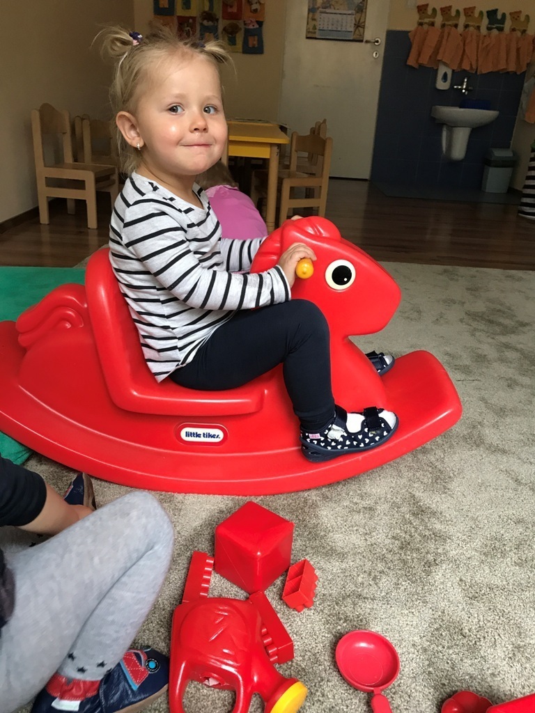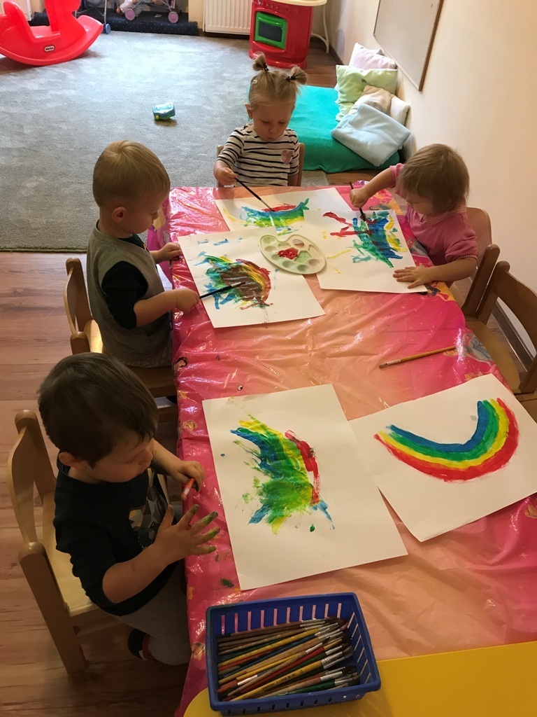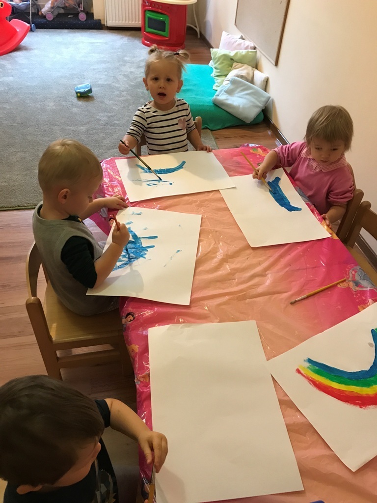 Ponury poranek grupa Smerfów pomalowała kolorami tęczy. Maluszki rozpoczęły kolejną przedszkolną przygodę – tym razem zawitały do świata barw. Zobaczyły kolory: niebieski, zielony, czerwony i żółty. Samodzielnie namalowały swoje wersje tęczy. Smerfy stały się poszukiwaczami czerwonych przedmiotów znajdujących się w naszej sali. Klocki, samochody, produkty spożywcze czy bujak znalazły się na liście czerwonych skarbów. Następnym razem jeśli będzie potrzeba znów zaczarujemy pogodę, tyle że na słoneczne kolory.