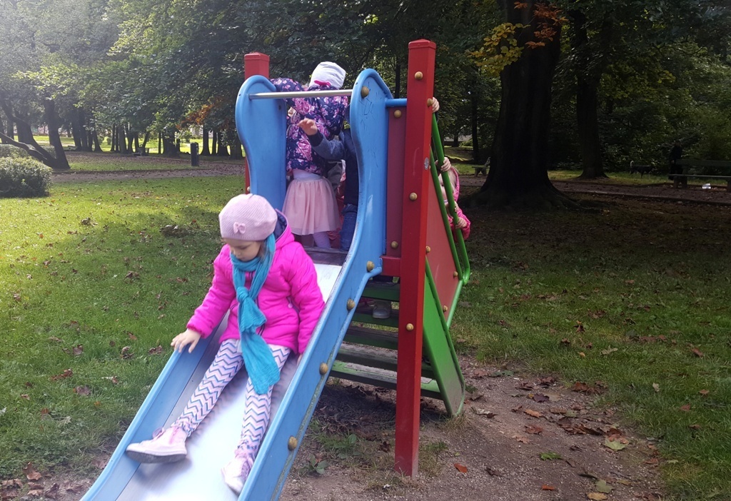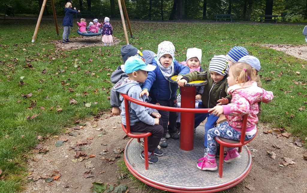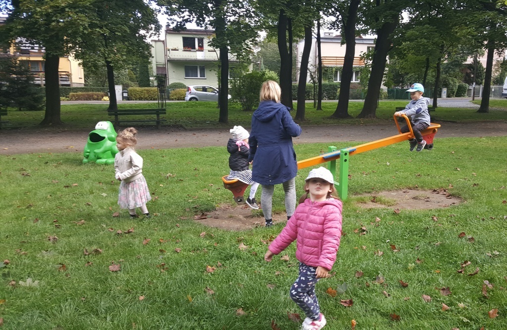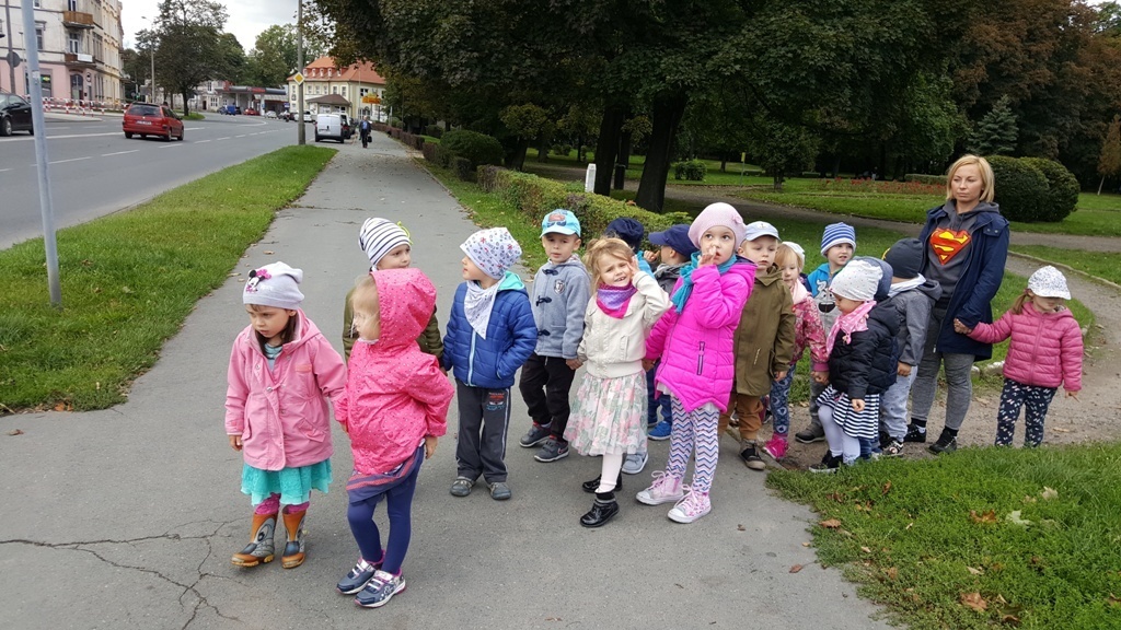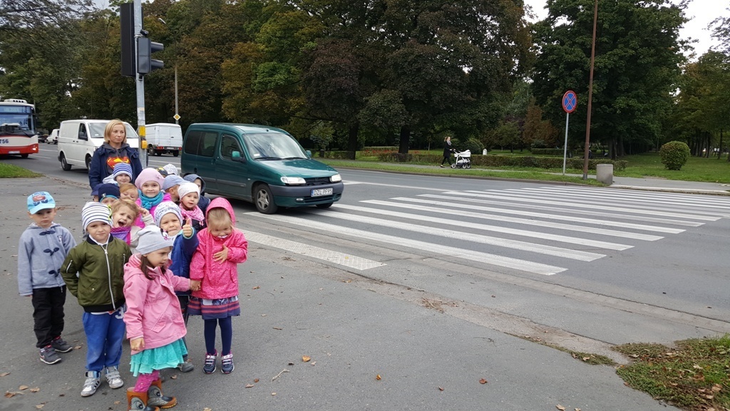 Aby utrwalić wiedzę o zasadach bezpiecznego poruszania się po mieście w szczególności z korzystania z przejść dla pieszych z sygnalizacji świetlnej, wzięliśmy udział w zajęciach pt. "Na ulicy" zorganizowanych w terenie. Zajęcia odbywały się na jednym z najbardziej ruchliwych skrzyżowań w mieści. Po ich zakończeniu w nagrodę za pilną naukę udaliśmy się na pobliski plac zabaw, gdzie miło spędziliśmy czas dzielący nas od obiadu.