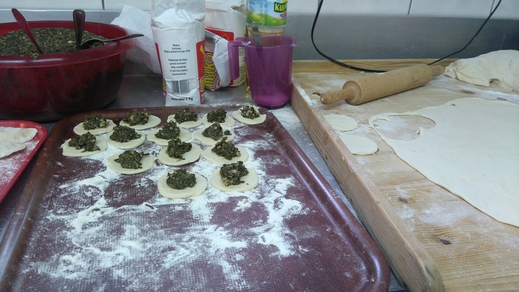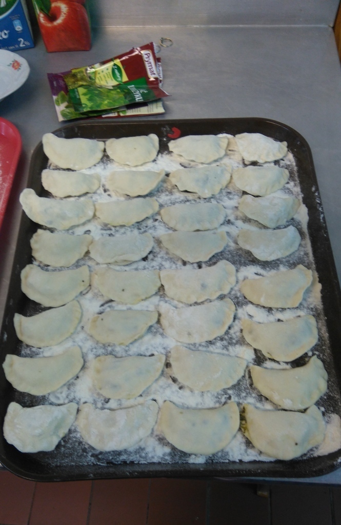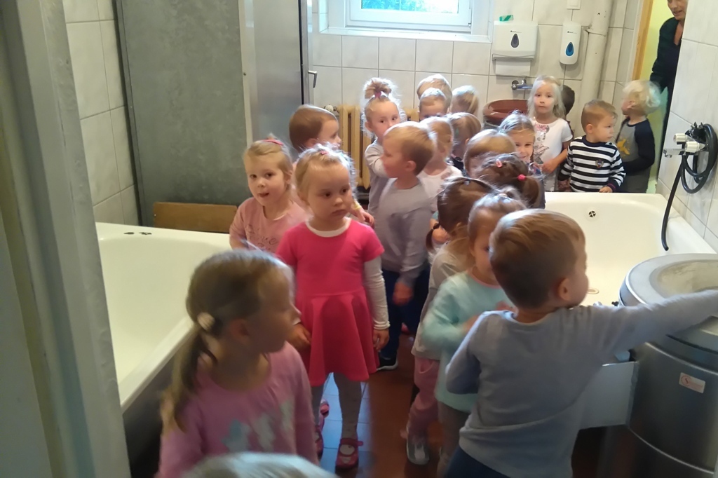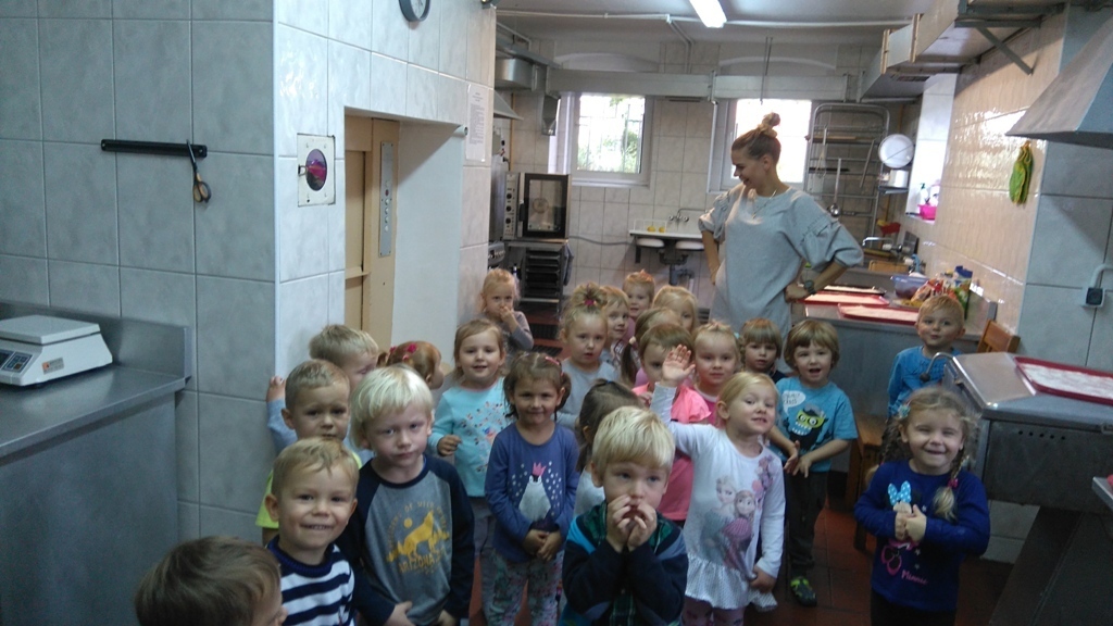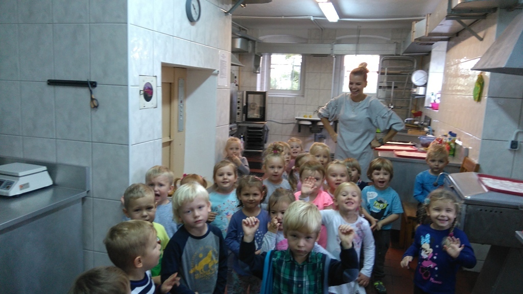 Dzisiejszy spacer był trochę inny niż do tej pory. Odwiedziliśmy w naszym przedszkolu pewne miejsce, którego jeszcze nie poznaliśmy, a jest bardzo interesujące. Panie pracujące w kuchni pokazały nam na czym polega zawód – kucharza i jaką pracę wykonują. Zademonstrowały nam, jak się robi dla nas obiad: pierogi, gdzie i jak gotuje się zupę, piecze ciastka na drugie śniadanko i do czego służą wszystkie urządzenia w tym miejscu. Teraz już wiemy, gdzie są przyrządzane wszystkie pyszności, które zjadamy w przedszkolu.