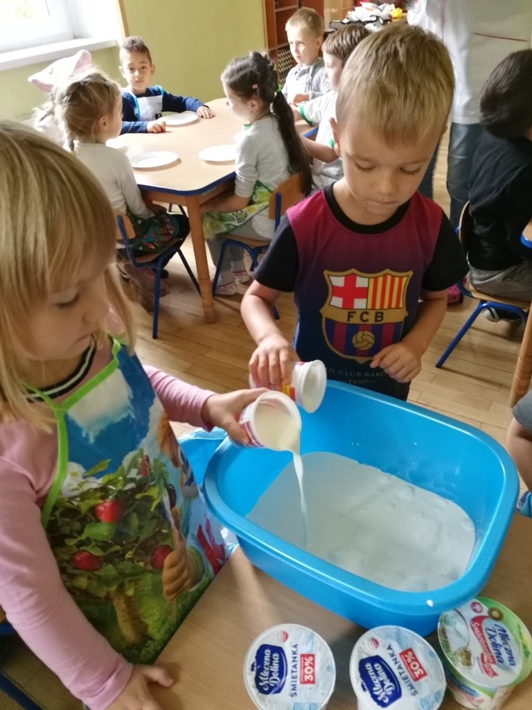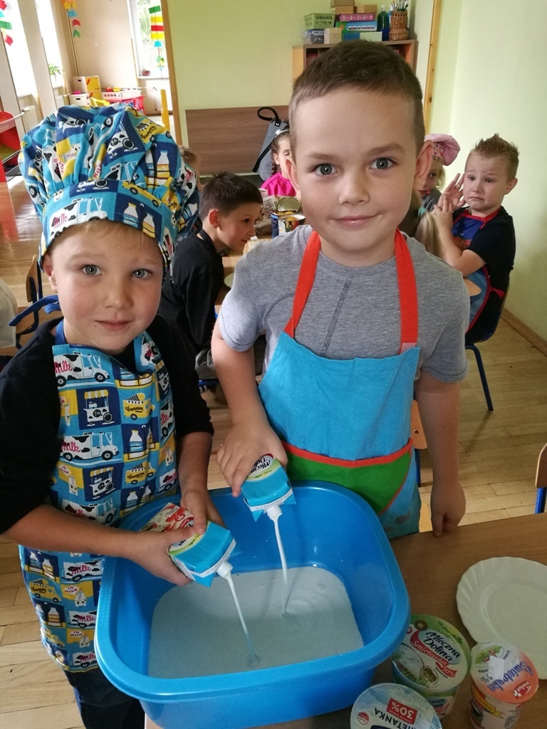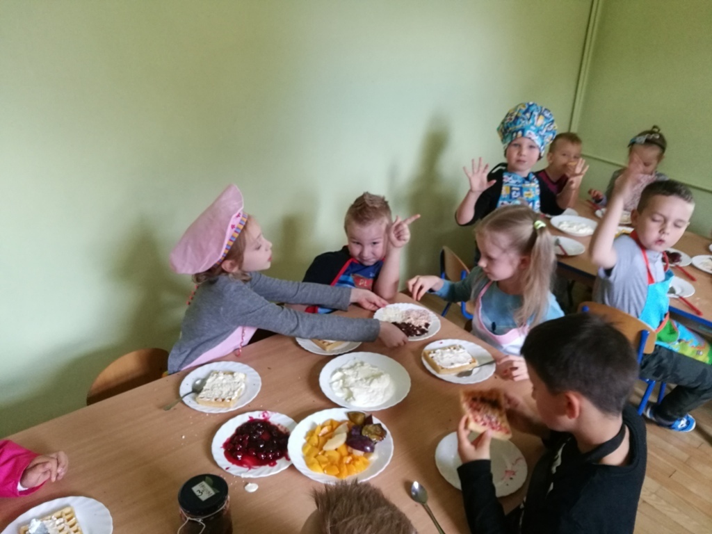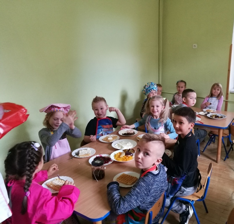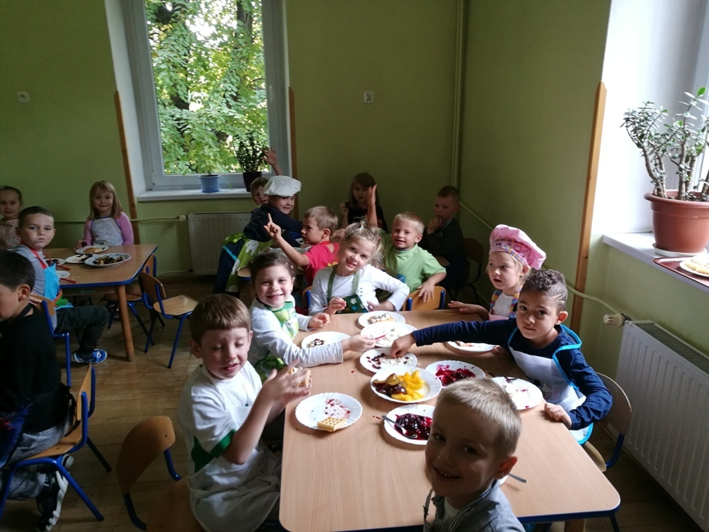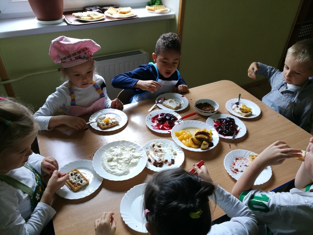 W tym roku szkolnym kontynuujemy naszą przygodę z "Kuchcikowem". Dzieci z wielką radością przystąpiły do zajęć zwłaszcza, że ich tematem były "Wakacyjne wspomnienia", a dzieci przygotowywały gofry z bitą śmietaną i owocami. Już na sam widok składników dzieciom ciekła ślinka, a co dopiero powiedzieć jak będą gotowe. Wszyscy ochoczo zabrali się do pracy: ubijania śmietany, krojenia owoców. Gdy przyszedł czas jedzenia w sali zrobiło się bardzo cicho i nie dlatego, że dzieci pisały w ćwiczeniach ale dlatego, że tak były zajęte jedzeniem, nikt nie chciał powiedzieć ani jednego słowa. Wszyscy stwierdziliśmy, ze bardzo lubimy tak wspominać wakacje.