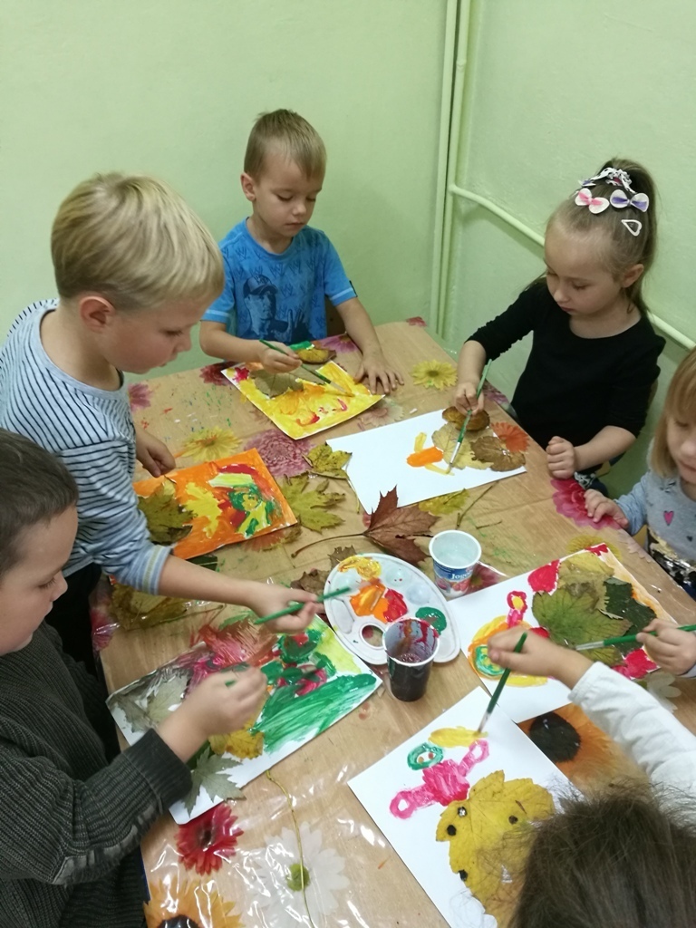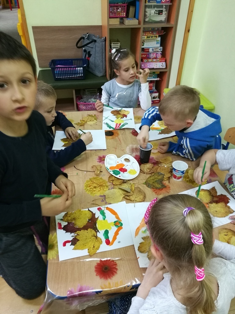 Dzieci z najstarszej grupy uwielbiają bawić się na dworze. Często potem opowiadają co widziały, co je zaciekawiło?. I tym razem nie uszły naszej uwadze piękne kolorowe jesienne liście, które spadały na przedszkolne podwórko. Postanowiliśmy więc wykorzystać je i stworzyć jesienne kompozycje. Wykorzystując farbę, klej i liście - dzieci wykonały portret pani Jesieni, która u jednych miała długą, kolorową spódnicę, u innych sukienkę lub też inny fantastyczny strój. Prace wyszły tak piękne, że zostały powieszone w naszej sali byśmy mogli cieszyć się ich widokiem.