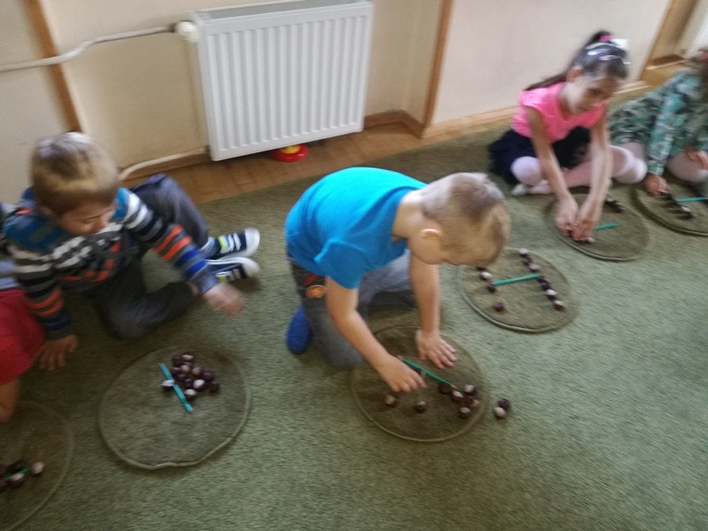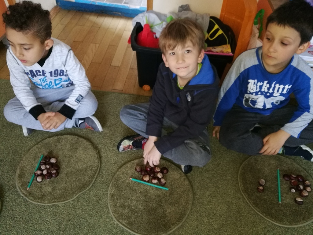 Przed starszakami nie lada wyczyn. By pójść do szkoły trzeb się do tego przygotować i oprócz literek poznać też musimy tajniki matematyki. Na ostatnich zajęciach uczyliśmy się określać ilość elementów w zbiorach. Wskazywaliśmy, gdzie tych elementów jest więcej, gdzie mniej, a gdzie tyle samo.Utrwaliliśmy też symbole matematyczne, które są znakami tych wartości. Całą zabawę zaczęliśmy z kasztanami, wygodniej jest nam na nich liczyć i są przyjemne z w dotyku. Natomiast już na koniec posługiwaliśmy się już cyframi, odpowiednimi symbolami. Grupa V to bardzo bystre i mądre dzieci, bez problemu poradziły sobie z rozwiązaniem nawet najtrudniejszych zadań.