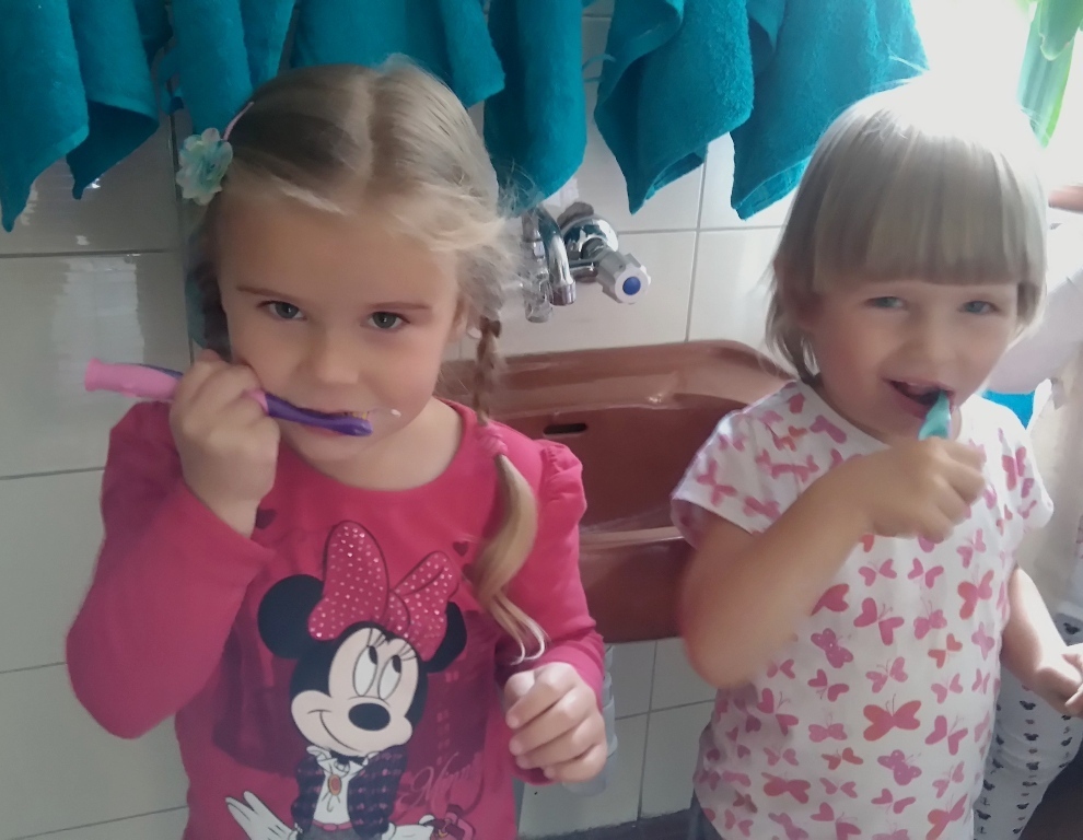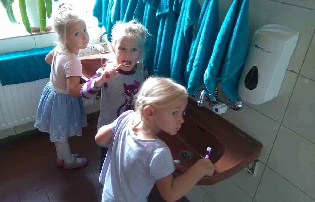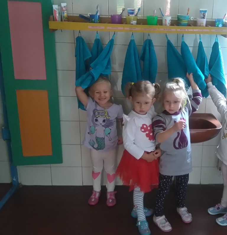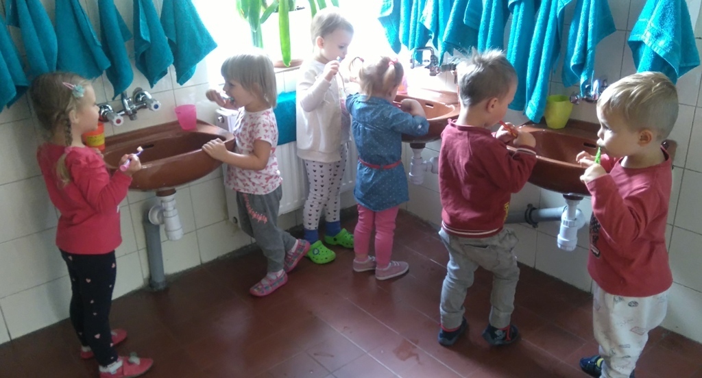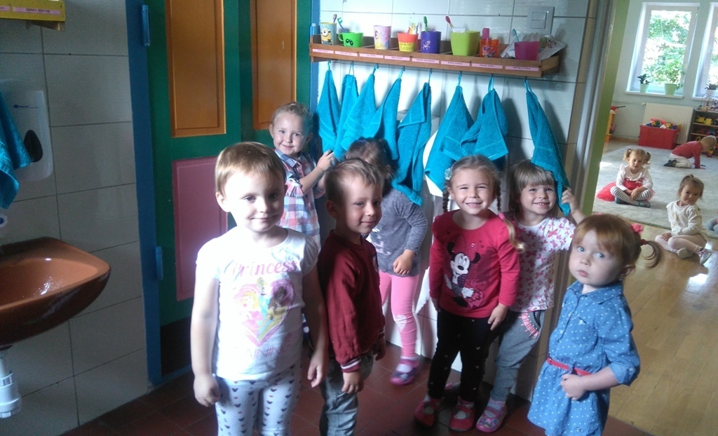 Na dzisiejszych zajęciach poznaliśmy zasady korzystania z łazienki, która znajduje się w naszej sali i z której będziemy codzienne korzystali. Poznaliśmy miejsce, gdzie znajduje się nasz kubeczek, szczoteczka, ręcznik a także pierwszy raz w tym roku umyliśmy zęby.