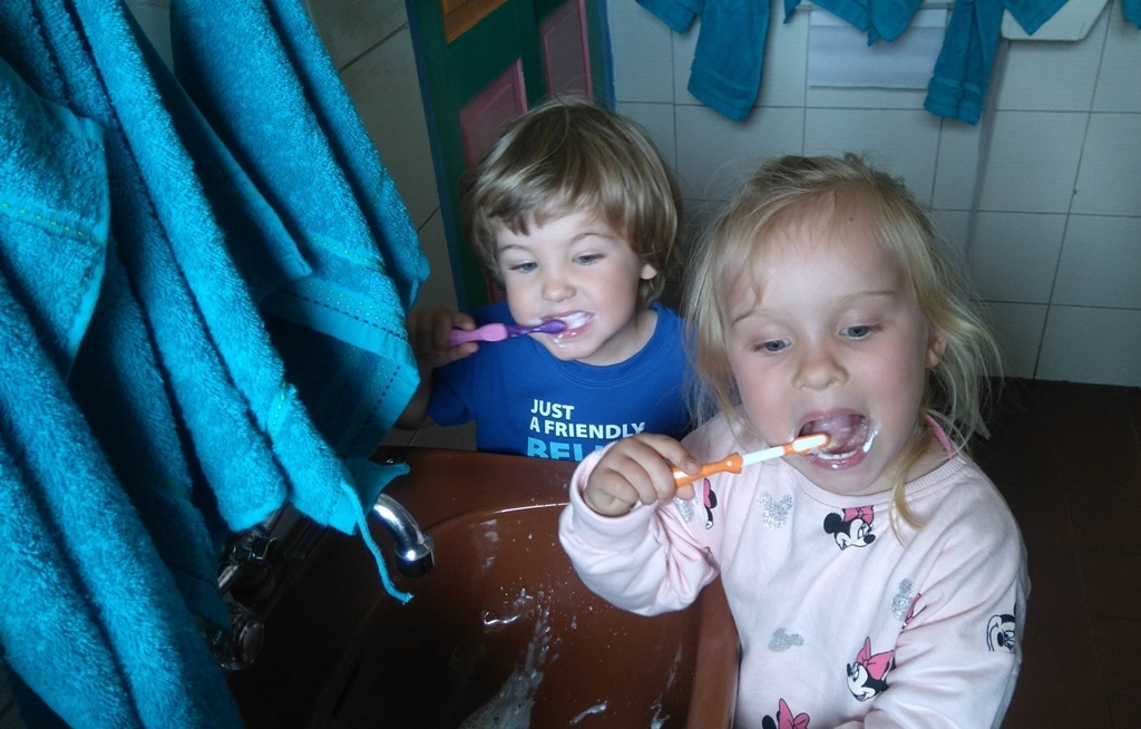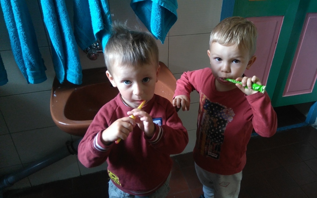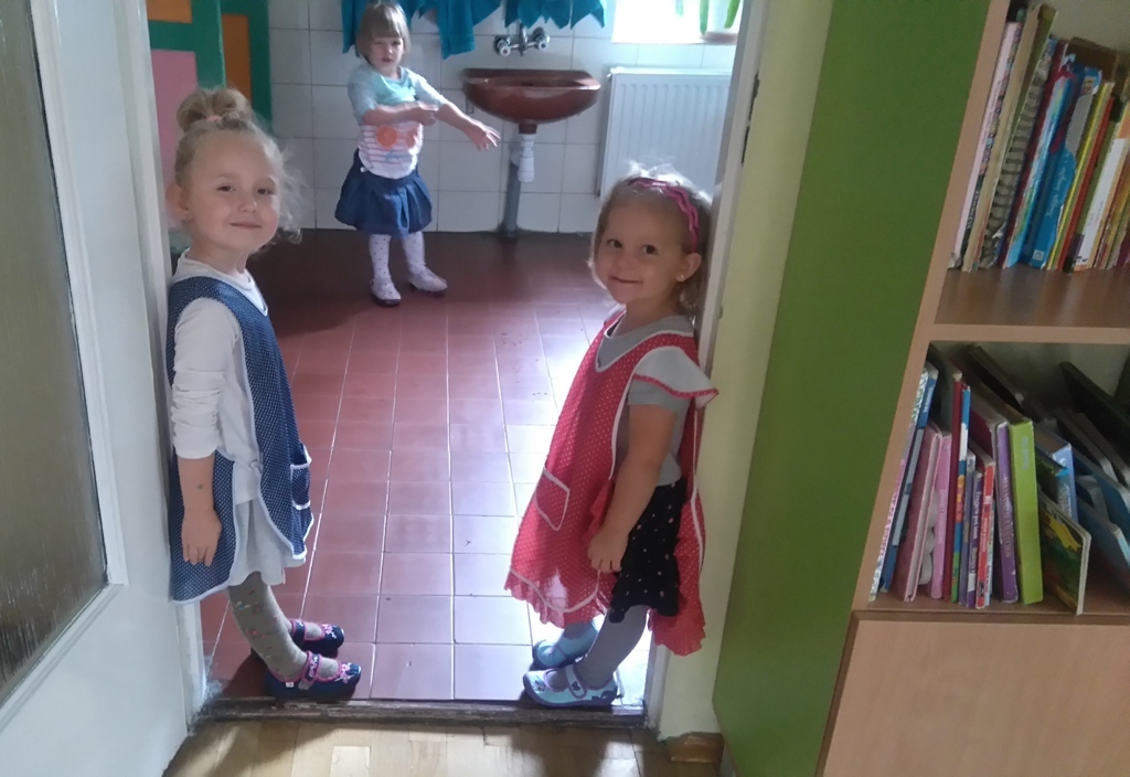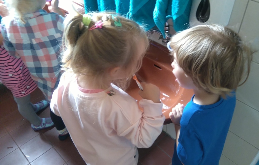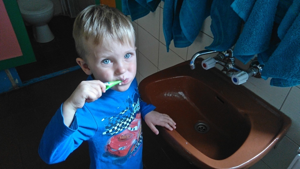 Na dzisiejszych zajęciach poznaliśmy zasady korzystania z łazienki, która znajduje się w naszej sali i z której będziemy codzienne korzystali. Poznaliśmy miejsce, gdzie znajduje się nasz kubeczek, szczoteczka, ręcznik a także pierwszy raz w tym roku umyliśmy zęby.