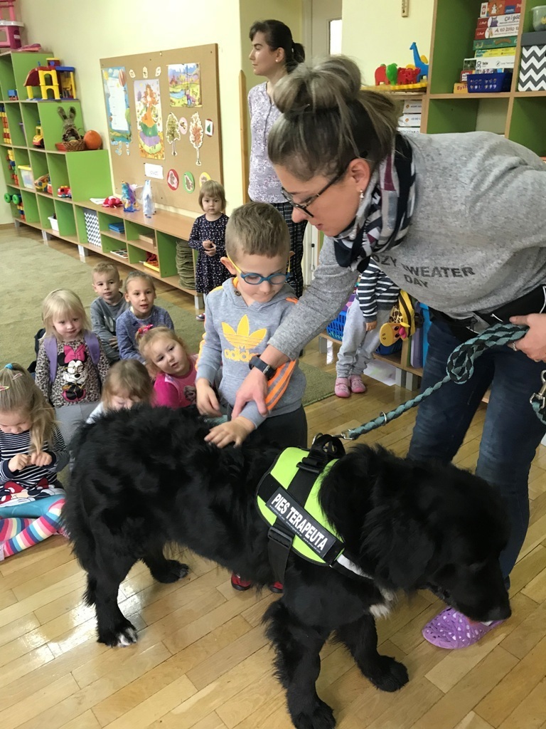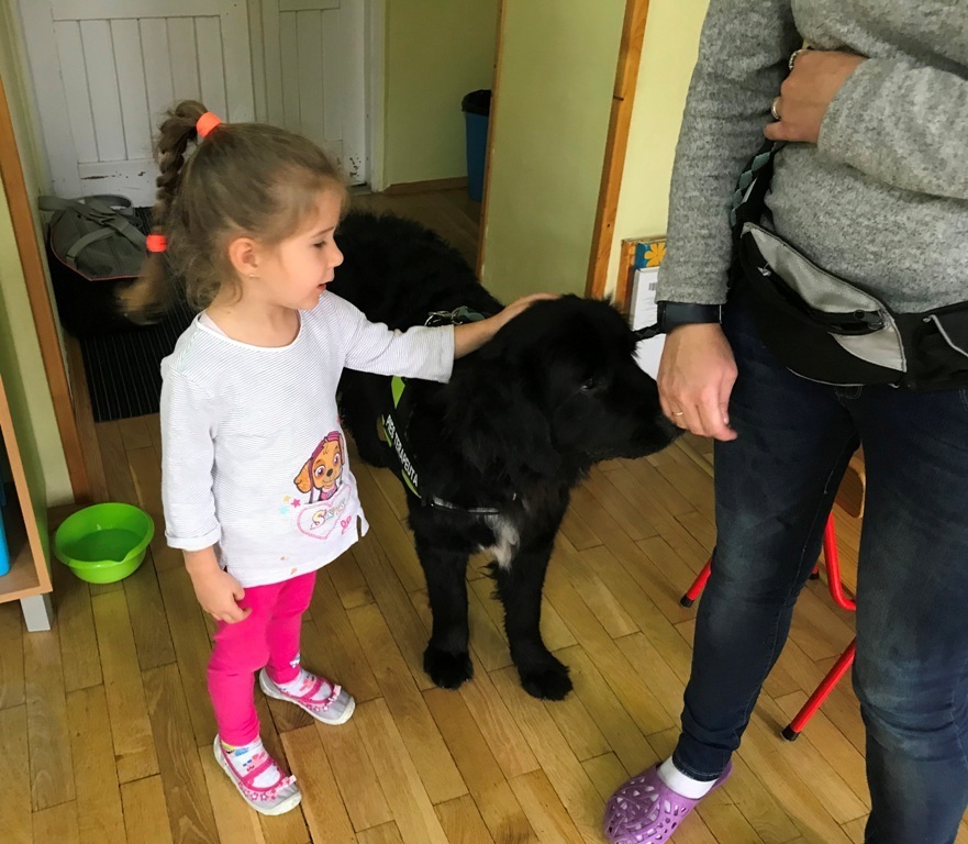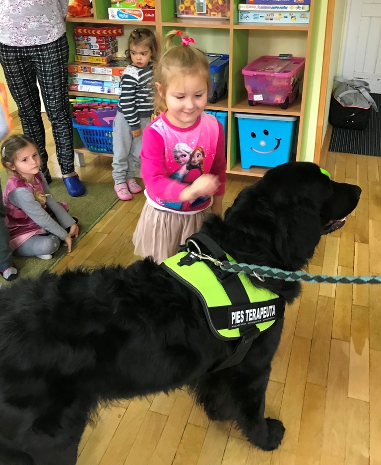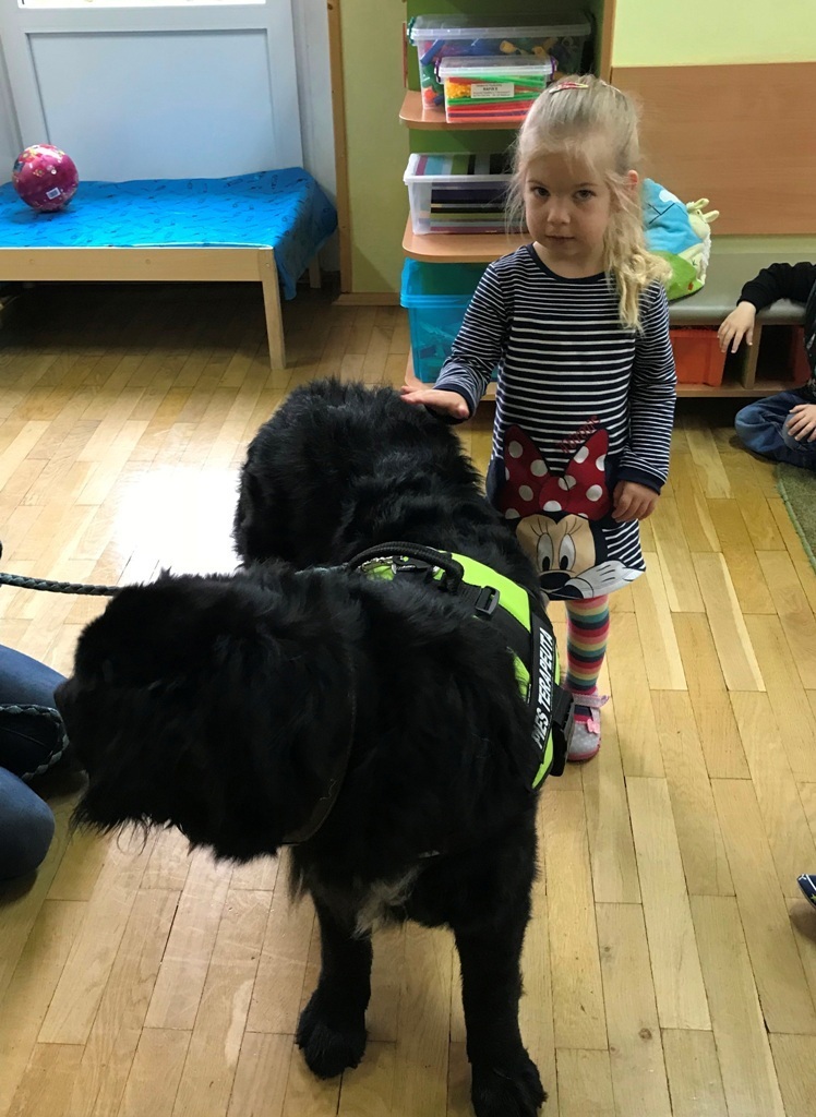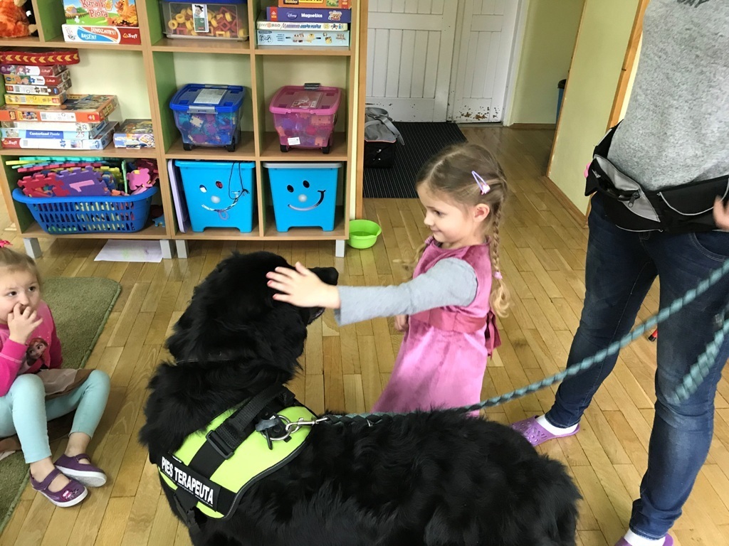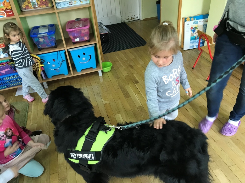 Piękny czarny nowofundland odwiedził dziś grupę I i grupę II. Żeby przy pierwszym spotkaniu z psim terapeutą maluszki poczuły się pewniej asystowały im dzielne średniaczki z gr.III. Dzieci wspólnie przypomniały sobie a niektóre poznały dopiero, zasady bezpiecznego zachowania się w obecności obcego psa. Każde z dzieci nauczyło się stawać w pozycji tzw. "drzewa" oraz w pozycji "żółwia". Wszystkie dzieci zostały poinstruowane przez panią Martę - opiekunkę Lenki w jakich miejscach najlepiej głaskać psa, a których miejsc należy unikać. Szkoda, że zajęcia tak szybko minęły. Z niecierpliwością będziemy wyczekiwać następnych.