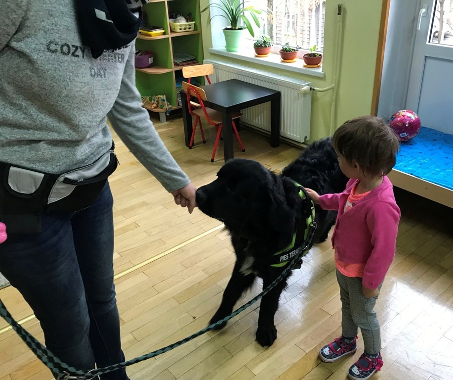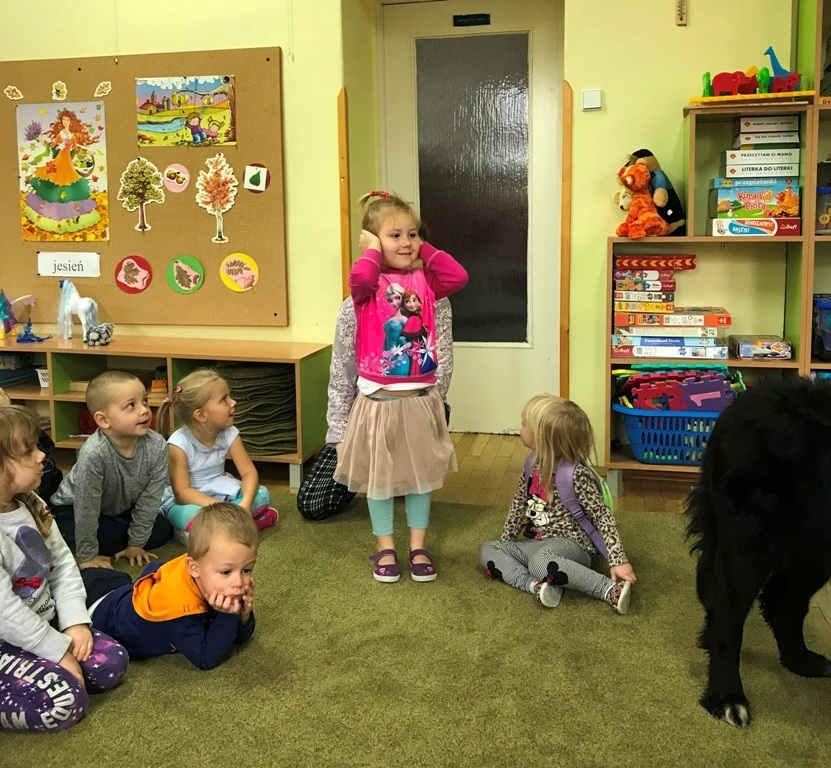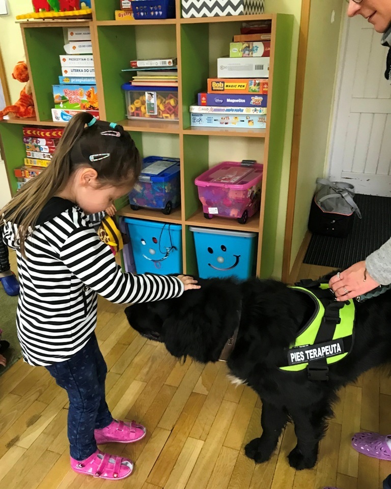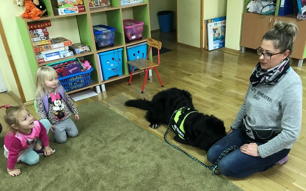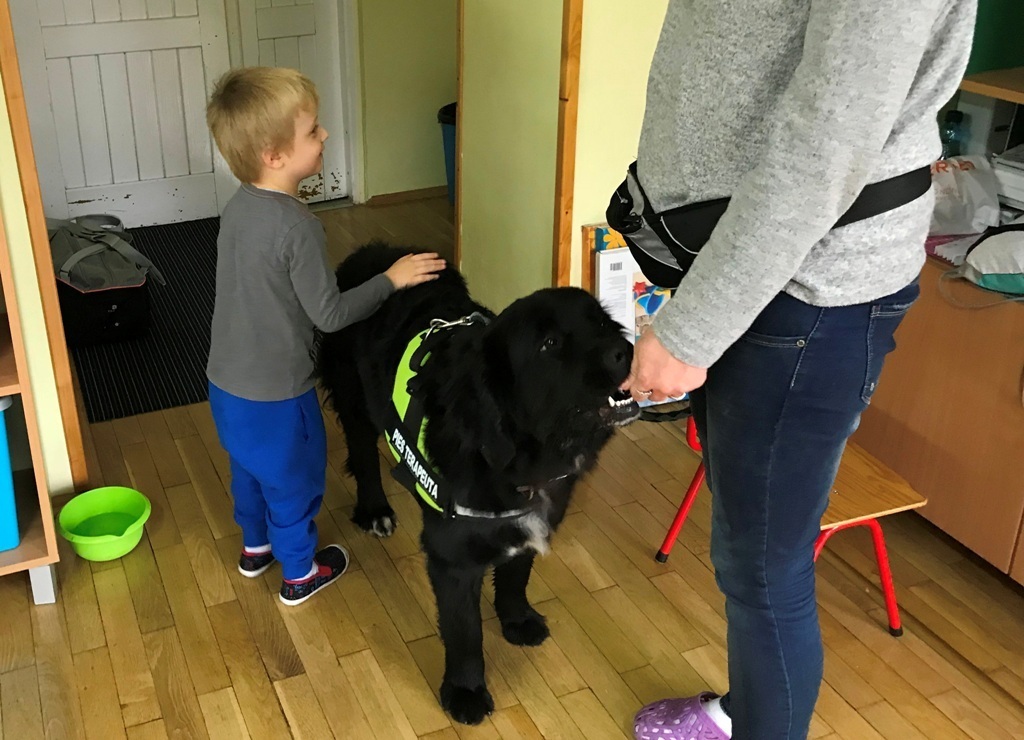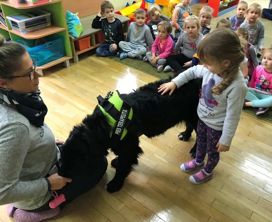 Piękny czarny nowofundland odwiedził dziś grupę I i grupę II. Żeby przy pierwszym spotkaniu z psim terapeutą maluszki poczuły się pewniej asystowały im dzielne średniaczki z gr.III. Dzieci wspólnie przypomniały sobie a niektóre poznały dopiero, zasady bezpiecznego zachowania się w obecności obcego psa. Każde z dzieci nauczyło się stawać w pozycji tzw. "drzewa" oraz w pozycji "żółwia". Wszystkie dzieci zostały poinstruowane przez panią Martę - opiekunkę Lenki w jakich miejscach najlepiej głaskać psa, a których miejsc należy unikać. Szkoda, że zajęcia tak szybko minęły. Z niecierpliwością będziemy wyczekiwać następnych.
