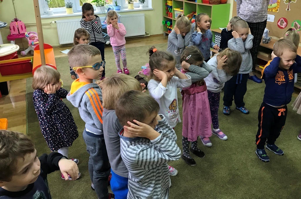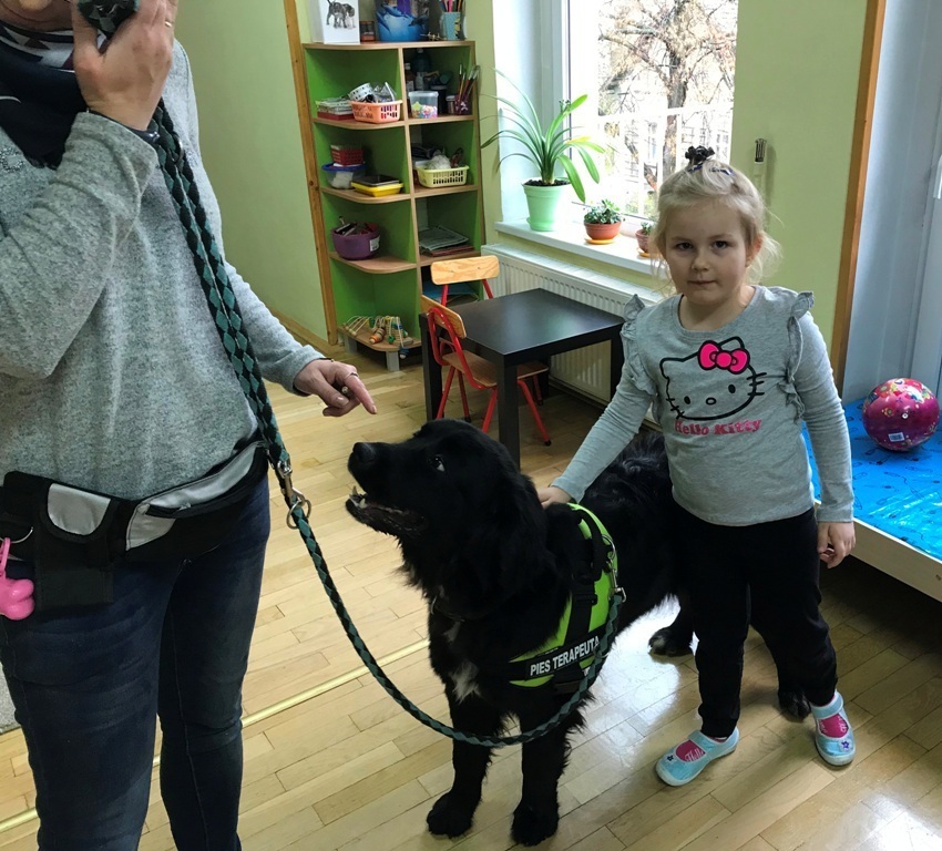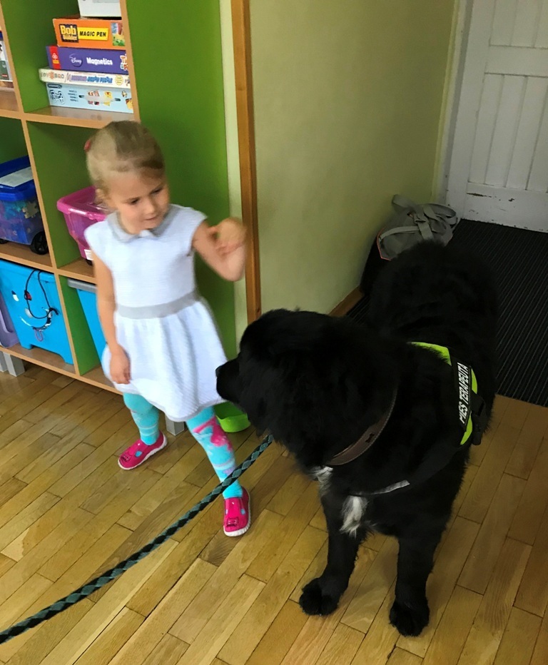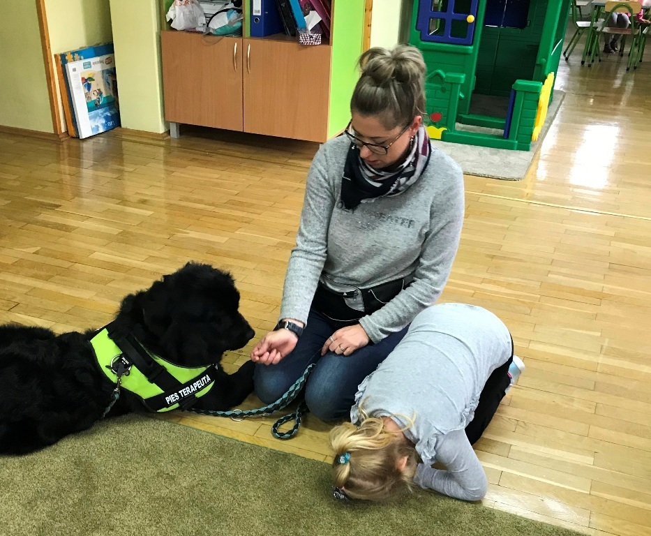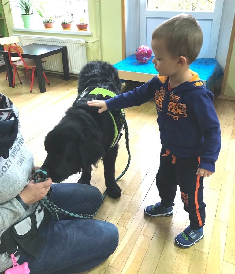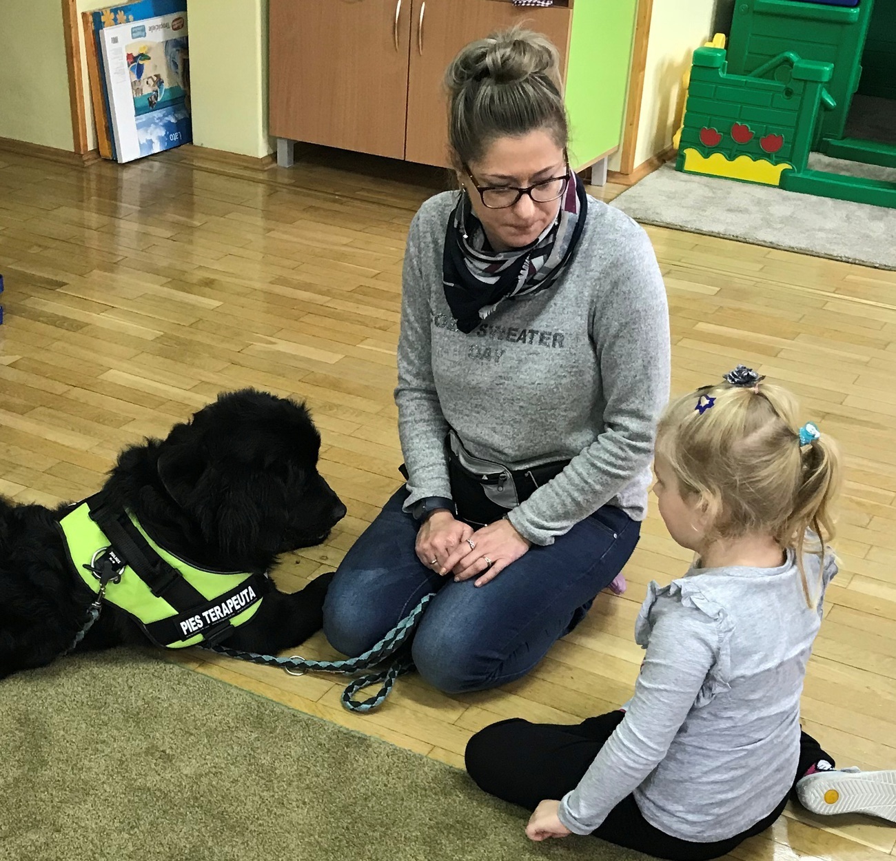 Piękny czarny nowofundland odwiedził dziś grupę I i grupę II. Żeby przy pierwszym spotkaniu z psim terapeutą maluszki poczuły się pewniej asystowały im dzielne średniaczki z gr.III. Dzieci wspólnie przypomniały sobie a niektóre poznały dopiero, zasady bezpiecznego zachowania się w obecności obcego psa. Każde z dzieci nauczyło się stawać w pozycji tzw. "drzewa" oraz w pozycji "żółwia". Wszystkie dzieci zostały poinstruowane przez panią Martę - opiekunkę Lenki w jakich miejscach najlepiej głaskać psa, a których miejsc należy unikać. Szkoda, że zajęcia tak szybko minęły. Z niecierpliwością będziemy wyczekiwać następnych.