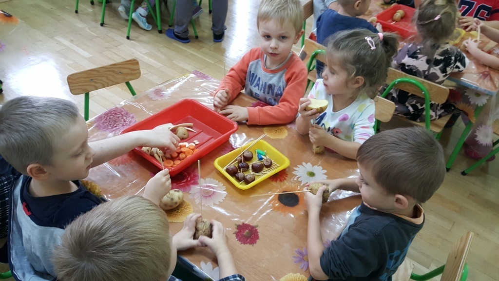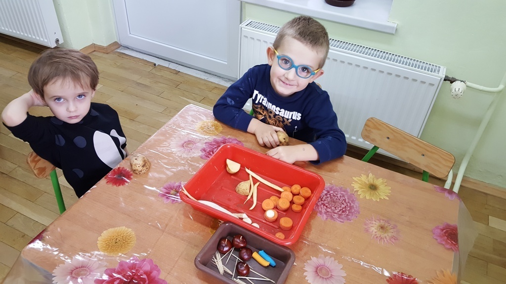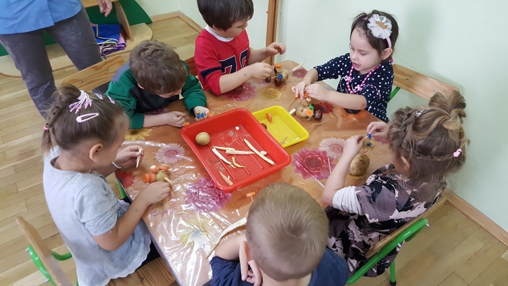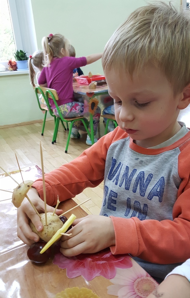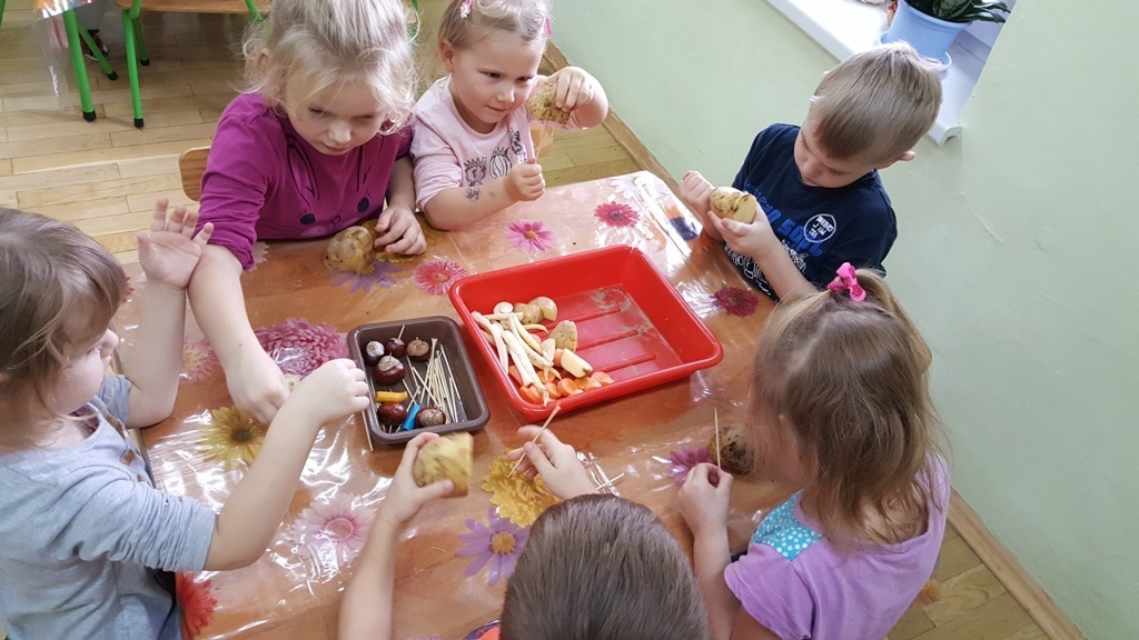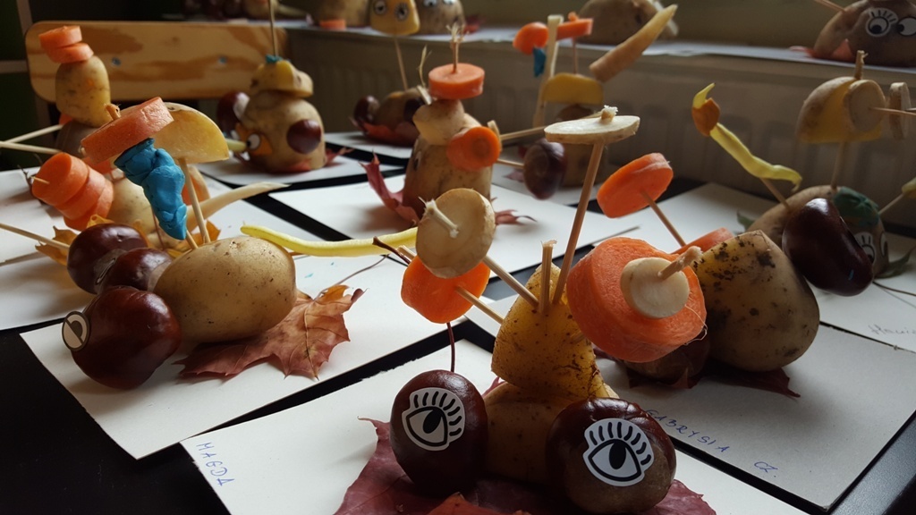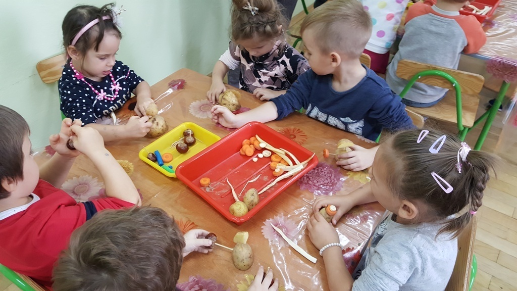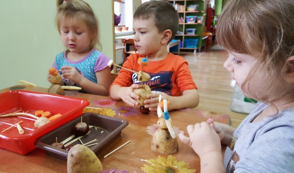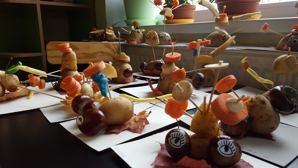 W poniedziałek 09 października Smyki rozwijały swą kreatywność oraz wyobraźnię, a także sprawność manualną poprzez zabawę z warzywami. Dzieci wykazały się ogromną pomysłowością, dzięki czemu powstało mnóstwo niepowtarzalnych ziemniaczanych stworków. Zabawa przy komponowaniu elementów wymagała dużej zręczności, jednak mali artyści świetnie sobie radzili. Efekty ich pracy można podziwiać na zdjęciach.