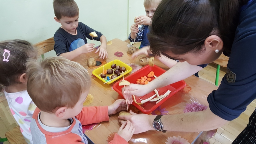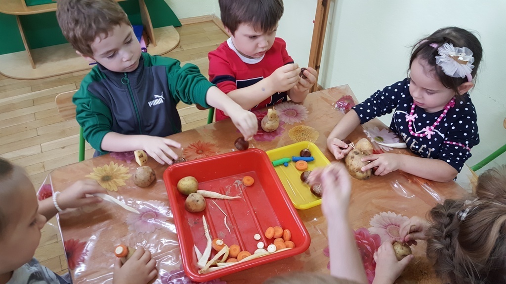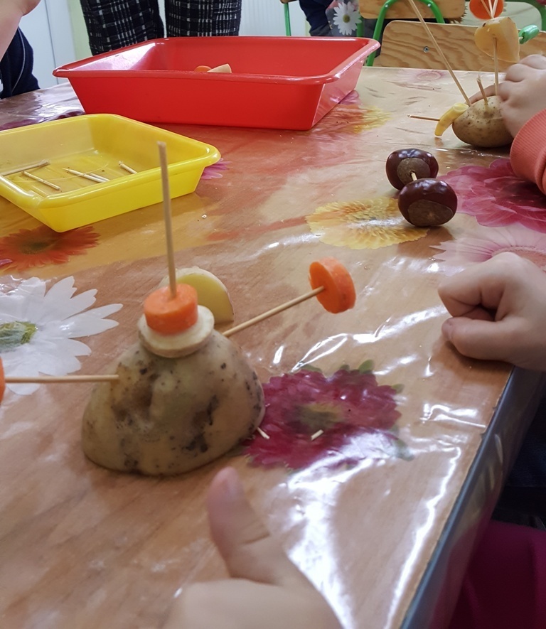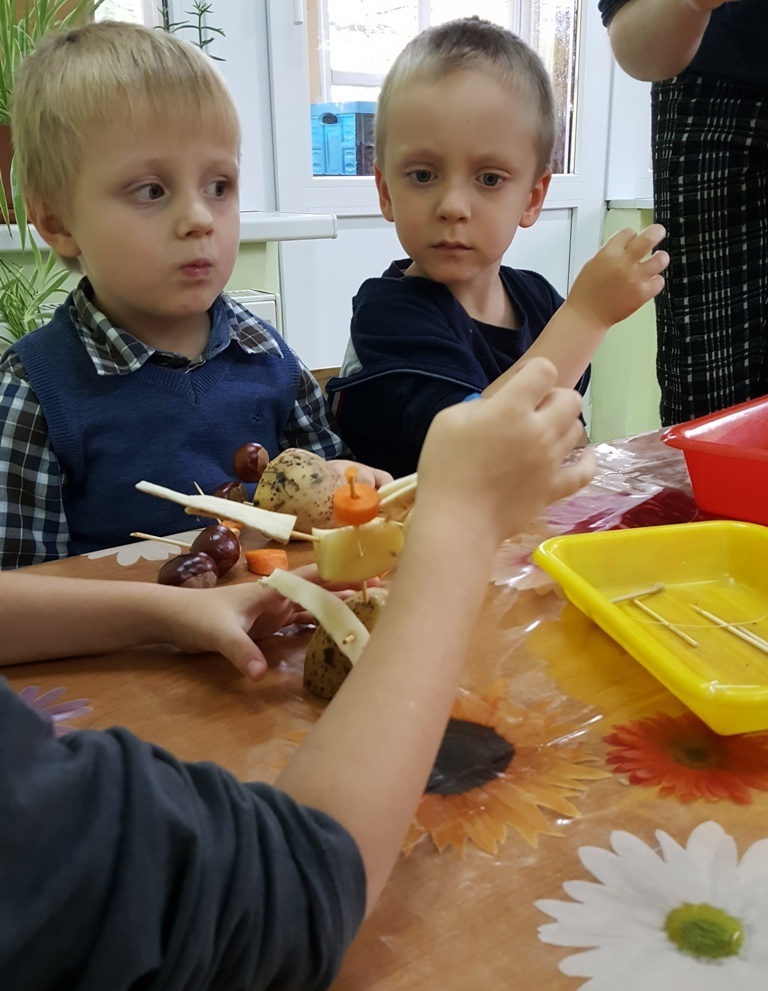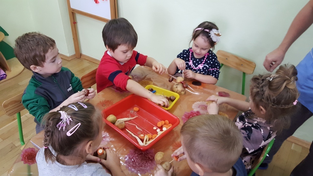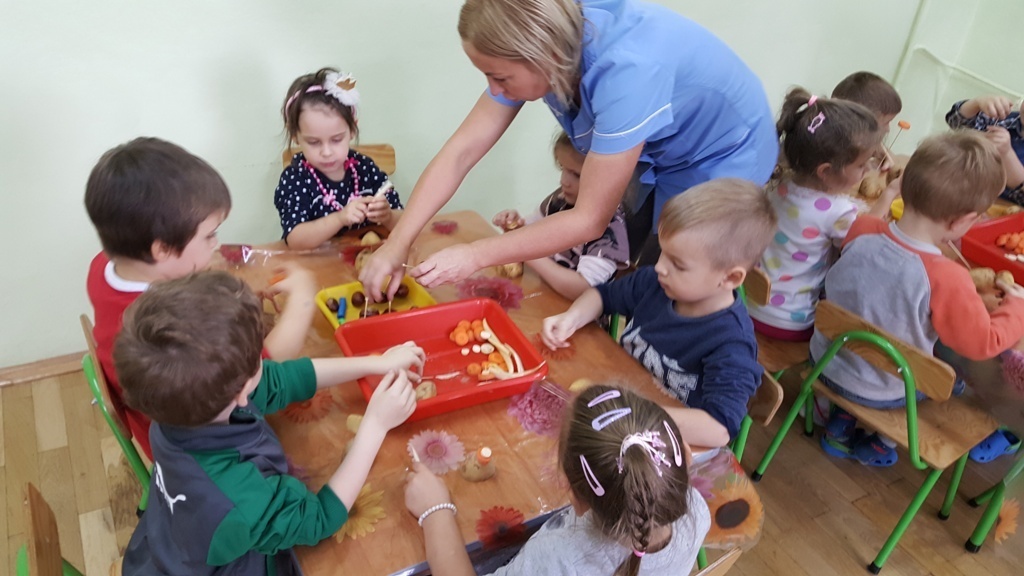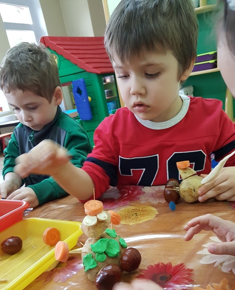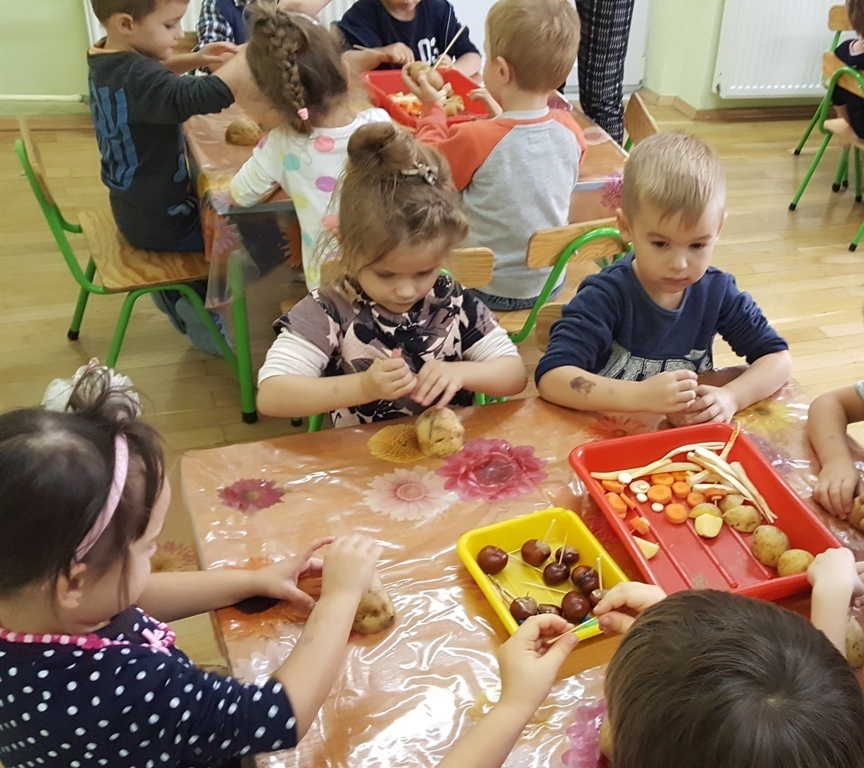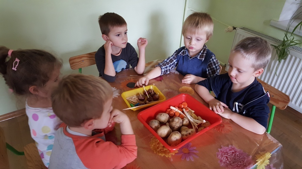 W poniedziałek 09 października Smyki rozwijały swą kreatywność oraz wyobraźnię, a także sprawność manualną poprzez zabawę z warzywami. Dzieci wykazały się ogromną pomysłowością, dzięki czemu powstało mnóstwo niepowtarzalnych ziemniaczanych stworków. Zabawa przy komponowaniu elementów wymagała dużej zręczności, jednak mali artyści świetnie sobie radzili. Efekty ich pracy można podziwiać na zdjęciach.