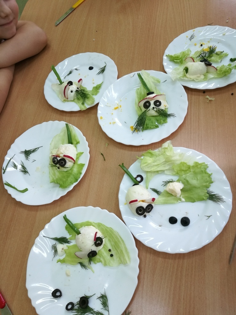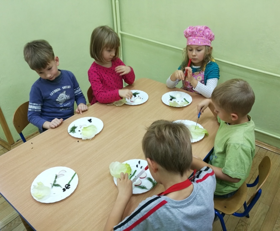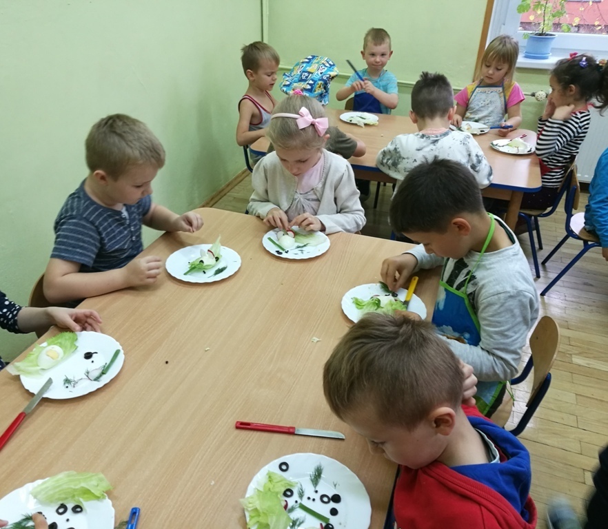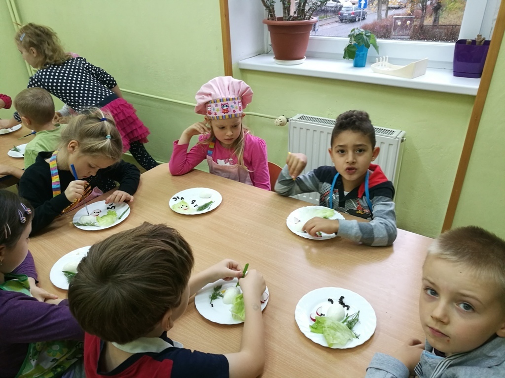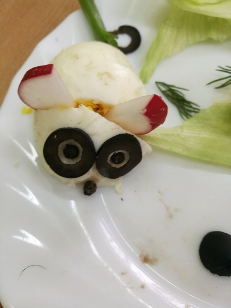 Starszaki bardzo lubią zajęcia praktyczne zwłaszcza te, na których można coś zjeść. W piątek w naszej grupie odbyły się kolejne zajęcia z cyklu "Kuchcikowo". Każde z dzieci przyniosło produkty potrzebne do wykonania „myszek". Nasze myszki miały rzodkiewkowe uszy, szczypiorkowe ogony, koperkowe wąsy a oczy zrobione były z oliwek i czarnego pieprzu. Do zrobienia brzuszków wykorzystaliśmy jajka ugotowane na twardo. Starszaki chętnie zabrały się do pracy, a w międzyczasie podgryzły przyniesione warzywa. Każda z przygotowanych myszek usiadła na zielonym liściu sałaty i czekała razem z dziećmi na drugie śniadanie. Po skończonej pracy przedszkolaki zgodnie stwierdziły, że nasze myszki to bohaterki jesiennej piosenki „... mała mysz, mała mysz biegnie na paluszkach, deszczowe koraliki zbiera do fartuszka...". Po jej odśpiewaniu tygrysy ochoczo zabrały się do zjedzenia drugiego śniadania i ... myszek też.