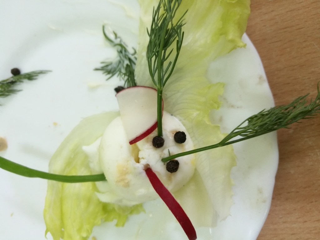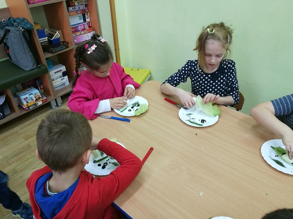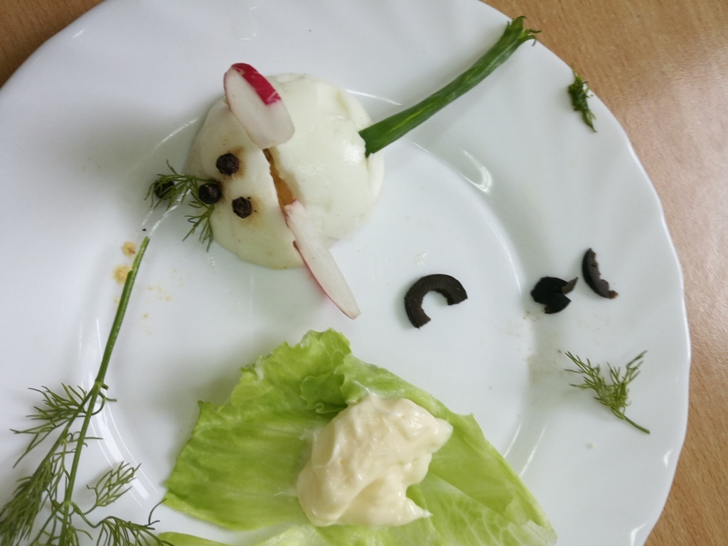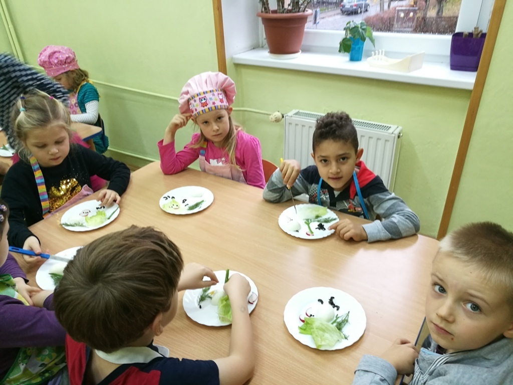 Starszaki bardzo lubią zajęcia praktyczne zwłaszcza te, na których można coś zjeść. W piątek w naszej grupie odbyły się kolejne zajęcia z cyklu "Kuchcikowo". Każde z dzieci przyniosło produkty potrzebne do wykonania „myszek". Nasze myszki miały rzodkiewkowe uszy, szczypiorkowe ogony, koperkowe wąsy a oczy zrobione były z oliwek i czarnego pieprzu. Do zrobienia brzuszków wykorzystaliśmy jajka ugotowane na twardo. Starszaki chętnie zabrały się do pracy, a w międzyczasie podgryzły przyniesione warzywa. Każda z przygotowanych myszek usiadła na zielonym liściu sałaty i czekała razem z dziećmi na drugie śniadanie. Po skończonej pracy przedszkolaki zgodnie stwierdziły, że nasze myszki to bohaterki jesiennej piosenki „... mała mysz, mała mysz biegnie na paluszkach, deszczowe koraliki zbiera do fartuszka...". Po jej odśpiewaniu tygrysy ochoczo zabrały się do zjedzenia drugiego śniadania i ... myszek też.