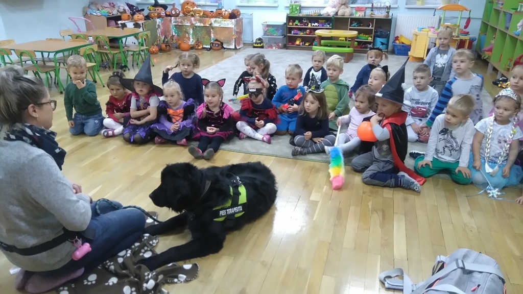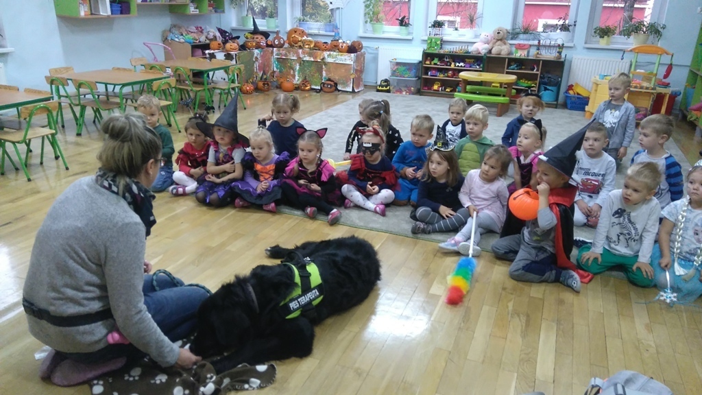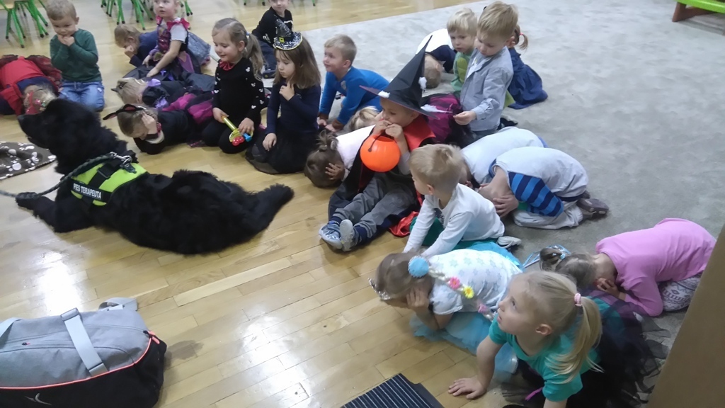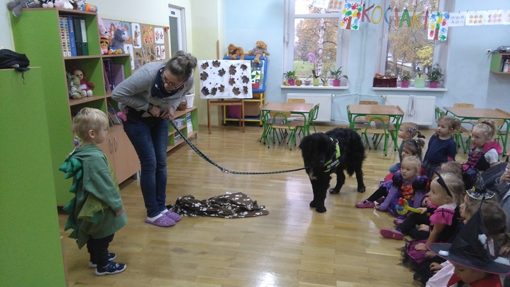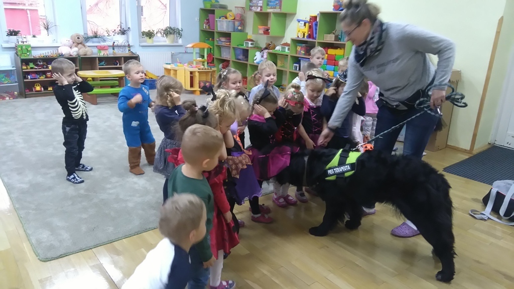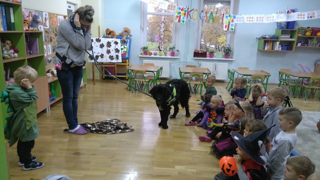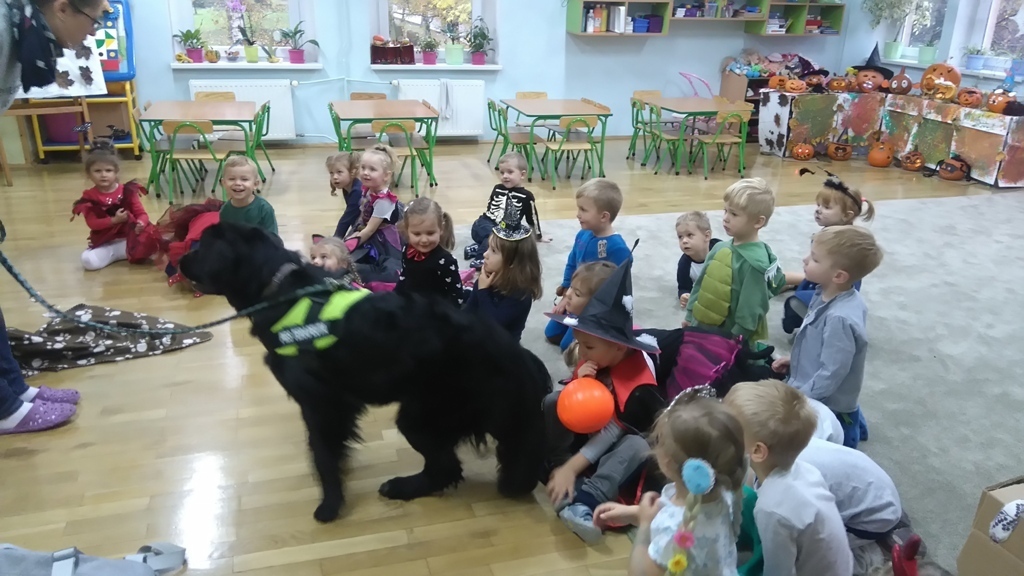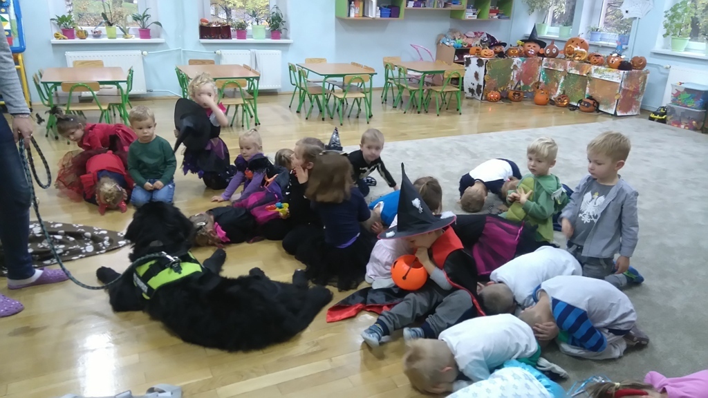 Kiedy nasza zabawa trwała odwiedziła nas Lenka z panią Martą. Dziewczyny zaprezentowały jak chronić się przed obcym psem,kiedy nas atakuje. Jaka postawa jest prawidłowa, żeby nie stała się nam krzywda. Po wysłuchaniu wskazówek wszyscy wspólnie ćwiczyliśmy pozycję bezpieczną i zrobiliśmy sobie wspólne zdjęcie, bo to był pierwszy w życiu Lenki bal halloweenowy.