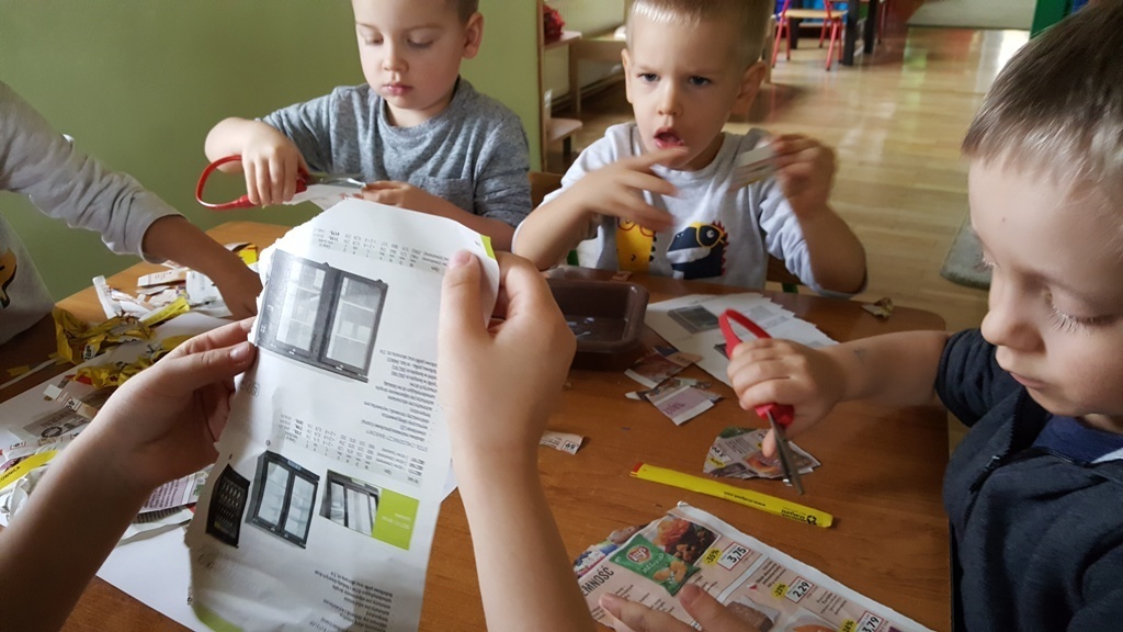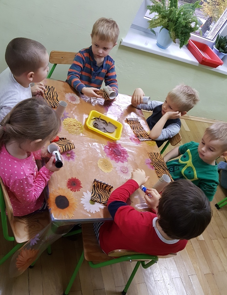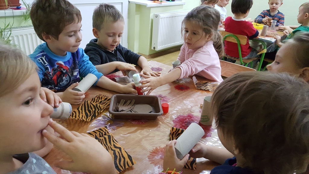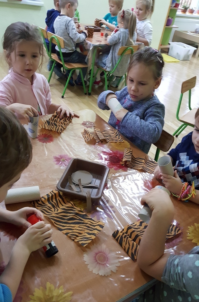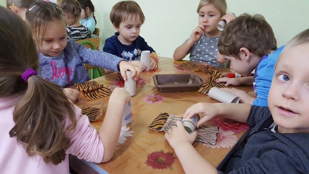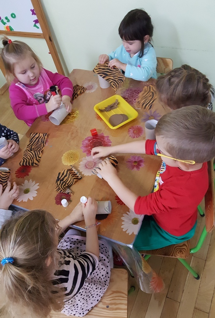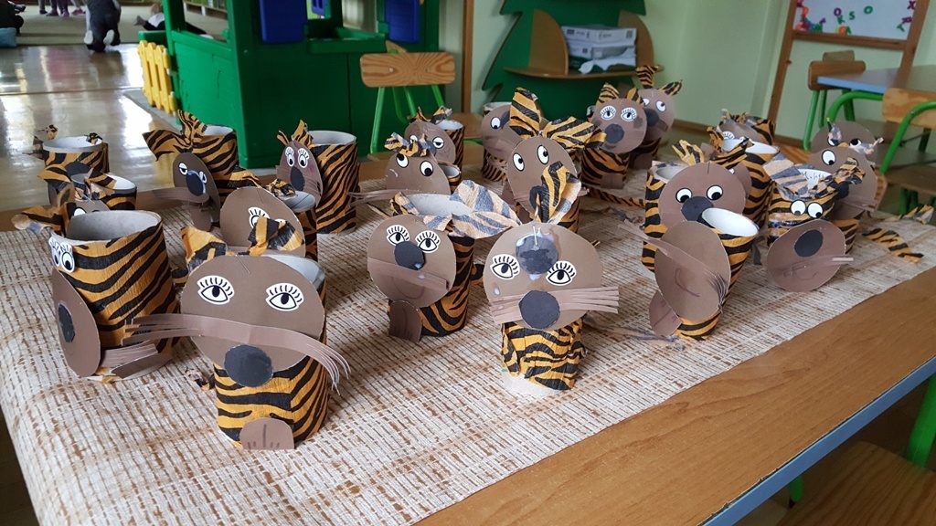 W ramach walki z nudą i dla wyćwiczenia paluszków nasz grupa korzystając z ogólnodostępnych metod takich jak: plastelina, bibułą kolorowa, tektura, sznurek, gazety, rolki po papierze toaletowym itp. wykonywała prace plastyczno - techniczne. Efektem naszych starań była cała kolekcja przeróżnych papierowych zwierząt, z której stworzyliśmy galerię dla rodziców. Była to dla nas dobra zabawa i dowiedzieliśmy się , że wcale nie trzeba kupować drogich zabawek w sklepie tylko można je zrobić samemu właściwie z niczego.