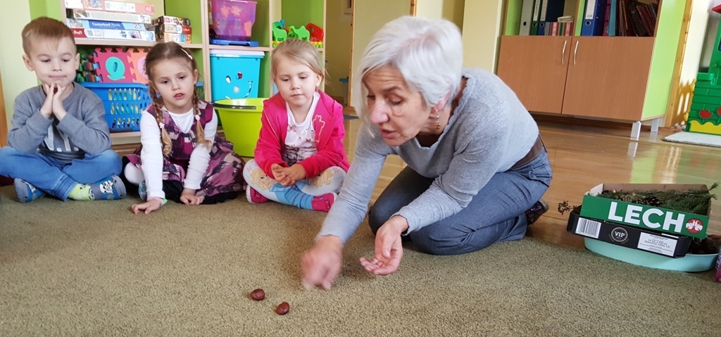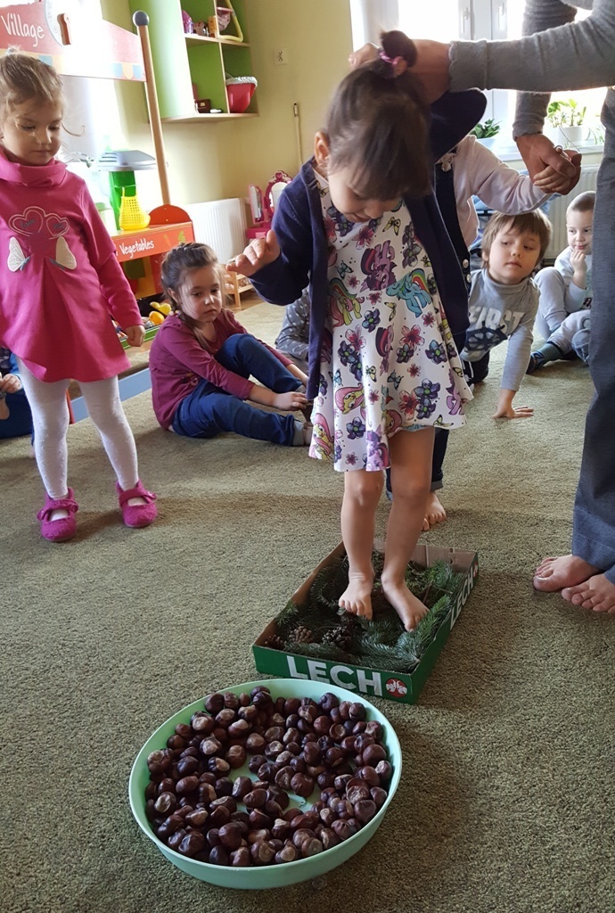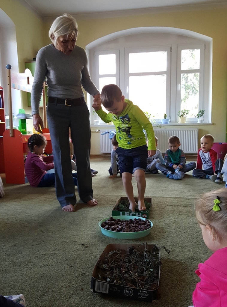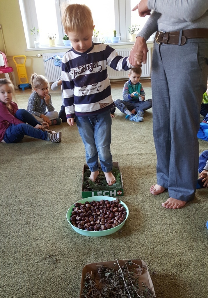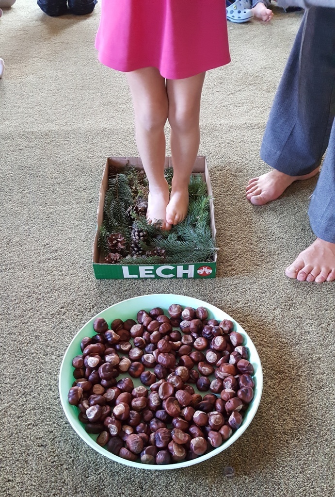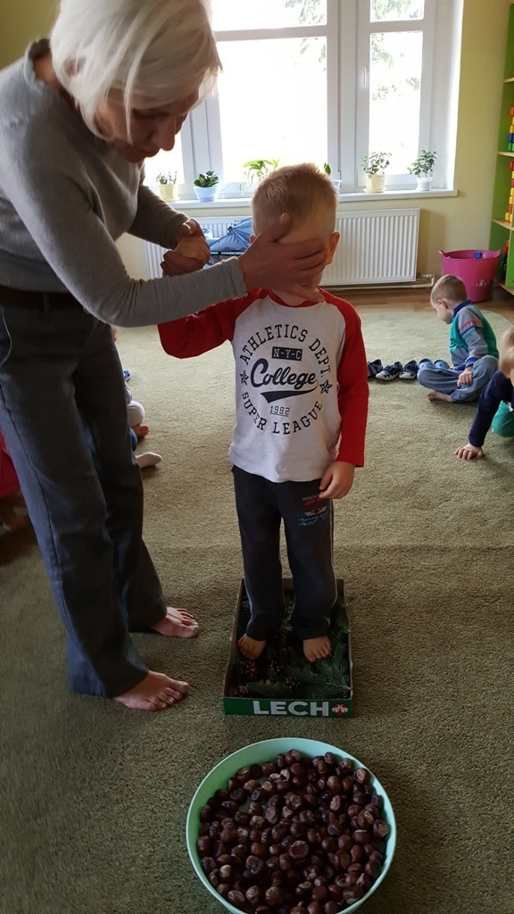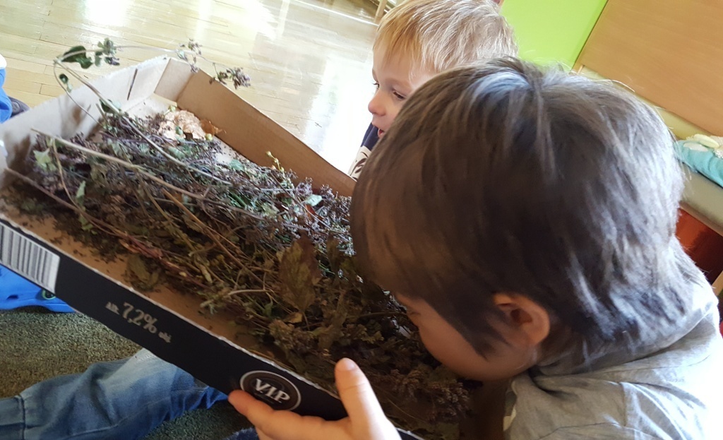 Ćwiczyliśmy dziś nasze zmysły. Wzrokiem, węchem, dotykiem i zapachem poznaliśmy pojemność niezwykłych kufrów, których zawartość stanowiły: kasztany, szyszki, mech, gałązki drzew iglastych, przeróżne zioła zebrane na łące późnym latem. Wszystkie te skarby znalazły się w przedszkolu dzięki naszej Pani psycholog. Zgadywanie samym dotykiem, węchem co znajduje się w danym pudle wcale nie jest takie proste jak mogłoby się wydawać. Było przy tym mnóstwo śmiechu, zabawnych sytuacji i zaskakujących rozwiązań. Wiemy już dlaczego natura wyposażyła człowieka w cztery zmysły. Samym tylko dotykiem trudno odróżnić jarzębinki od jadalnych jagód, a szyszki pod kory drzewa.