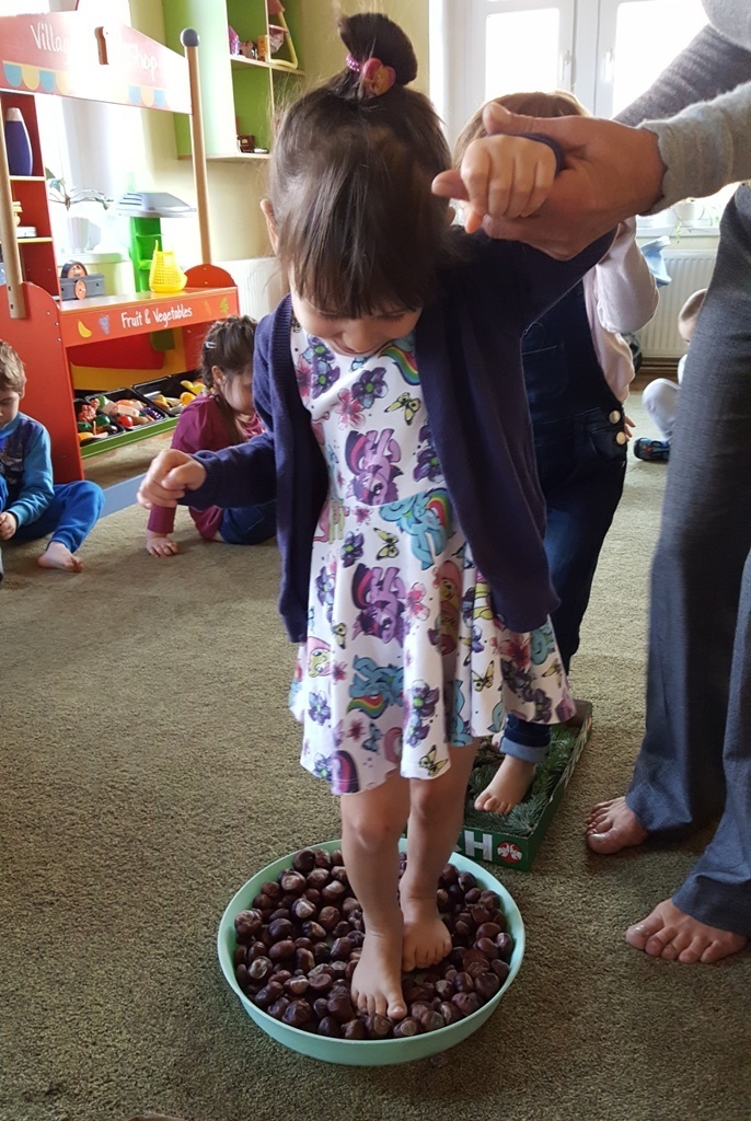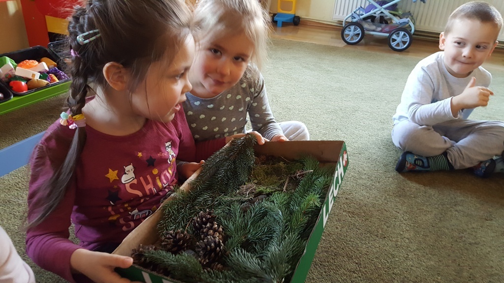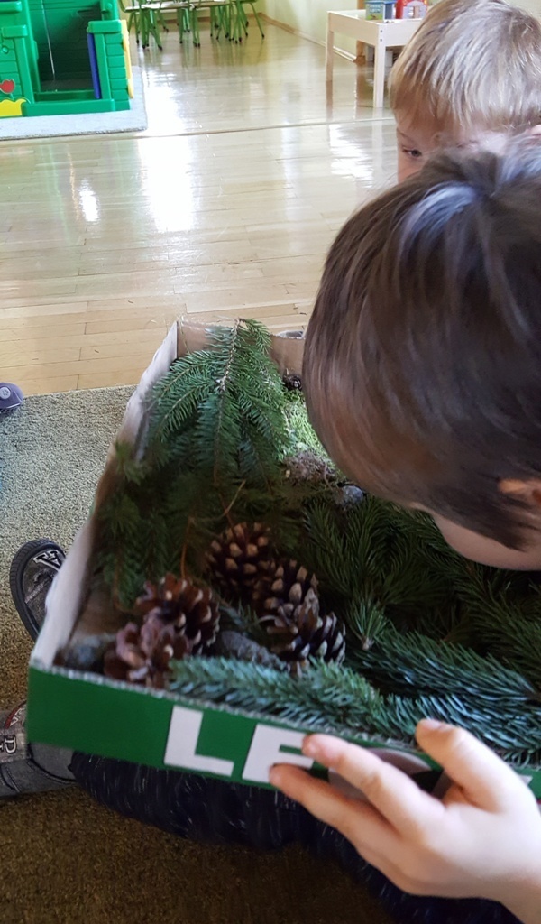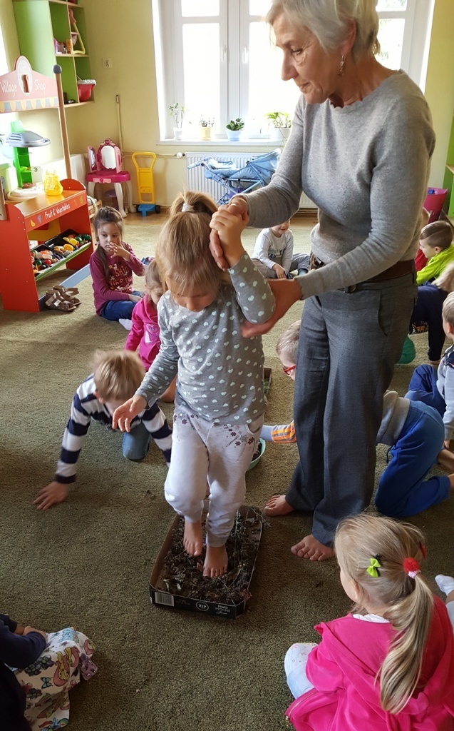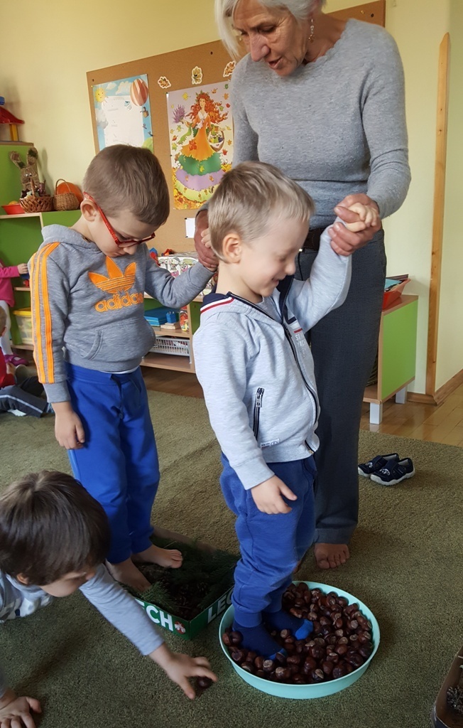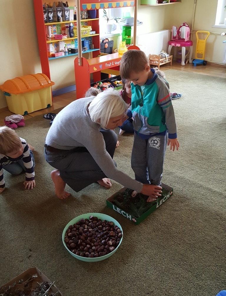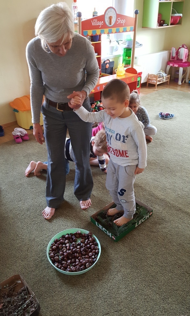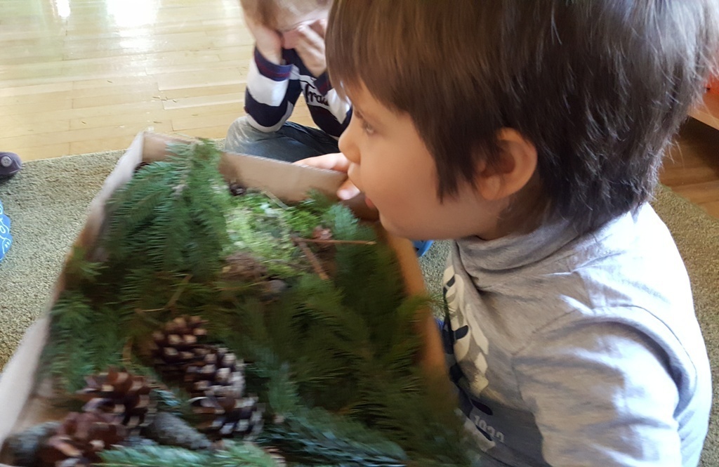 Ćwiczyliśmy dziś nasze zmysły. Wzrokiem, węchem, dotykiem i zapachem poznaliśmy pojemność niezwykłych kufrów, których zawartość stanowiły: kasztany, szyszki, mech, gałązki drzew iglastych, przeróżne zioła zebrane na łące późnym latem. Wszystkie te skarby znalazły się w przedszkolu dzięki naszej Pani psycholog. Zgadywanie samym dotykiem, węchem co znajduje się w danym pudle wcale nie jest takie proste jak mogłoby się wydawać. Było przy tym mnóstwo śmiechu, zabawnych sytuacji i zaskakujących rozwiązań. Wiemy już dlaczego natura wyposażyła człowieka w cztery zmysły. Samym tylko dotykiem trudno odróżnić jarzębinki od jadalnych jagód, a szyszki pod kory drzewa.