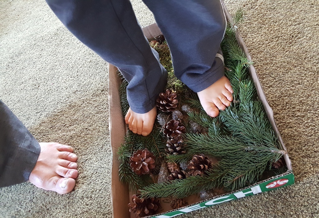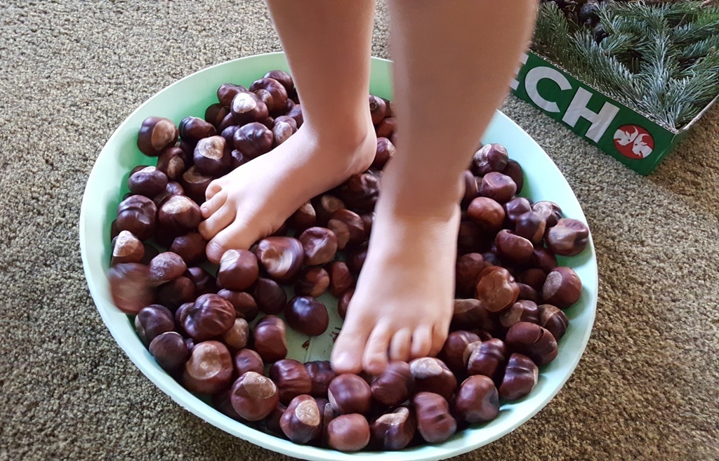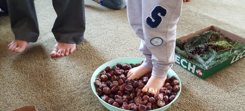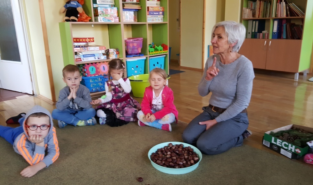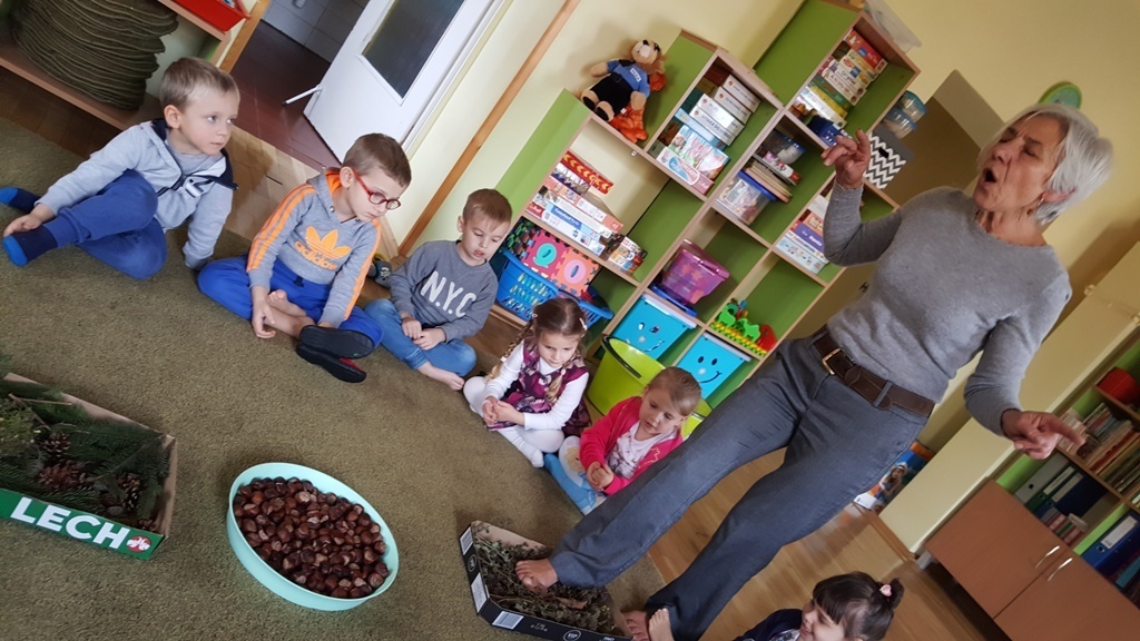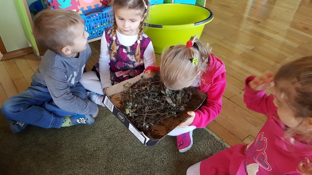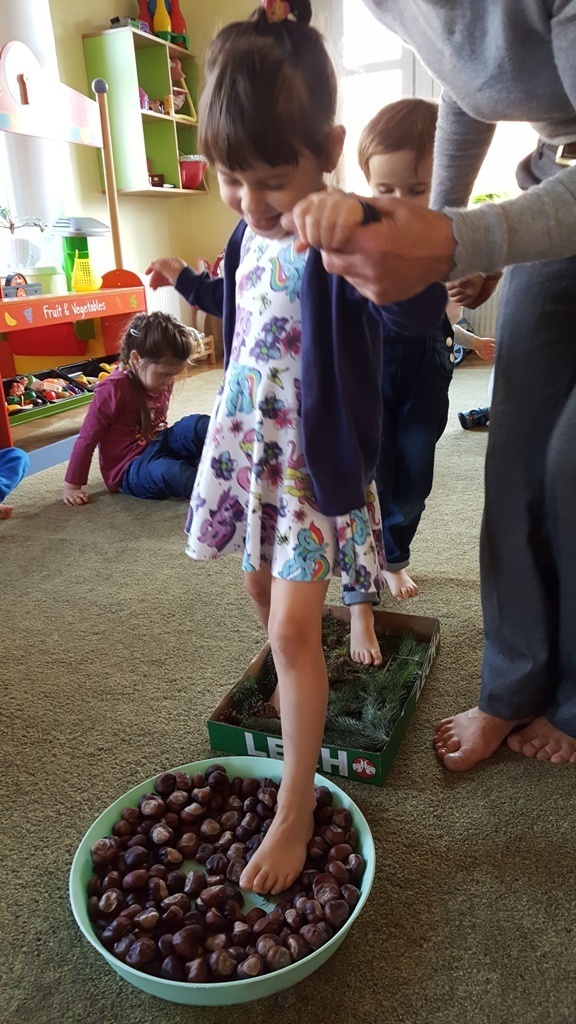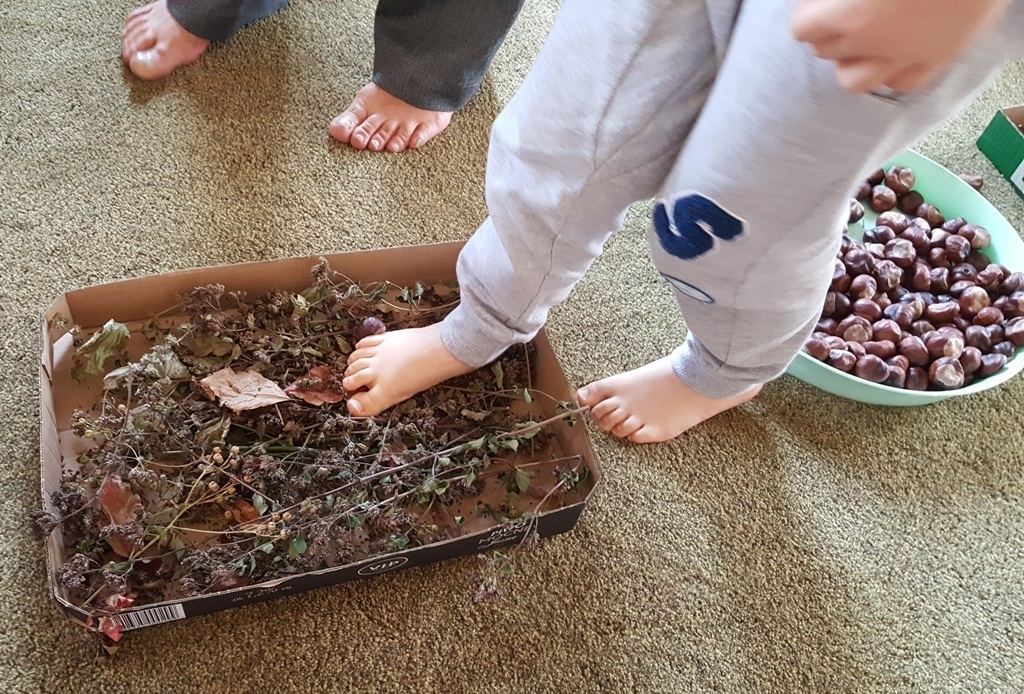 Ćwiczyliśmy dziś nasze zmysły. Wzrokiem, węchem, dotykiem i zapachem poznaliśmy pojemność niezwykłych kufrów, których zawartość stanowiły: kasztany, szyszki, mech, gałązki drzew iglastych, przeróżne zioła zebrane na łące późnym latem. Wszystkie te skarby znalazły się w przedszkolu dzięki naszej Pani psycholog. Zgadywanie samym dotykiem, węchem co znajduje się w danym pudle wcale nie jest takie proste jak mogłoby się wydawać. Było przy tym mnóstwo śmiechu, zabawnych sytuacji i zaskakujących rozwiązań. Wiemy już dlaczego natura wyposażyła człowieka w cztery zmysły. Samym tylko dotykiem trudno odróżnić jarzębinki od jadalnych jagód, a szyszki pod kory drzewa.
