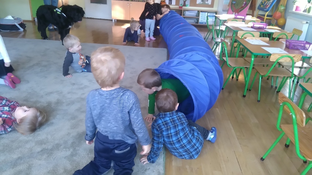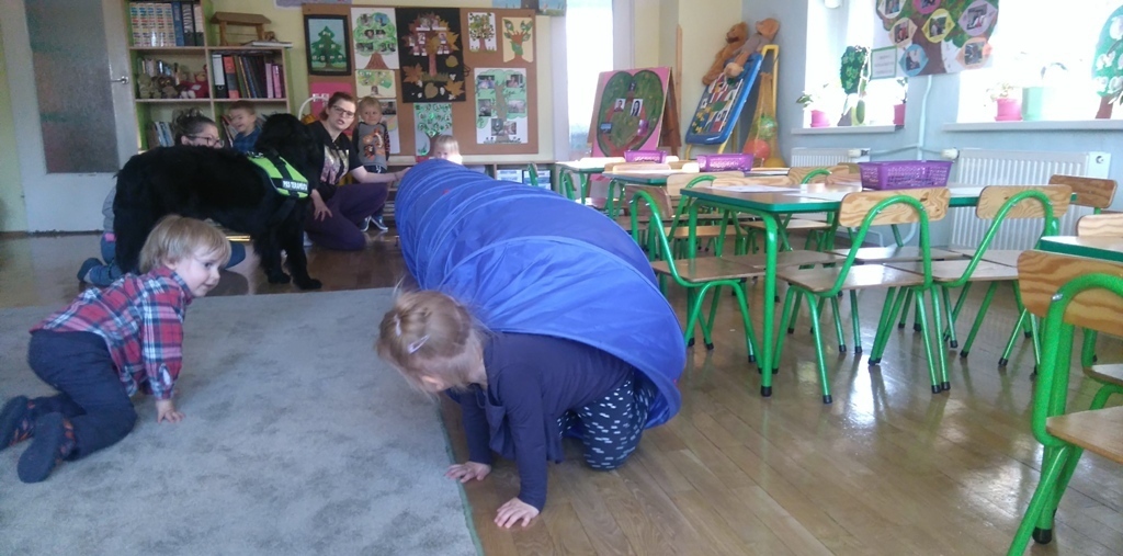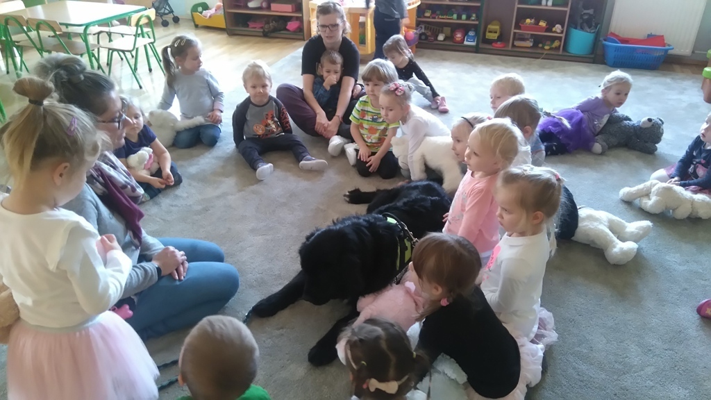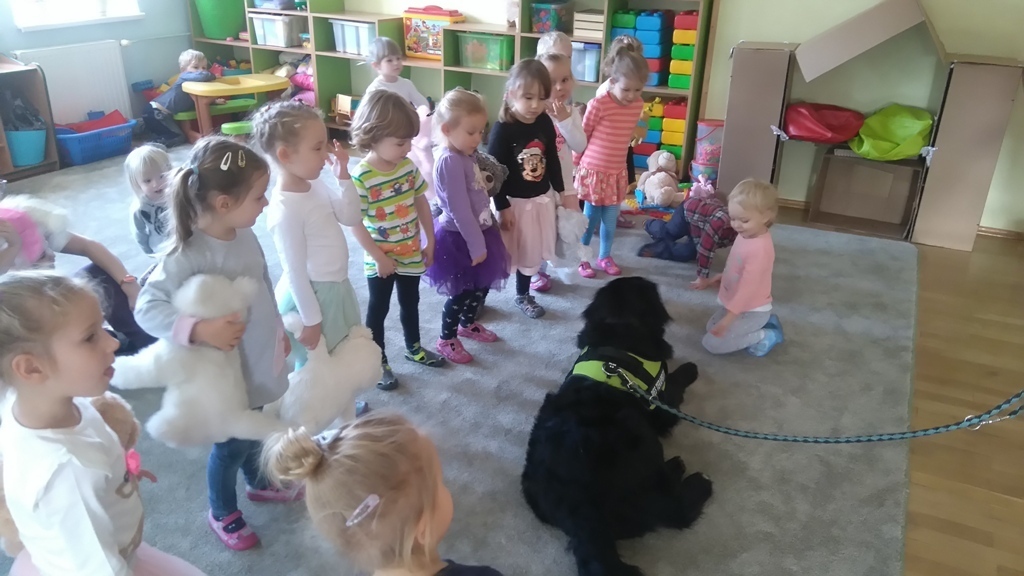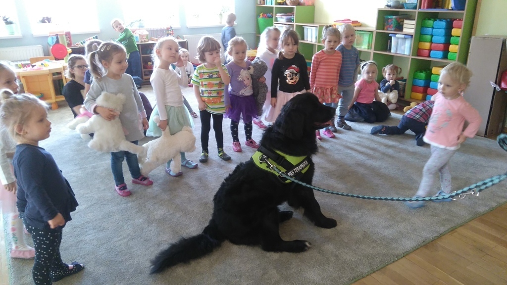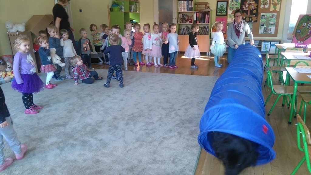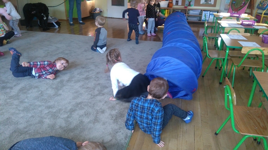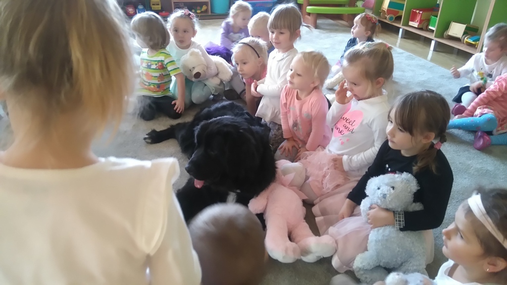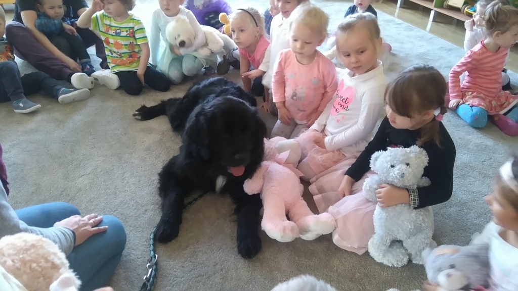Lenka, ulubiony przez wszystkie dzieci nowofundland zawitał dziś w nasze progi. Dwie najmłodsze grupy przywitały psa z wielką radością. Jego opiekunka przypomniała maluchom zasady właściwego zachowania się w czasie ich wizyty. Dzieci dowiedziały się też jakie sporty można uprawiać z psami oraz niektóre ich ulubione zabawy. Lenka zaprezentowała swoje ulubione zajecie - bieganie przez długi tunel. Grupy Smerfów, Kociaków z olbrzymią frajdą przemierzały tunel. Pani Marcie opiekunce Lenki dziękujemy za odwiedziny i czekamy już na następna wizytę.