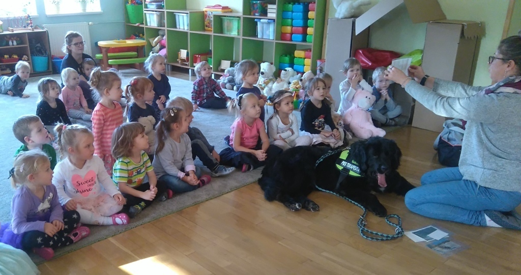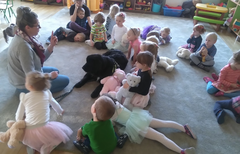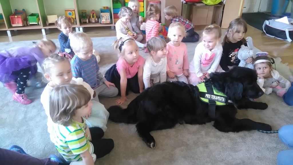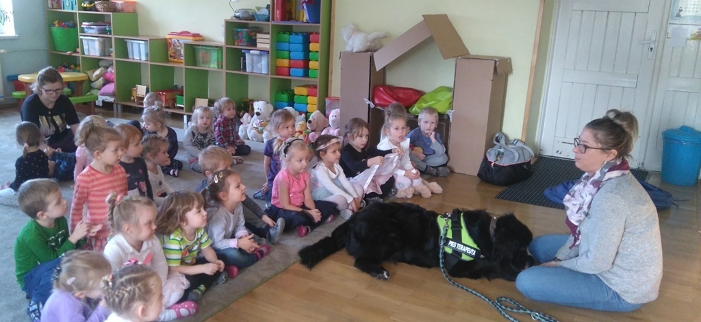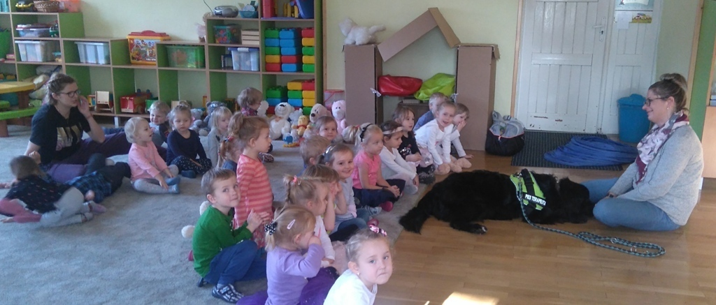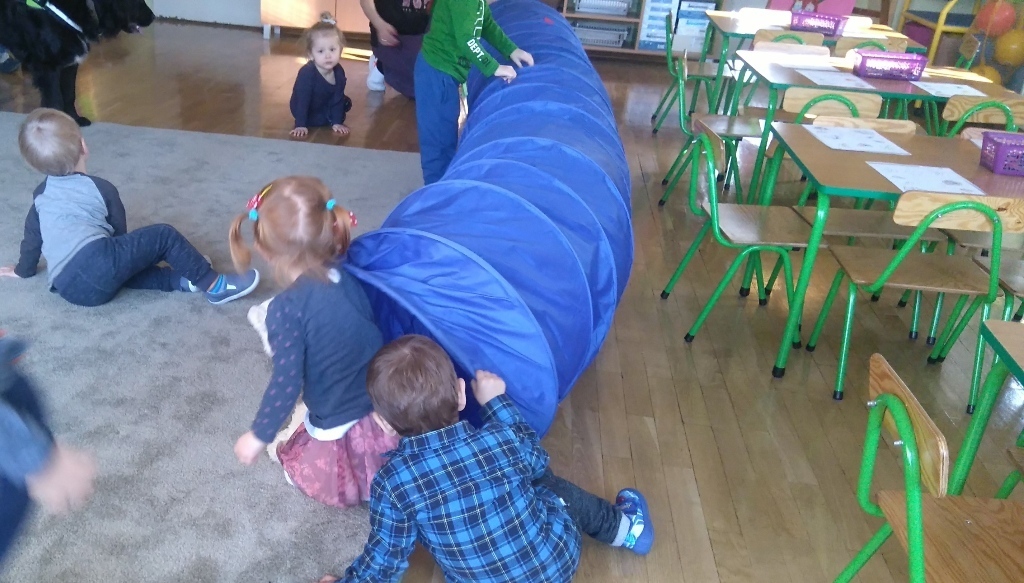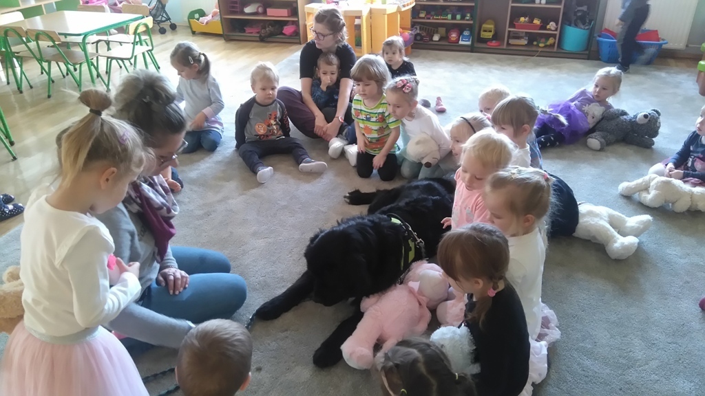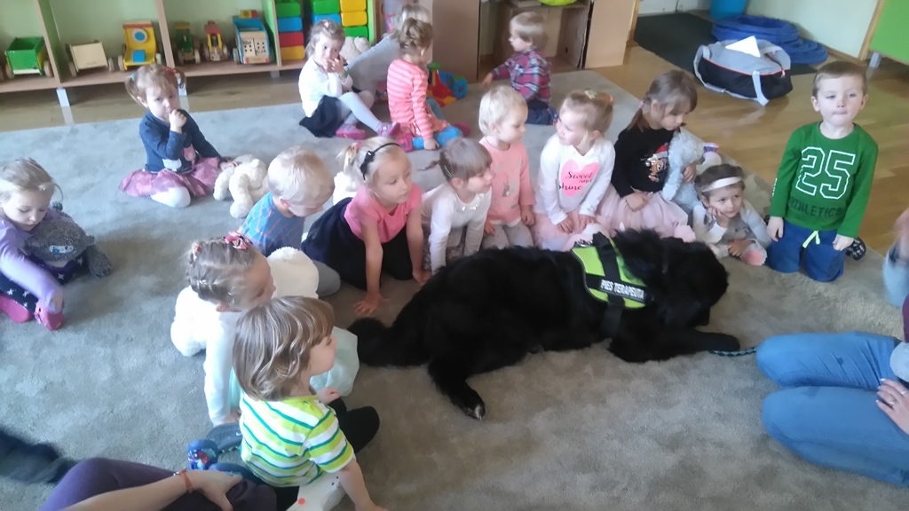 Lenka, ulubiony przez wszystkie dzieci nowofundland zawitał dziś w nasze progi. Dwie najmłodsze grupy przywitały psa z wielką radością. Jego opiekunka przypomniała maluchom zasady właściwego zachowania się w czasie ich wizyty. Dzieci dowiedziały się też jakie sporty można uprawiać z psami oraz niektóre ich ulubione zabawy. Lenka zaprezentowała swoje ulubione zajecie - bieganie przez długi tunel. Grupy Smerfów, Kociaków z olbrzymią frajdą przemierzały tunel. Pani Marcie opiekunce Lenki dziękujemy za odwiedziny i czekamy już na następna wizytę.