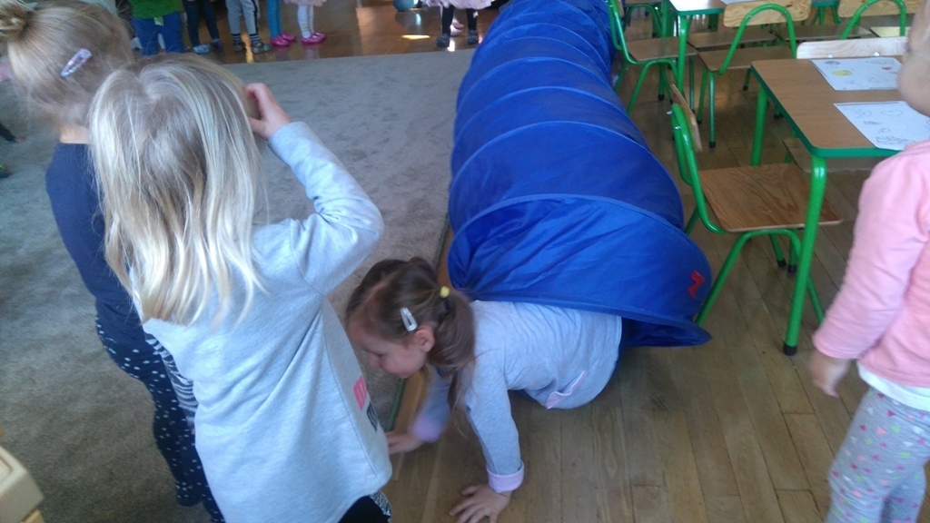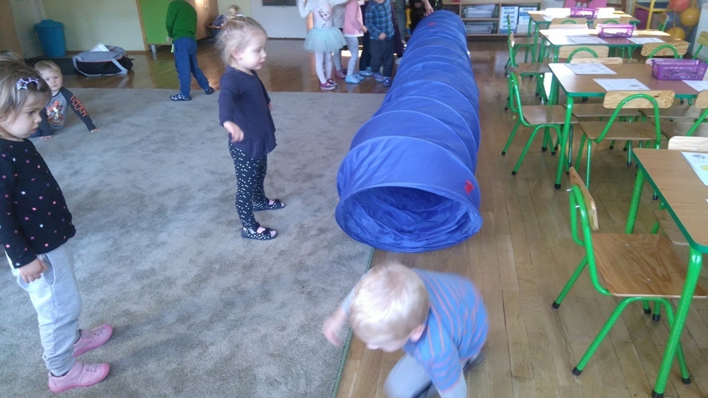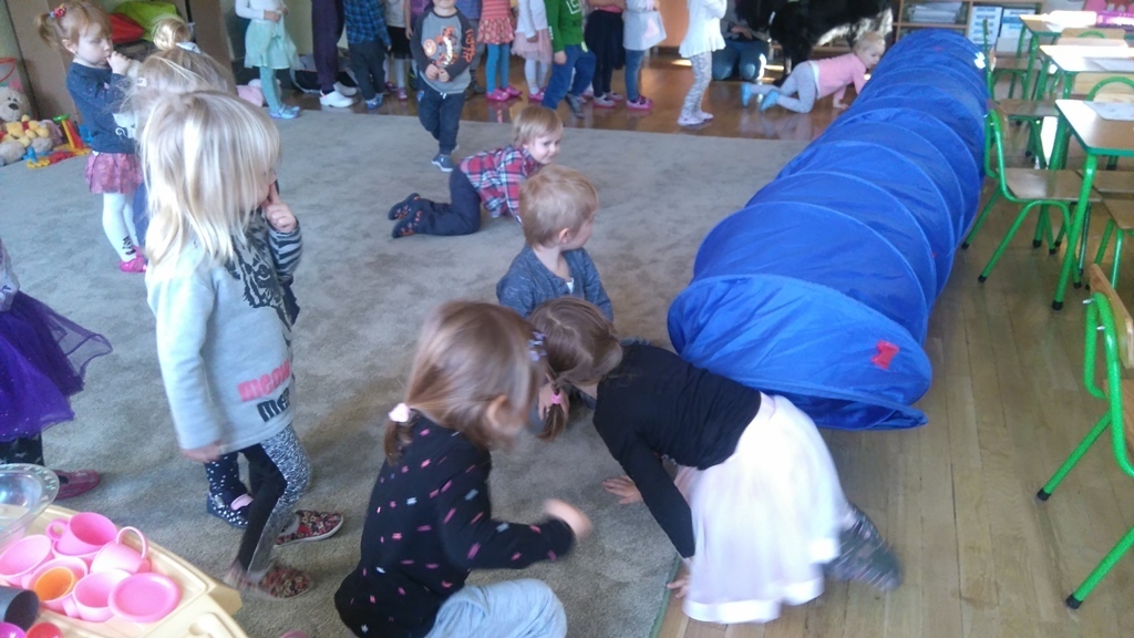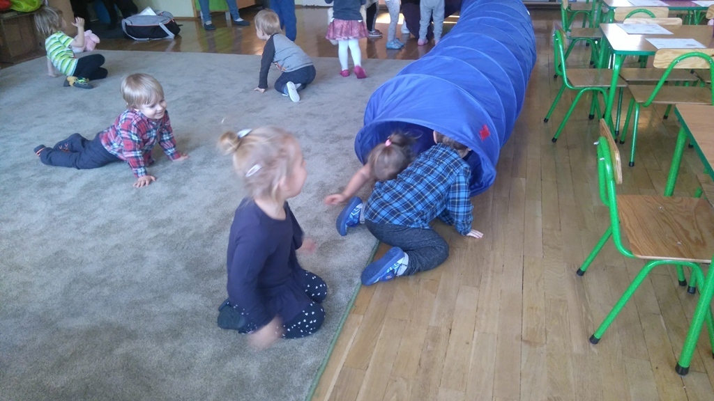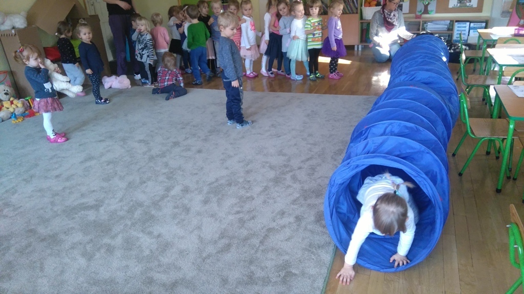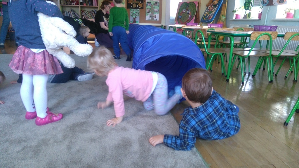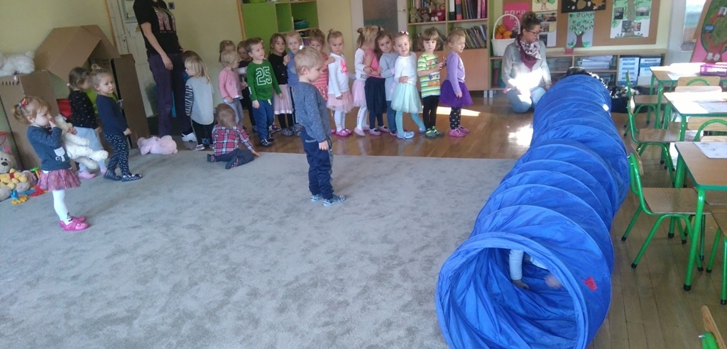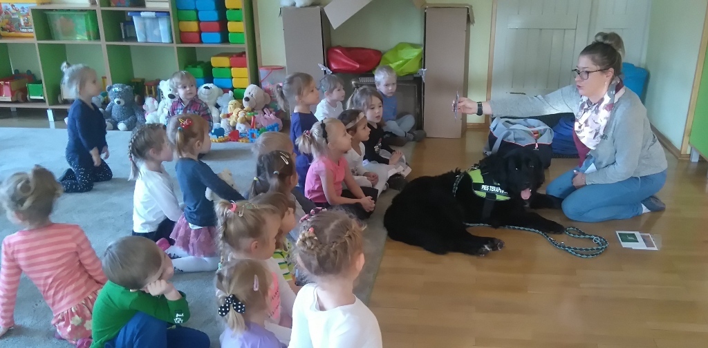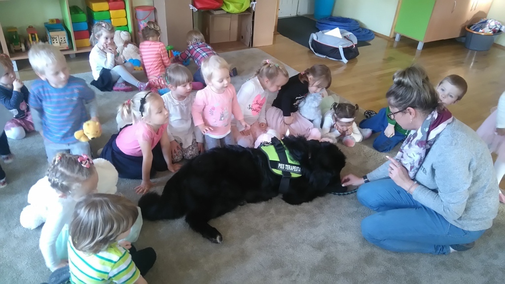 Lenka, ulubiony przez wszystkie dzieci nowofundland zawitał dziś w nasze progi. Dwie najmłodsze grupy przywitały psa z wielką radością. Jego opiekunka przypomniała maluchom zasady właściwego zachowania się w czasie ich wizyty. Dzieci dowiedziały się też jakie sporty można uprawiać z psami oraz niektóre ich ulubione zabawy. Lenka zaprezentowała swoje ulubione zajecie - bieganie przez długi tunel. Grupy Smerfów, Kociaków z olbrzymią frajdą przemierzały tunel. Pani Marcie opiekunce Lenki dziękujemy za odwiedziny i czekamy już na następna wizytę.
