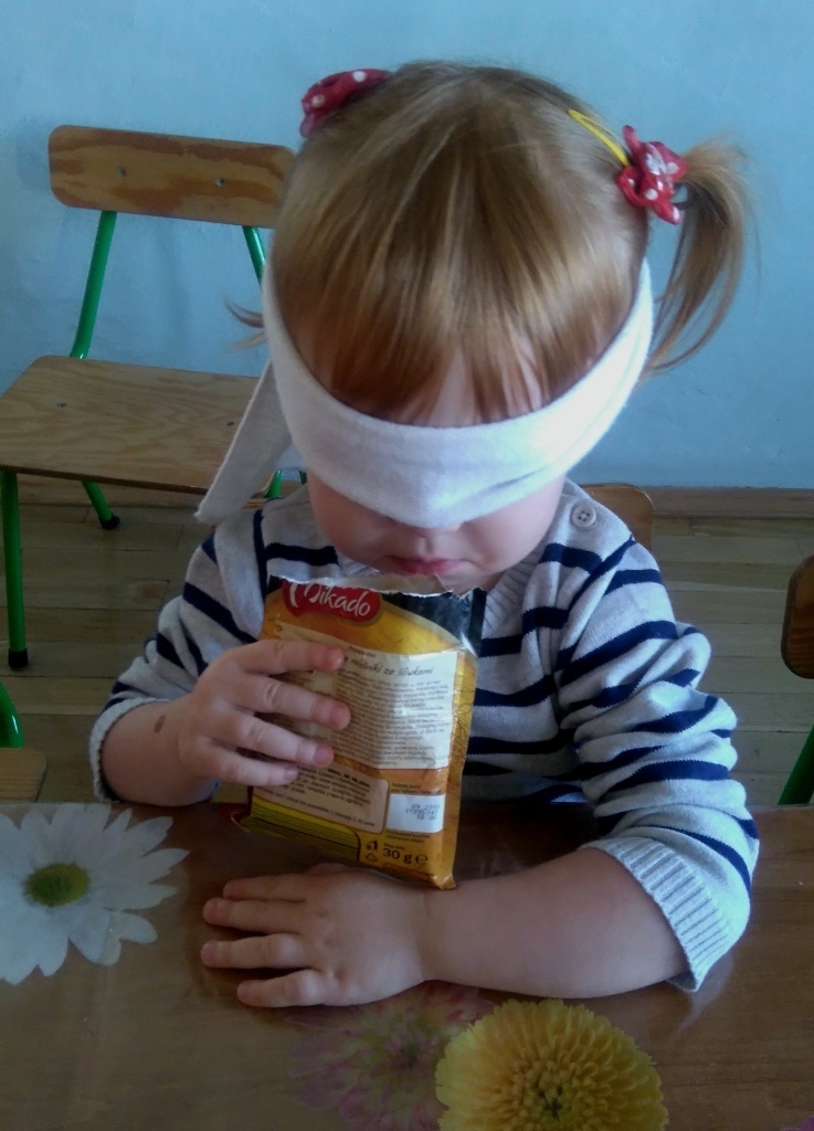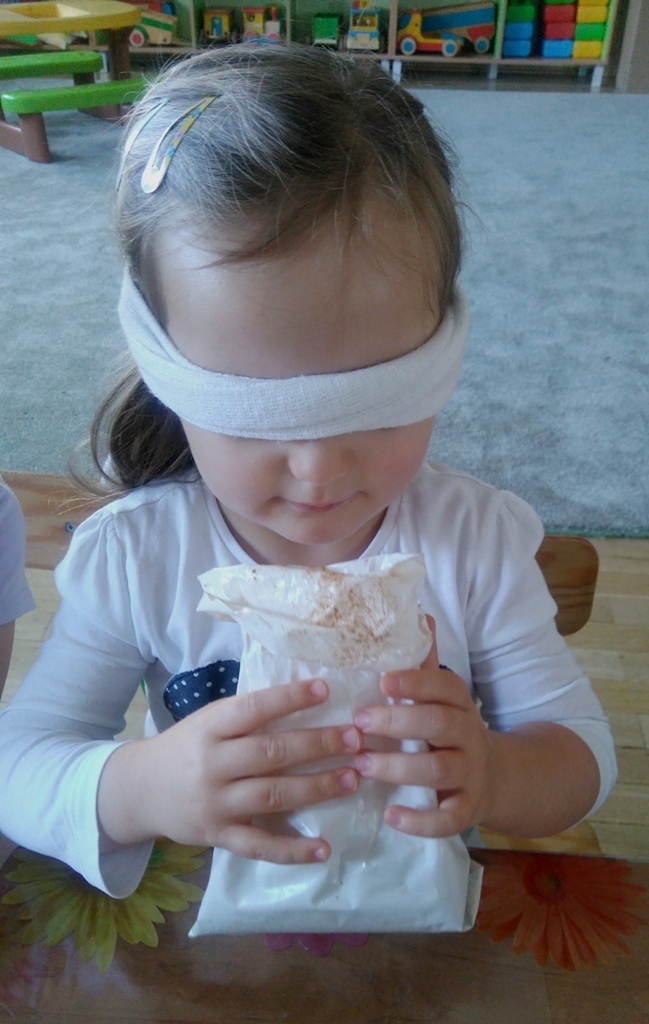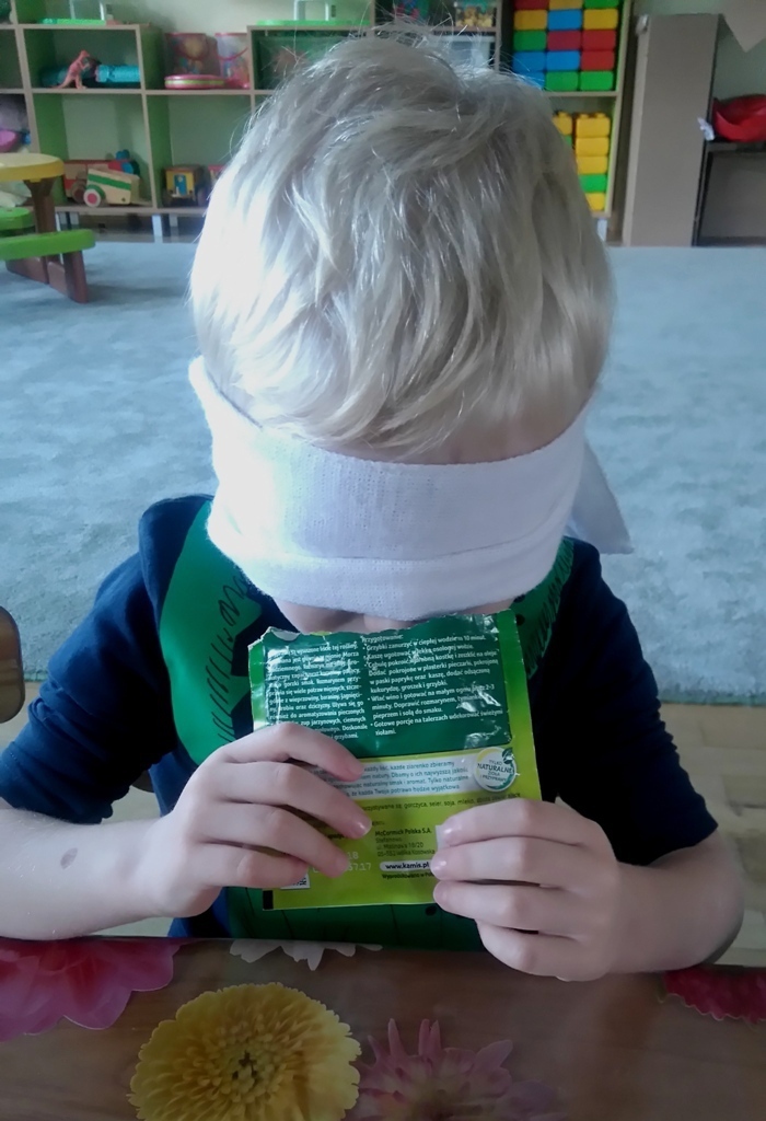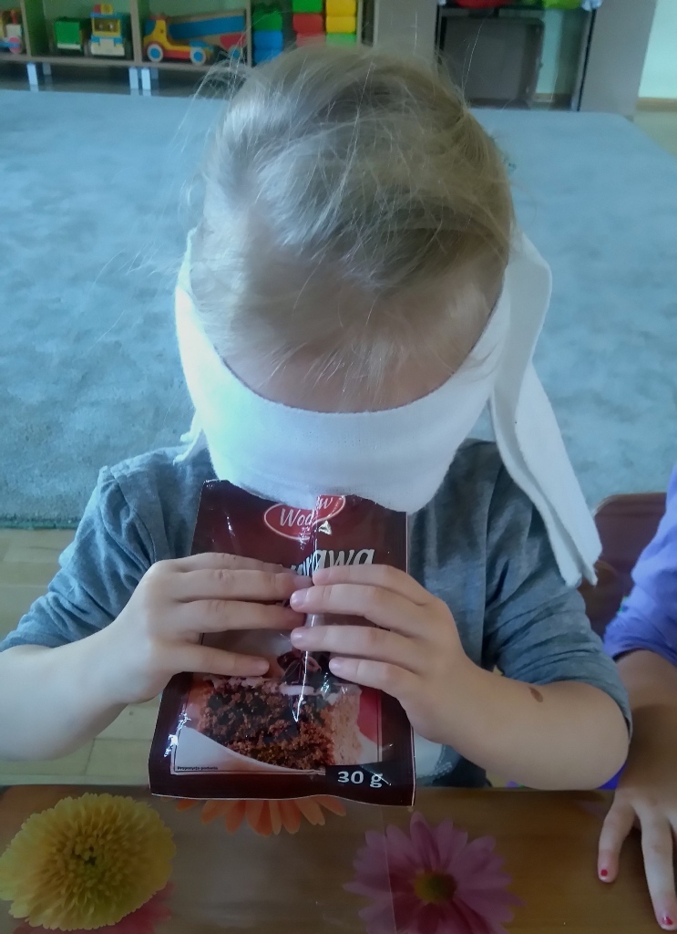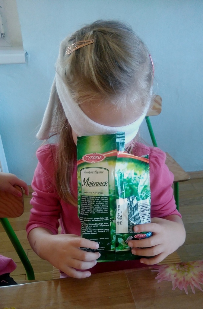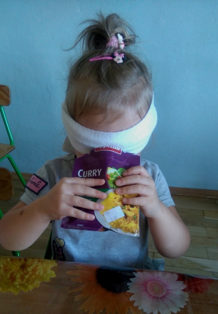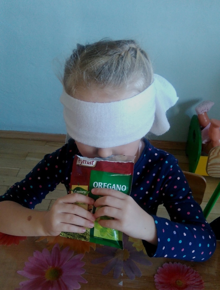 Rozpoczęliśmy zajęcia mając zawiązane oczy. Wąchaliśmy i rozpoznawaliśmy różne przyprawy do gotowania i pieczenia. Nasze zadanie polegało na rozpoznaniu, czy jest ro dodatek do ciast, czy do mięs. Następnie smarowaliśmy klejem obrazek przedstawiający zwierzątko i posypywaliśmy go dowolnymi przyprawami. Na koniec zajęć wszyscy mogliśmy bawić się w kucharzy, doprawiać dania, dotykając i wąchając przypraw. Zabawa przyniosła element zaskoczenia, eksperymentu, pobudziła do działania zmysły zapachu, dotyku i smaku.