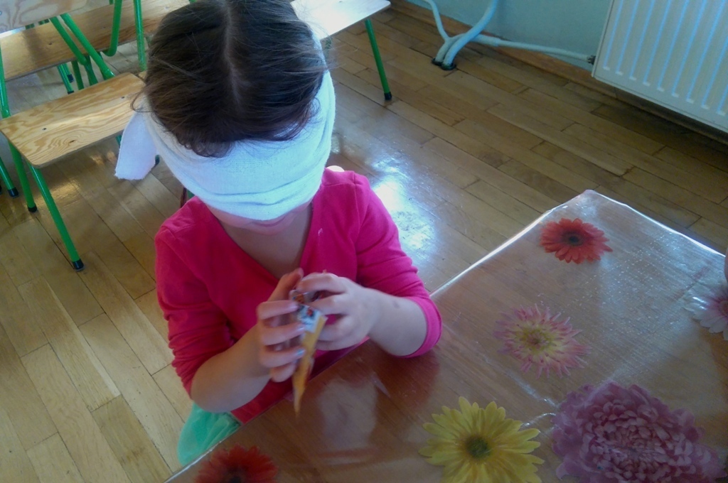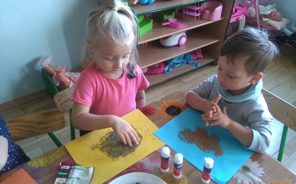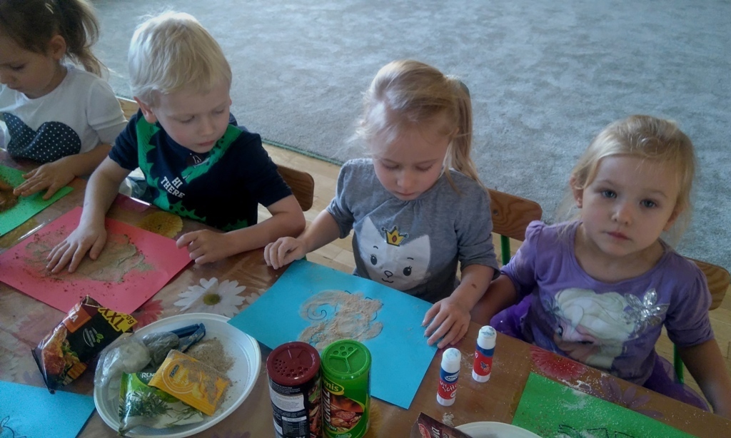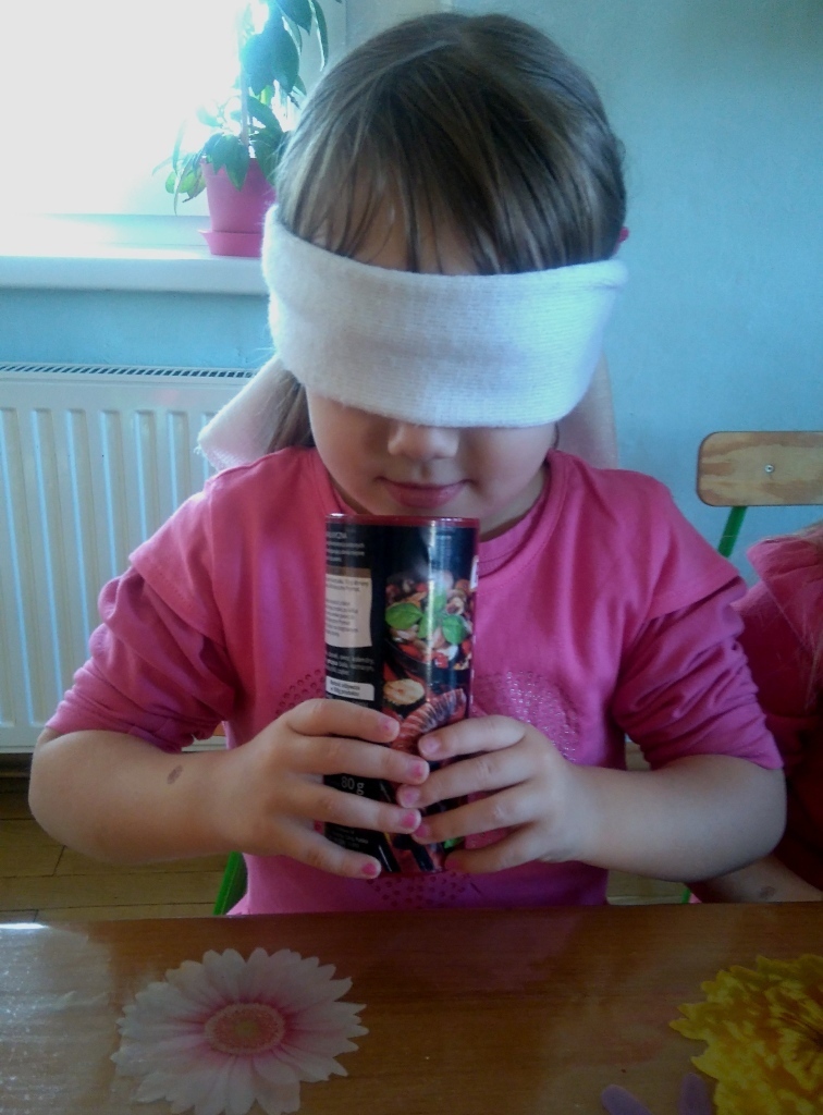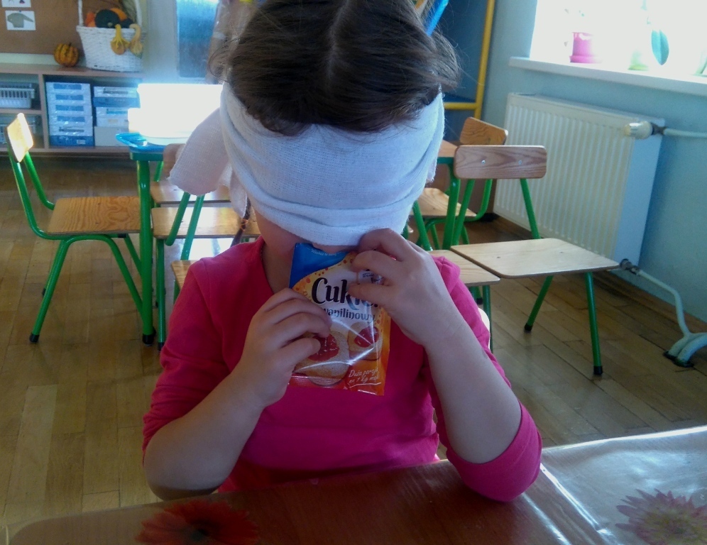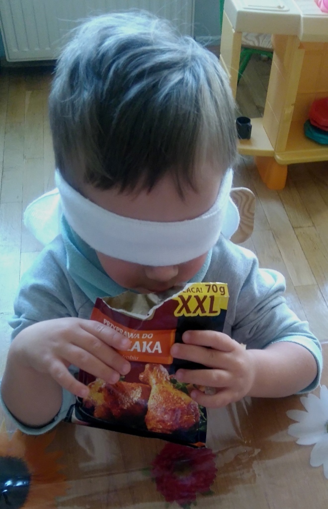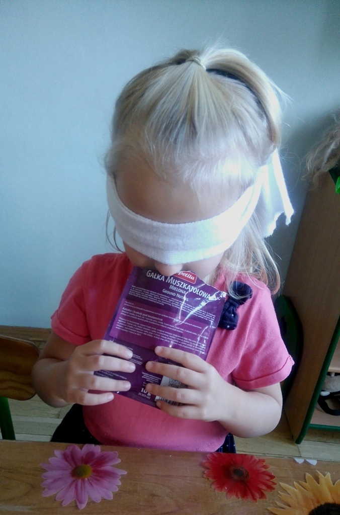 Rozpoczęliśmy zajęcia mając zawiązane oczy. Wąchaliśmy i rozpoznawaliśmy różne przyprawy do gotowania i pieczenia. Nasze zadanie polegało na rozpoznaniu, czy jest ro dodatek do ciast, czy do mięs. Następnie smarowaliśmy klejem obrazek przedstawiający zwierzątko i posypywaliśmy go dowolnymi przyprawami. Na koniec zajęć wszyscy mogliśmy bawić się w kucharzy, doprawiać dania, dotykając i wąchając przypraw. Zabawa przyniosła element zaskoczenia, eksperymentu, pobudziła do działania zmysły zapachu, dotyku i smaku.